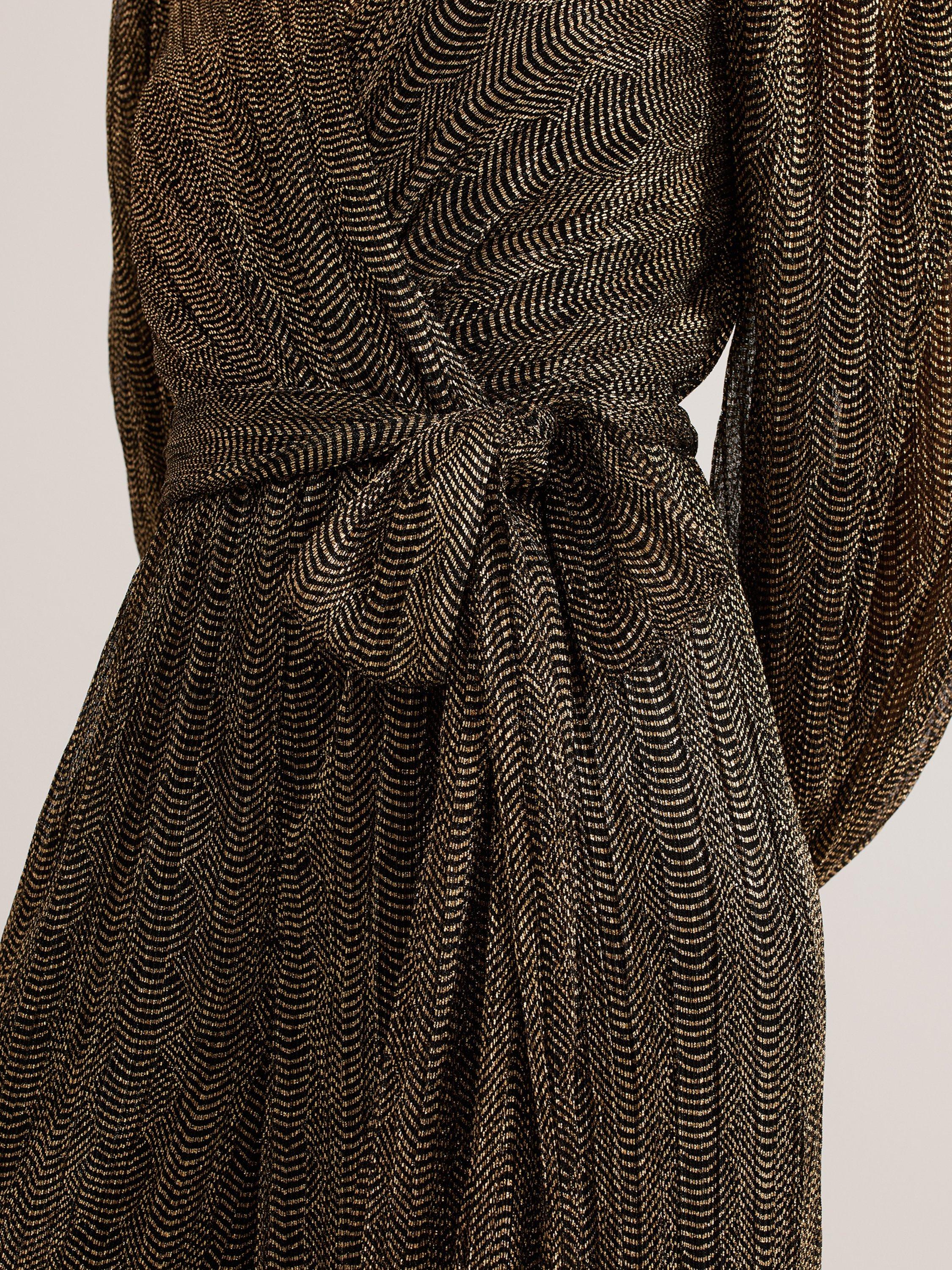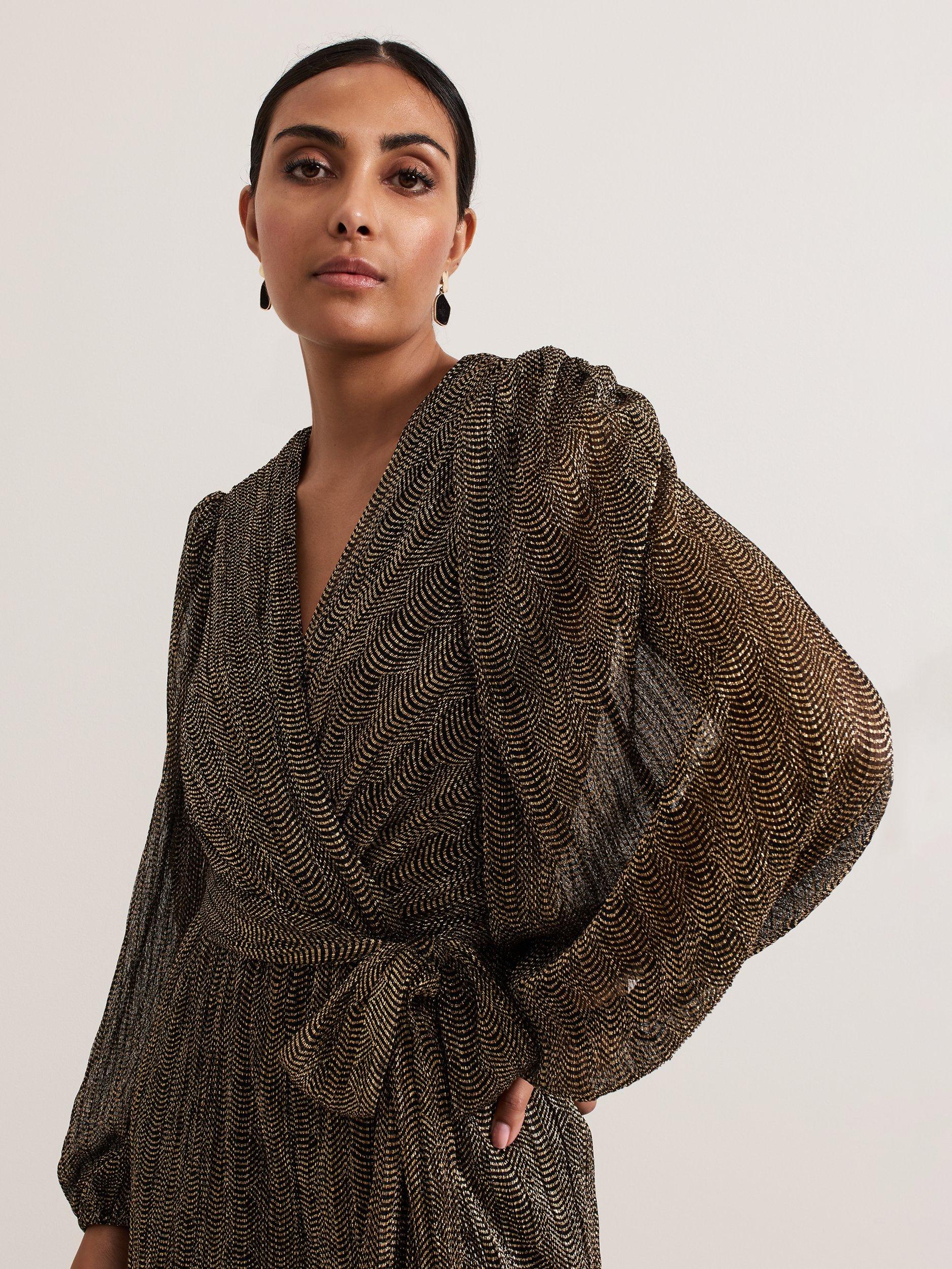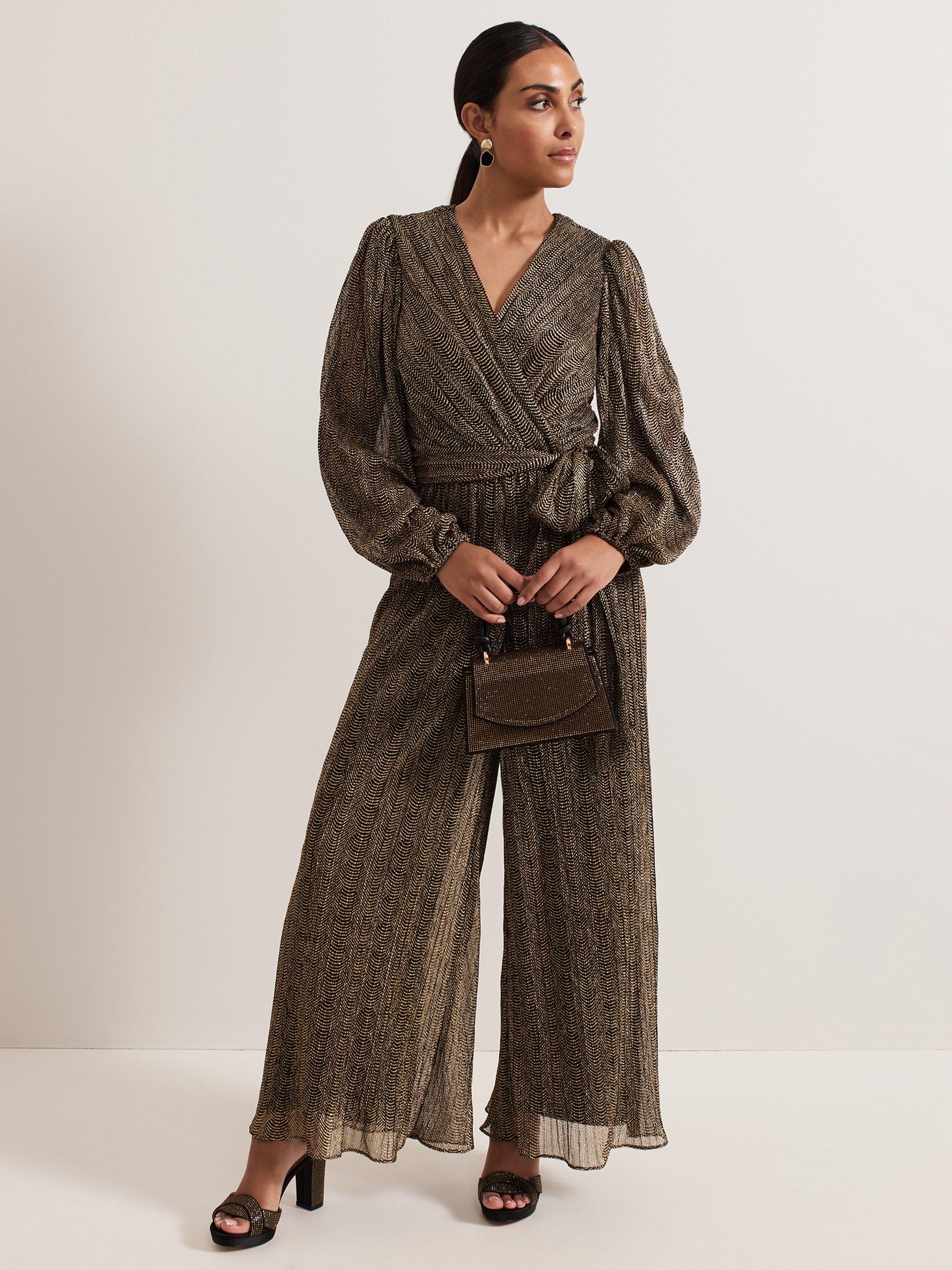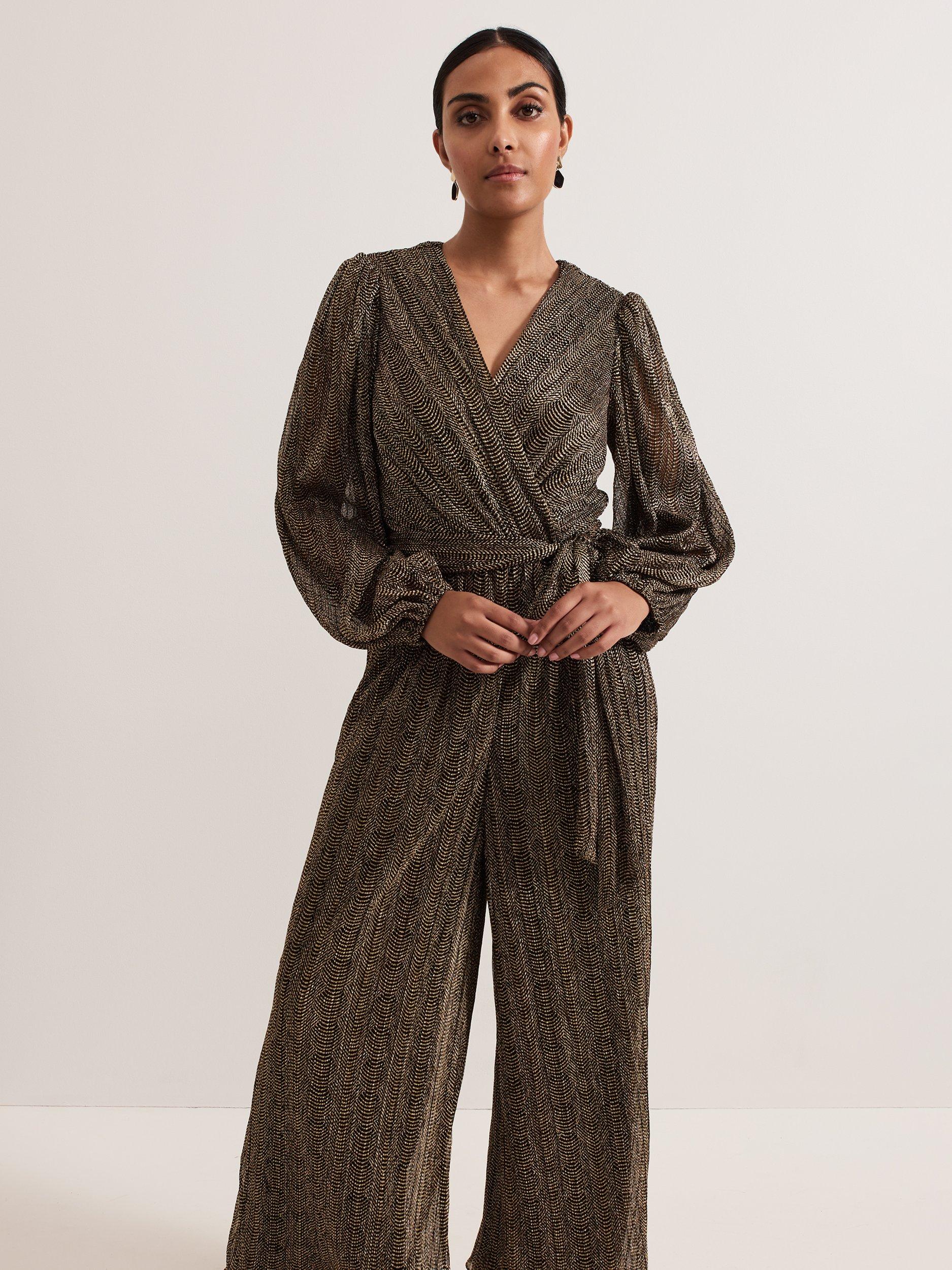 Phase Eight's Alli jumpsuit is sure to turn heads. Designed in a black and gold textured print, this jumpsuit features long semi-sheer blouson sleeves, a feminine V-neckline and falls to a flowing wide-leg silhouette. The faux wrap bodice and matching tie belt highlight the waist to create the perfect occasion style for dancing all night.