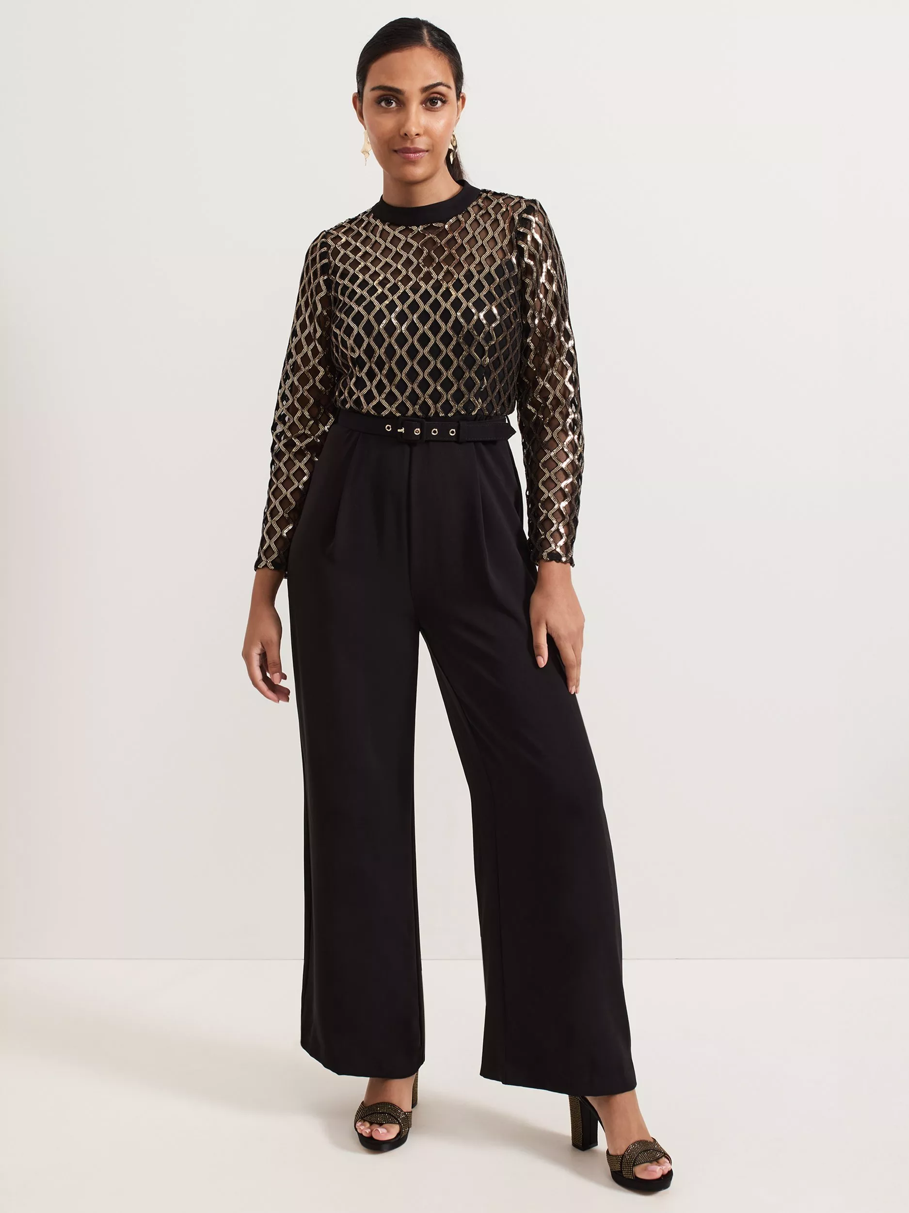 This petite jumpsuit is perfect for special occasions. The mesh top is elevated with a gold diamond print design, offering a shimmery contrast to the tailored wide-leg trousers. Complete with a matching belt to flatter the waist and keyhole detail at the back, style it with platform sandals and statement jewellery for a look that's ready for the dance floor.