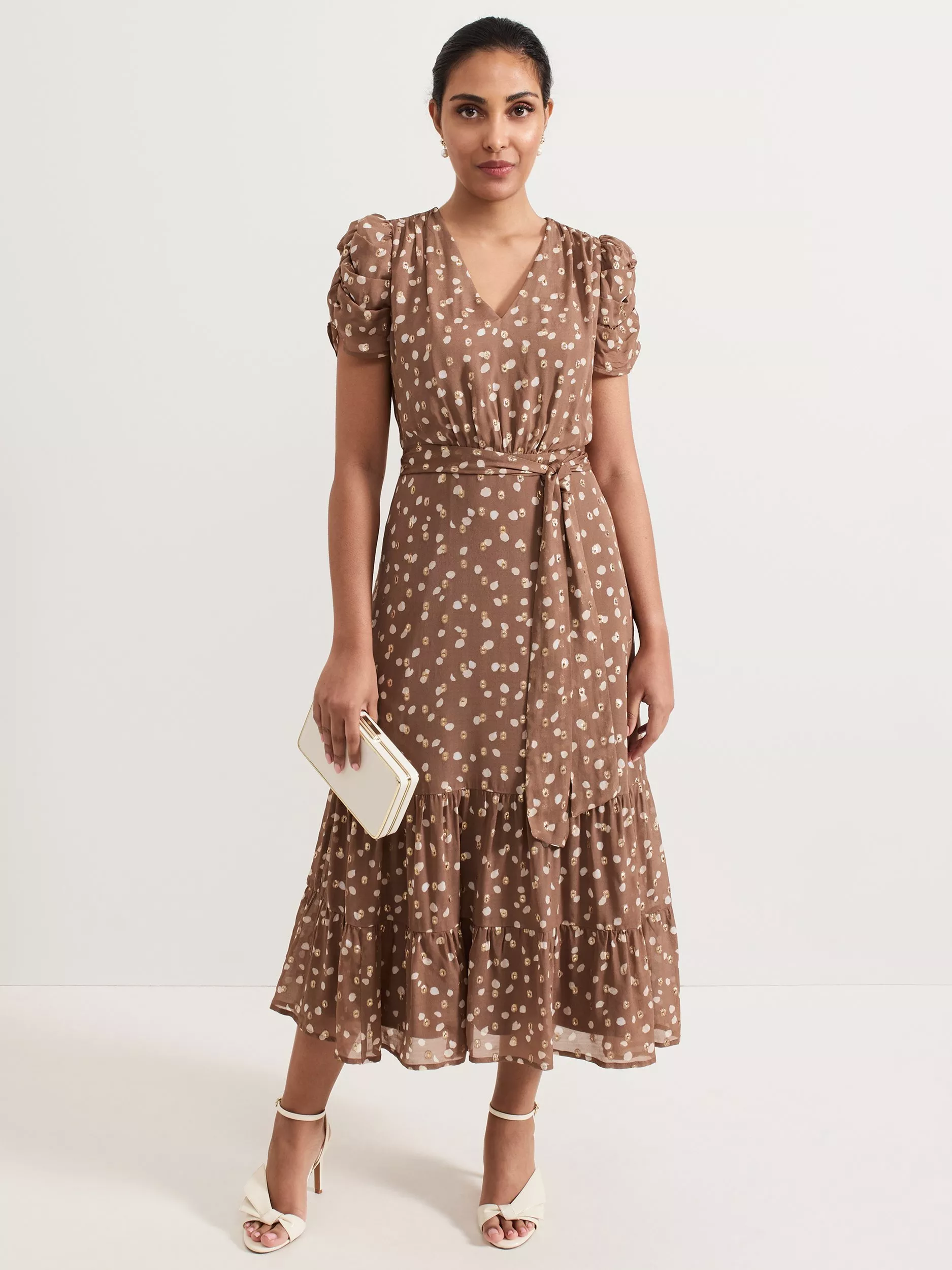 Polka dots never go out of style. In a subtle shade with spots, the Amy dress features intricate detailing. Ruching creates a gathered effect at the sleeves, falling to a midi length with an elegant tiered hem. Flecks of gold subtly catch the light as you move making it the perfect feminine style for all your upcoming events.