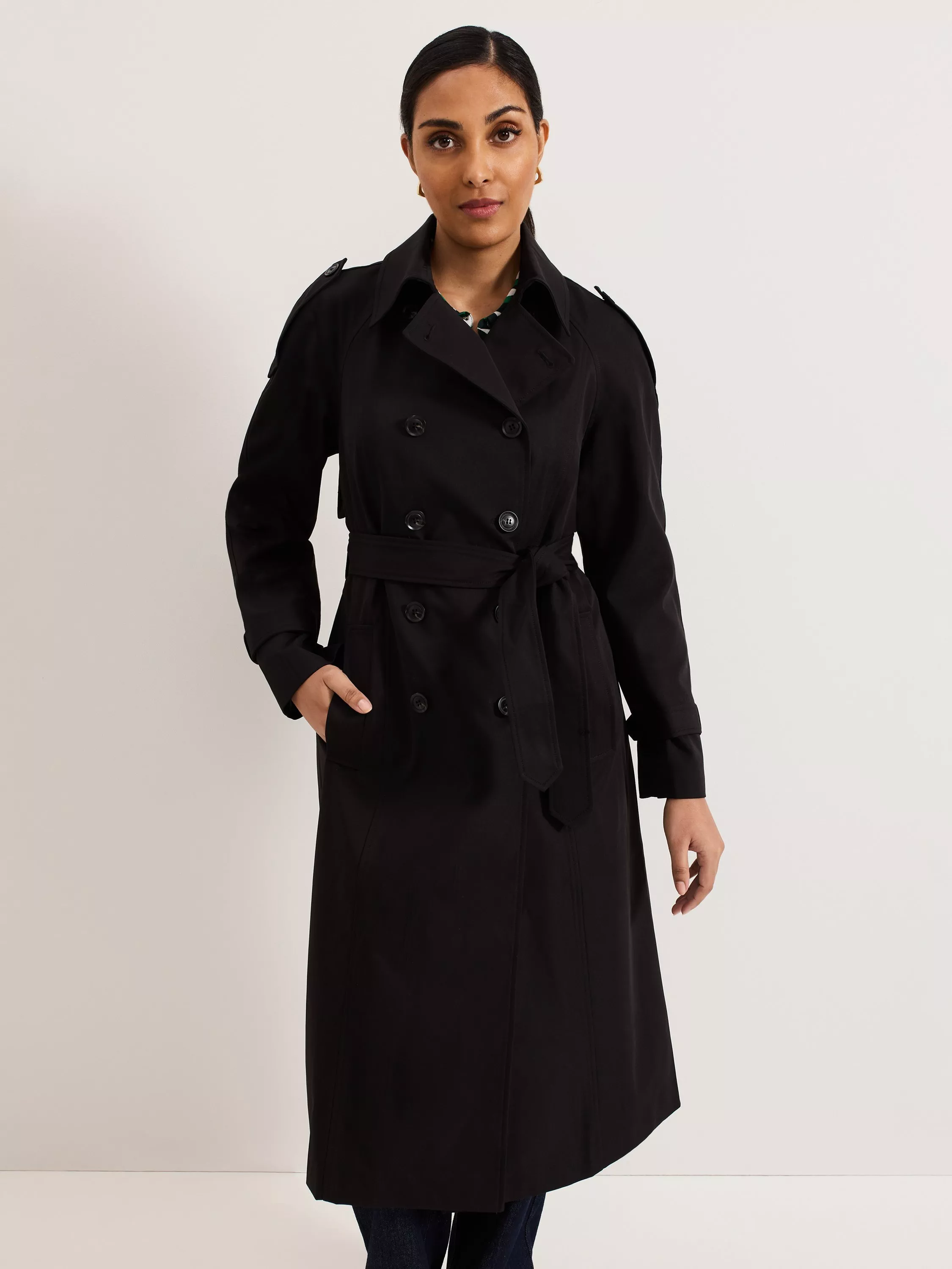 Meet the Avalie trench. This coat is designed to a tailored silhouette for a modern update while the back storm flap and adjustable cuffs nod to the classic trench features. Matching buttons decorate the double breasted bodice, finished with a tie belt to create a timeless showerproof style that will carry you through the seasons for years to come.