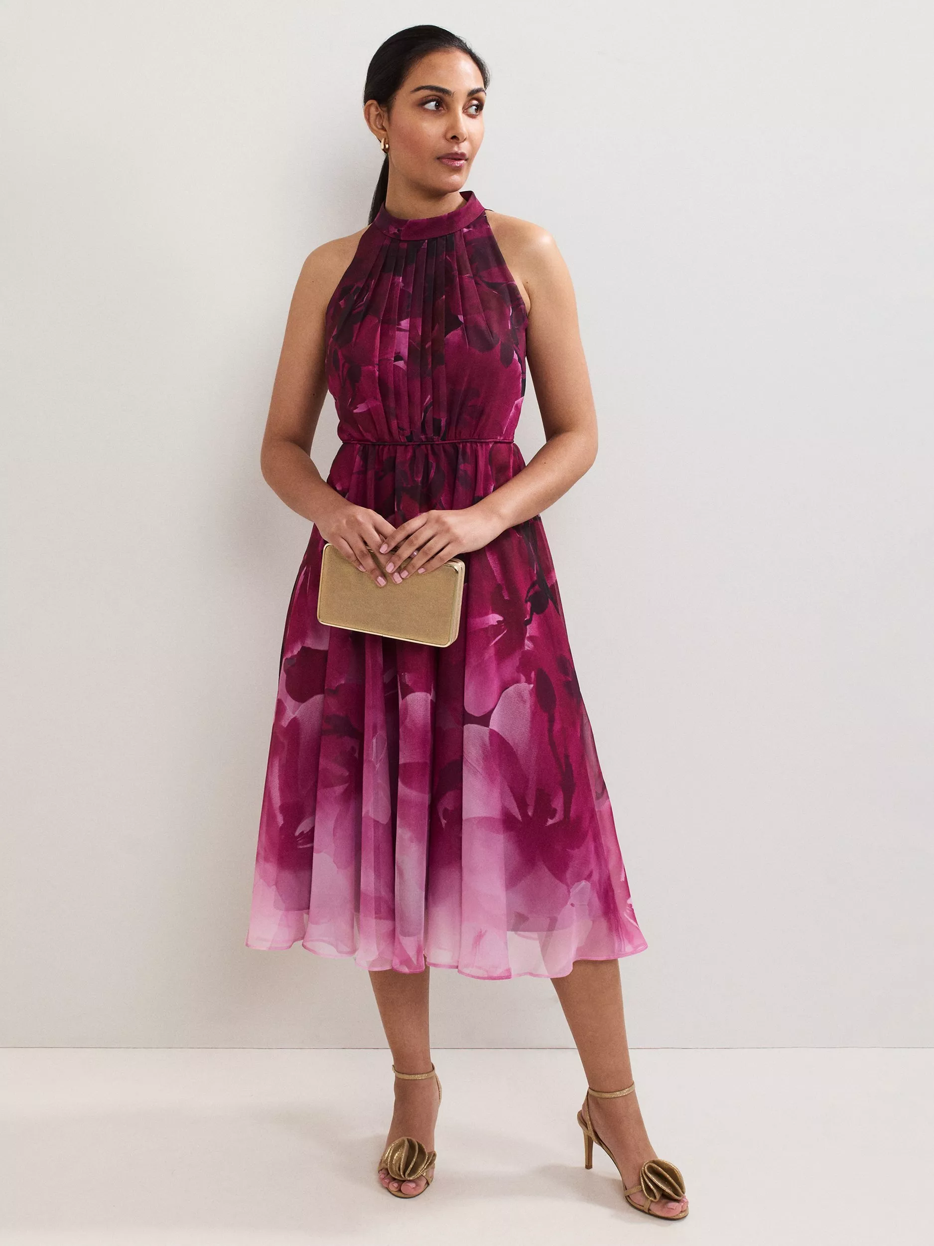 When a timeless silhouette meets a modern floral print, you get this striking halterneck dress. Featuring ombre shades that highlight the natural movement of the skirt. Add elegance by styling with classic heels and a simple clutch.
