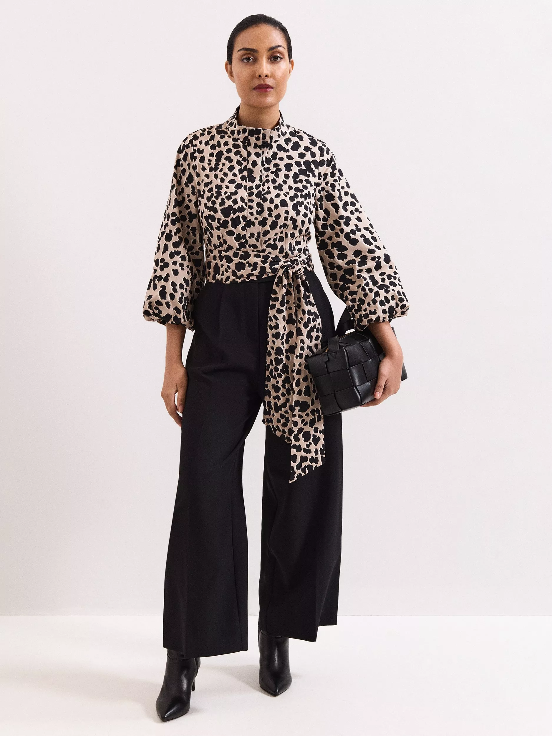 Framed with a high collar neckline and dramatic balloon sleeves, this petite jumpsuit by Phase Eight is crafted from a light and airy blend with cotton, falling to a wide leg silhouette. The leopard print bodice is complete with a wide self-tie belt at the waist.