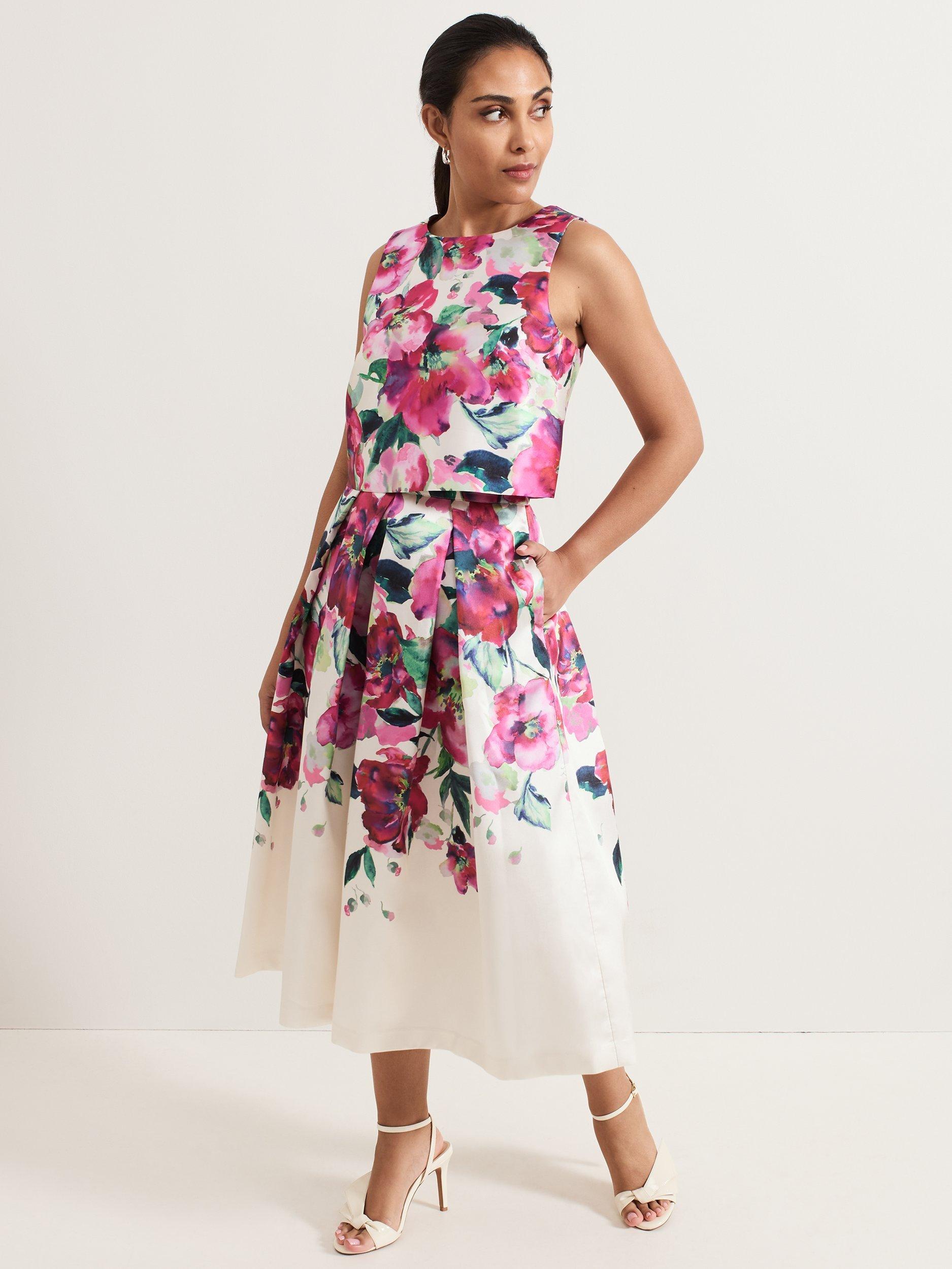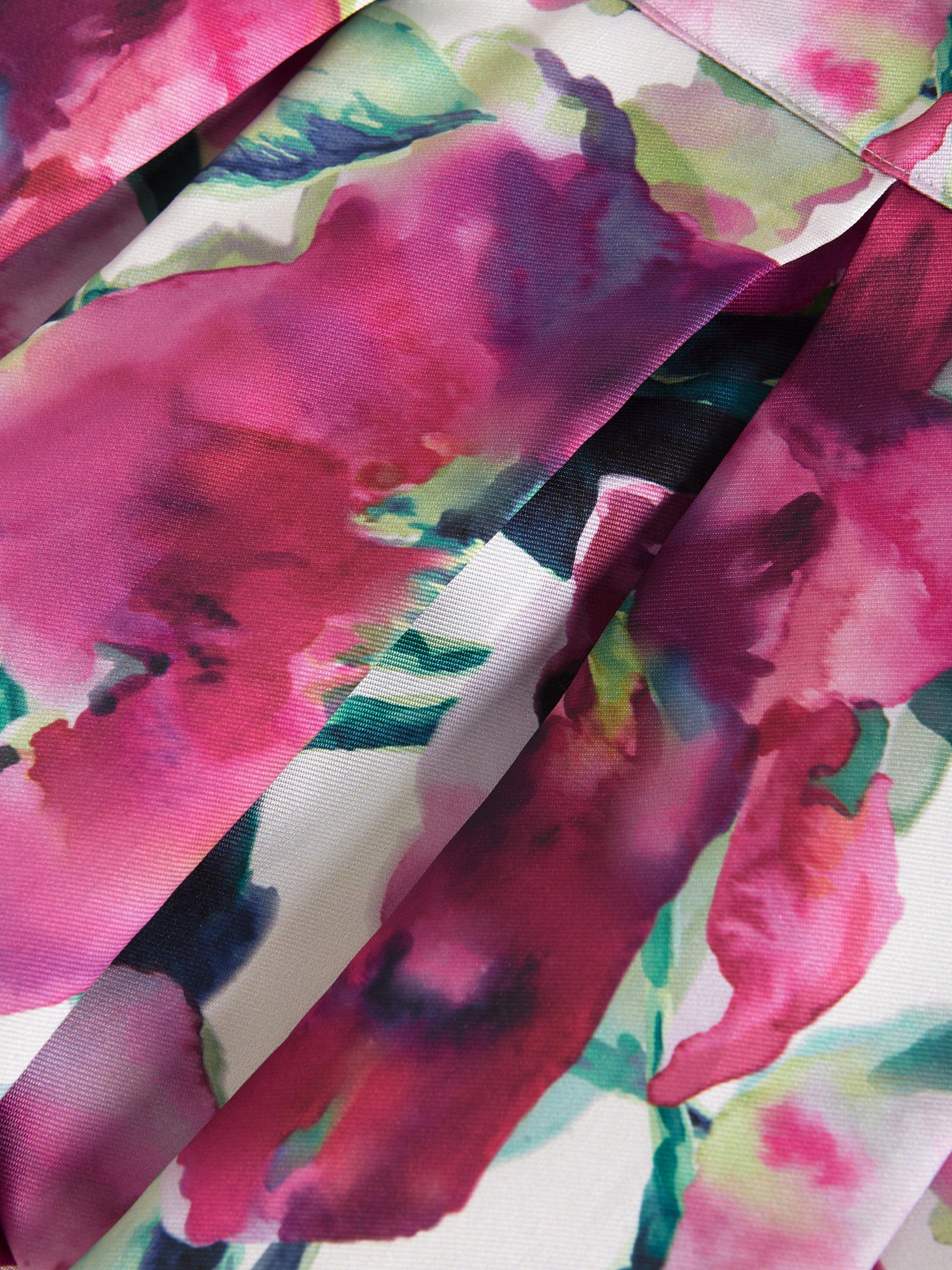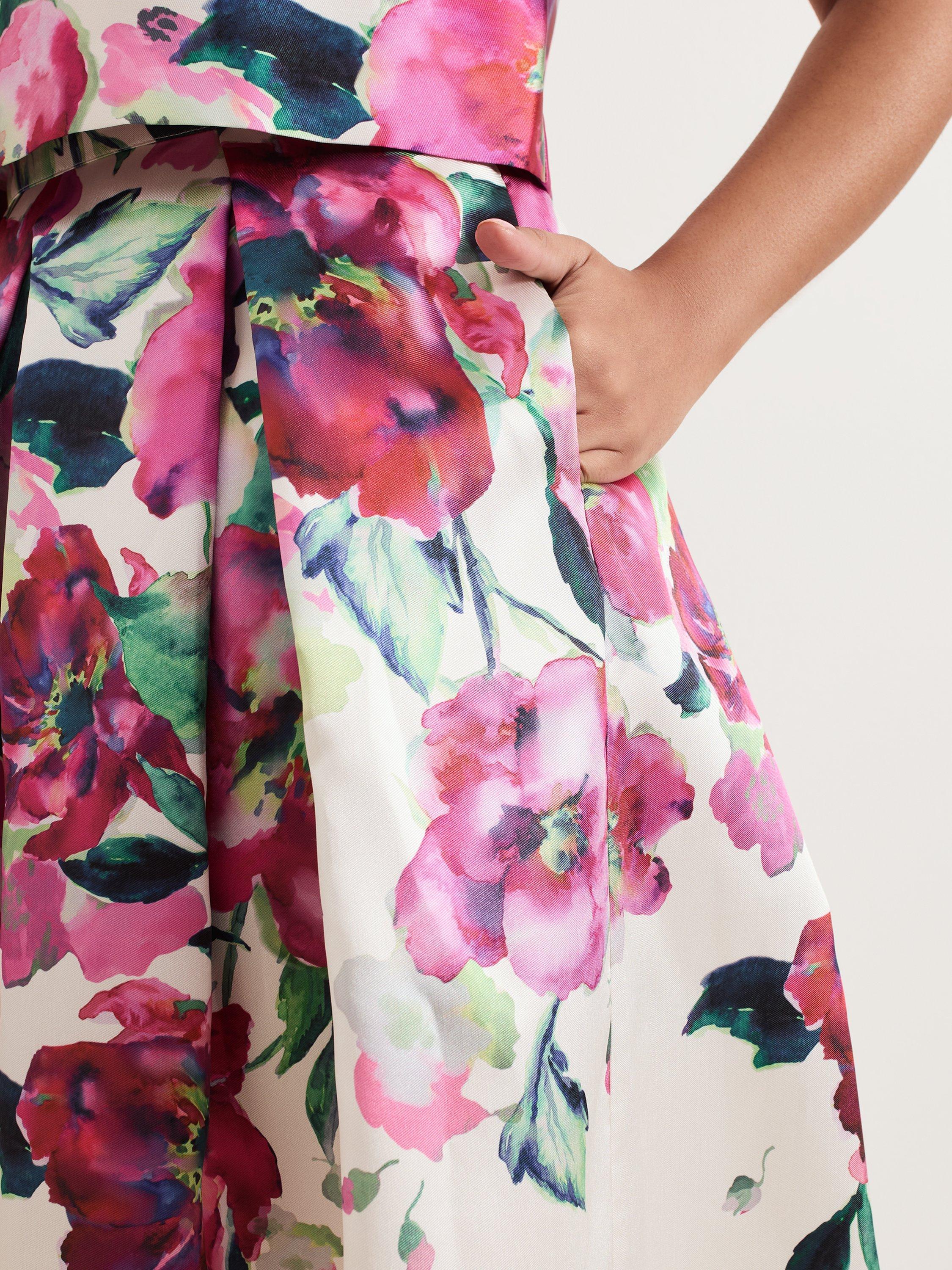 Embrace the art of florals with our striking skirt. Vibrant florals dance across the skirt. With pleats that add volume, the skirt falls just above the ankle.