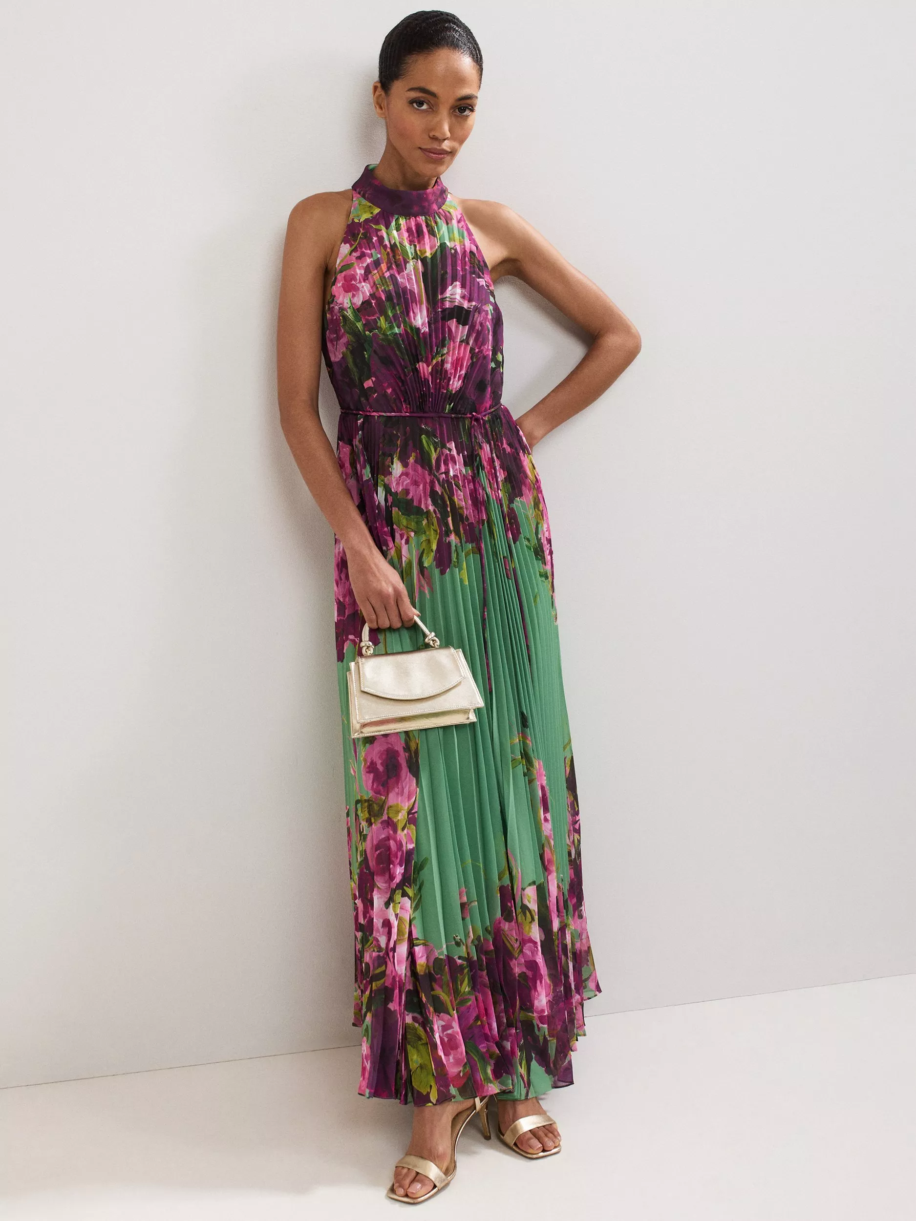 Designed to be the ultimate event style, this maxi-length dress is decorated with a gorgeous floral print and styled with a halterneck. The dress is enhanced by the pleated fabric, adding subtle movement as you walk.