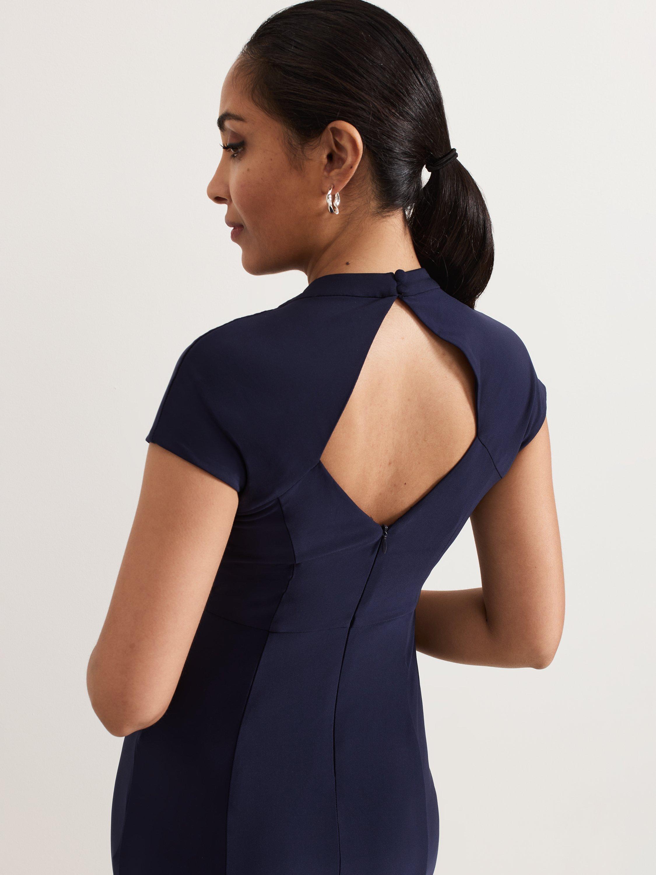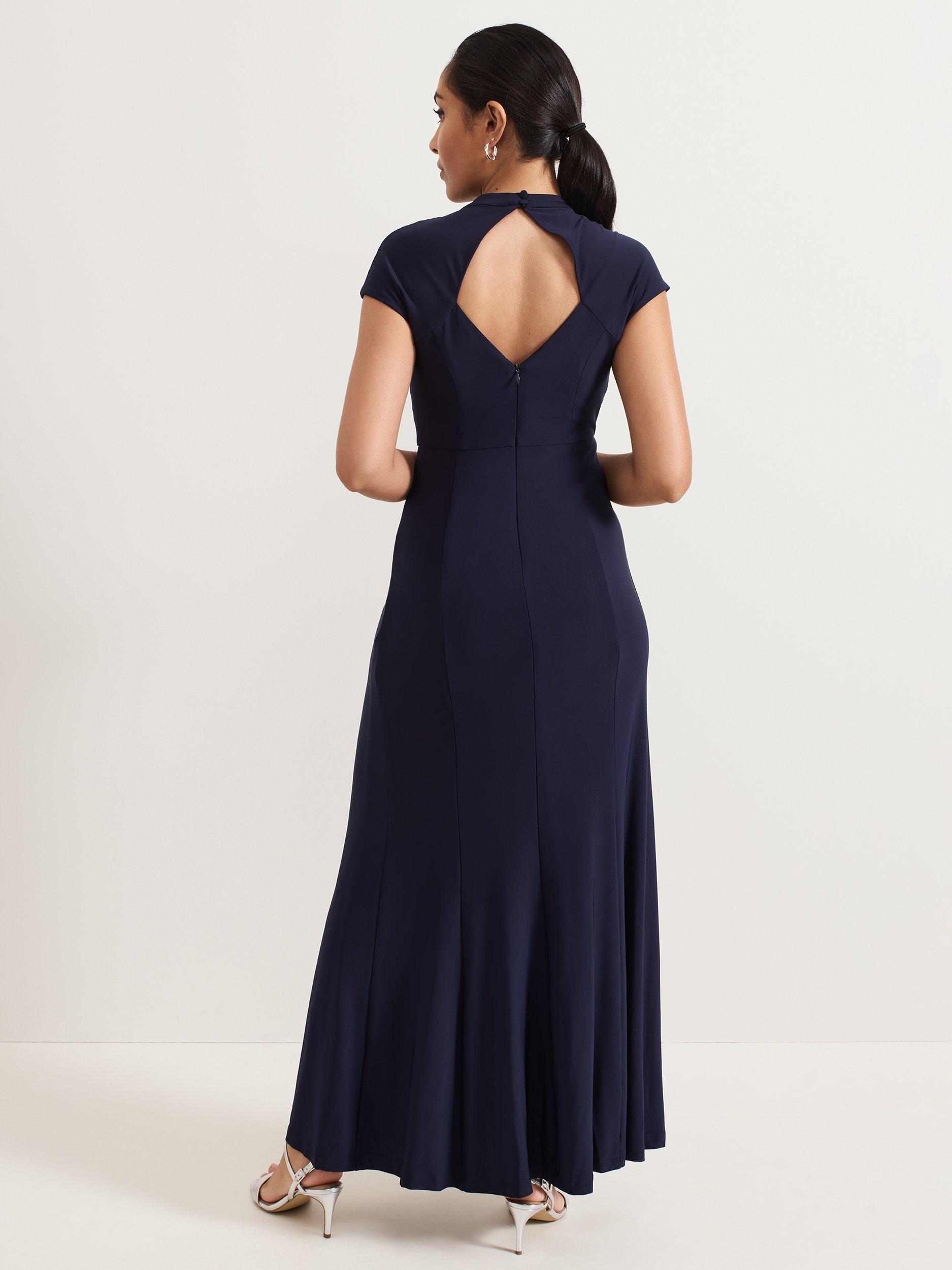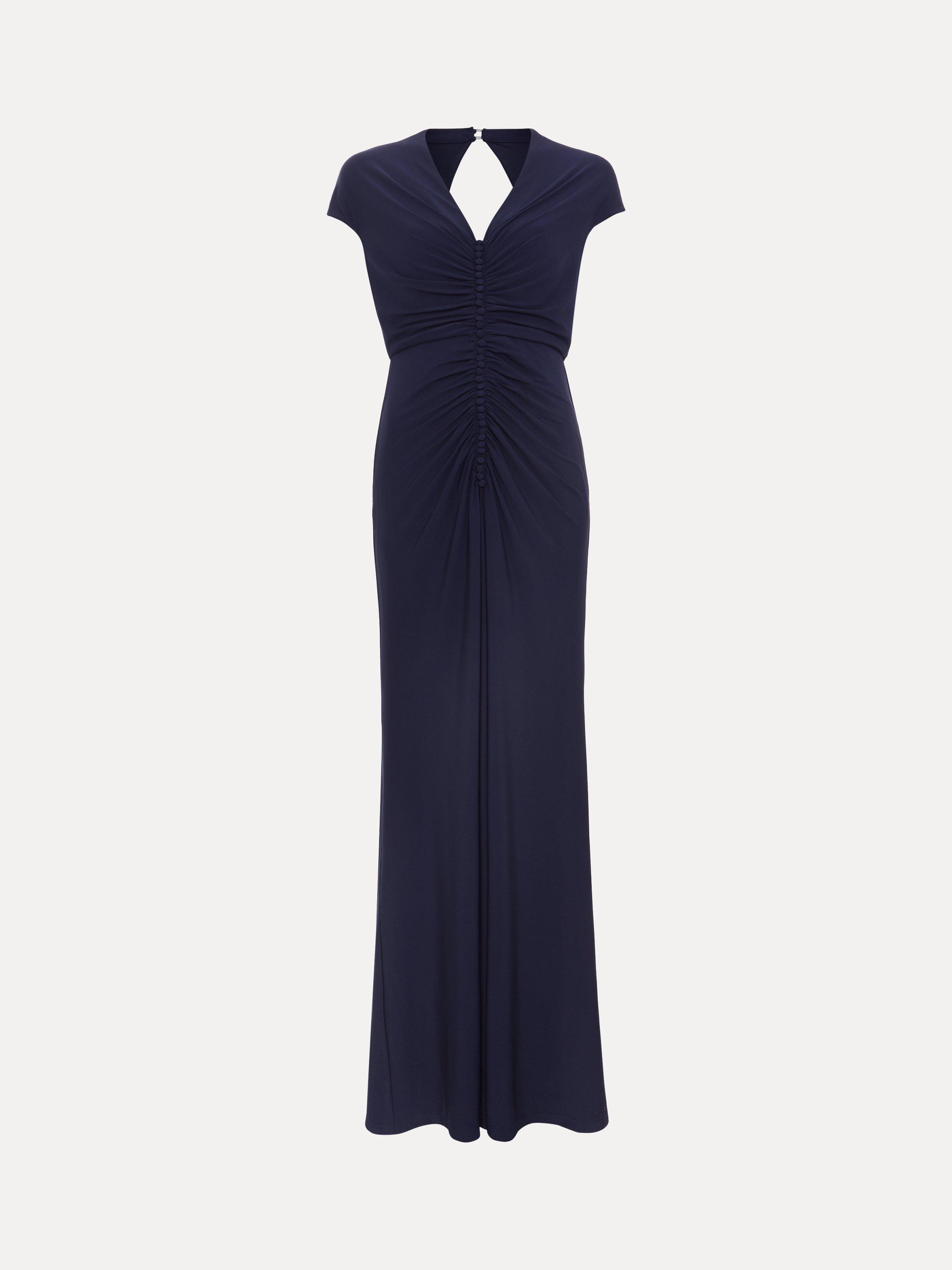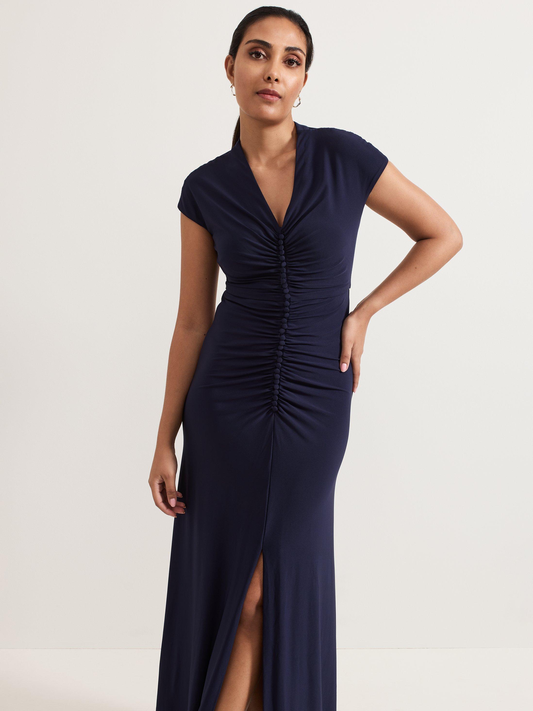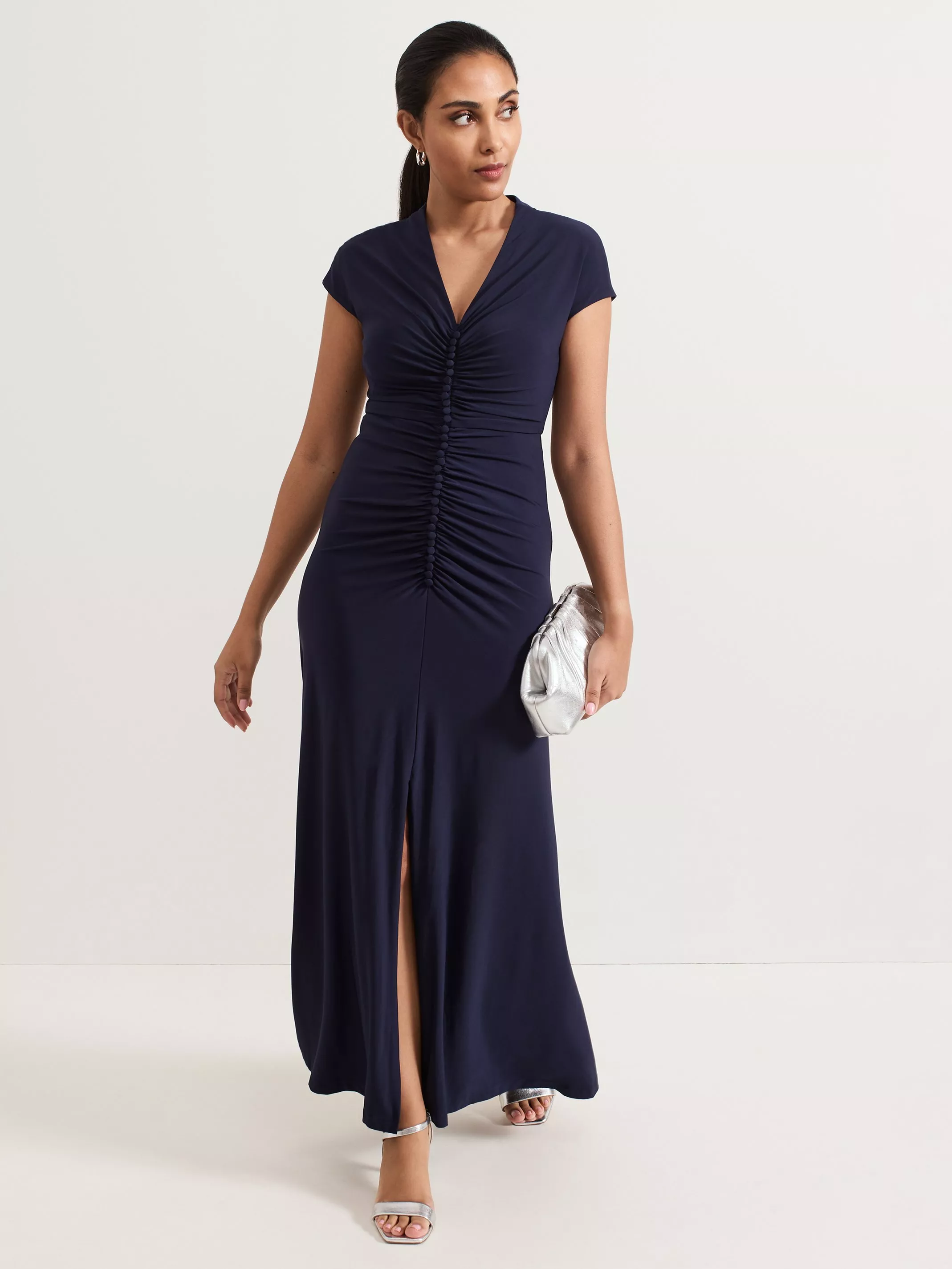 Phase Eight's petite Daisy dress is an elegant choice for a bridesmaid dress or special event. In a soft jersey fabric, this dress features delicate ruching on the bodice that subtly skims your silhouette, falling to a maxi length. Elevated detailing is added by the modest front split and diamond cutout at the back. Style with silver accessories for a simple yet timeless occasion style.