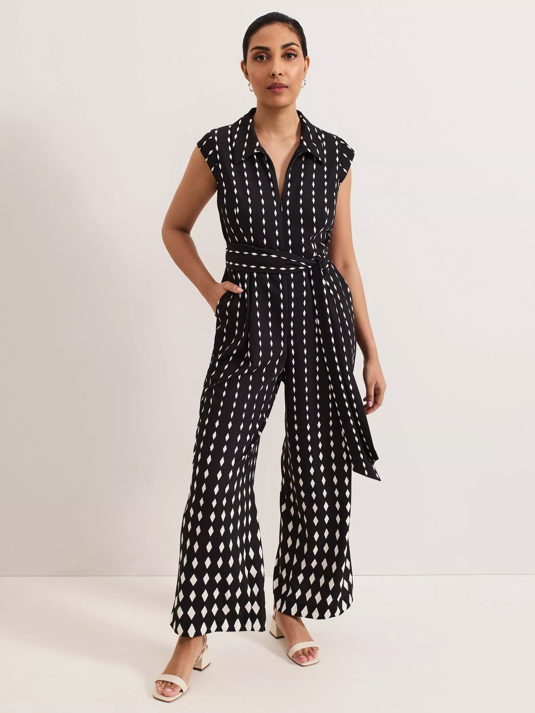 Embrace effortless dressing with the Delina jumpsuit. In a diamond print that catches the eye, this jumpsuit features a classic shirt collar and capped sleeves, fastening with a zip for a contemporary update. The slightly cropped wide leg trousers make it perfect for showing off your favourite sandals, perfect for warmer days or your next holiday.