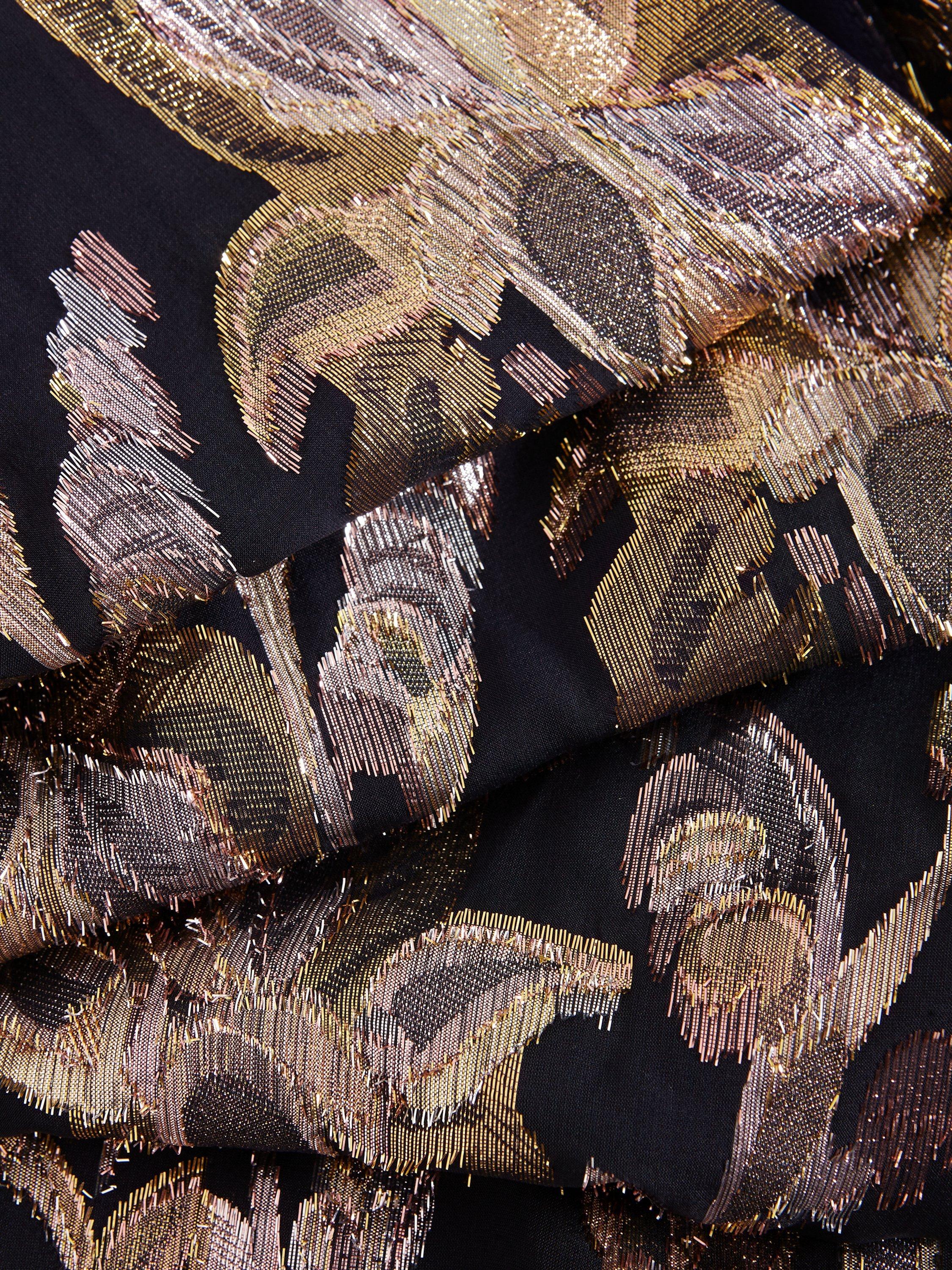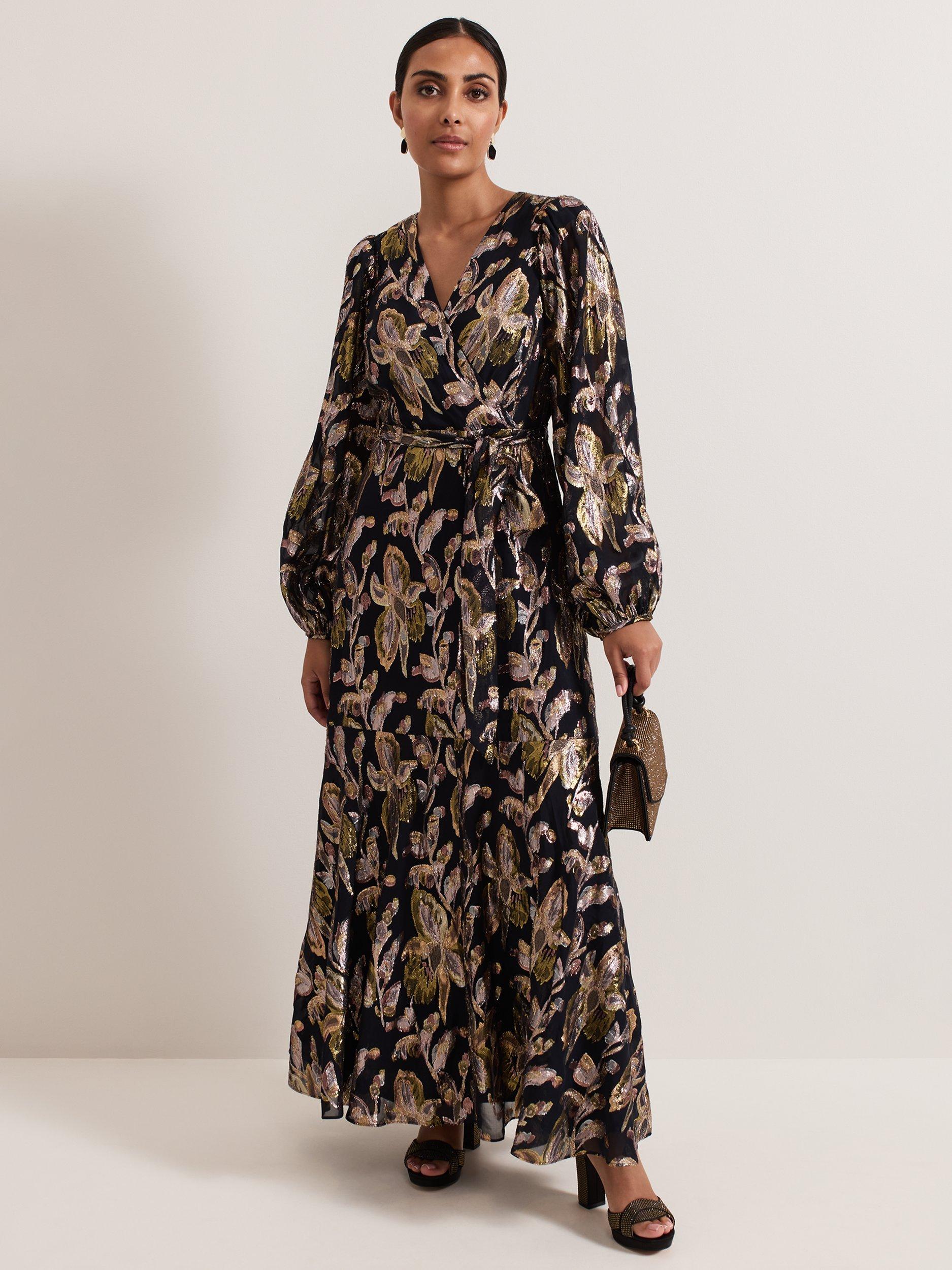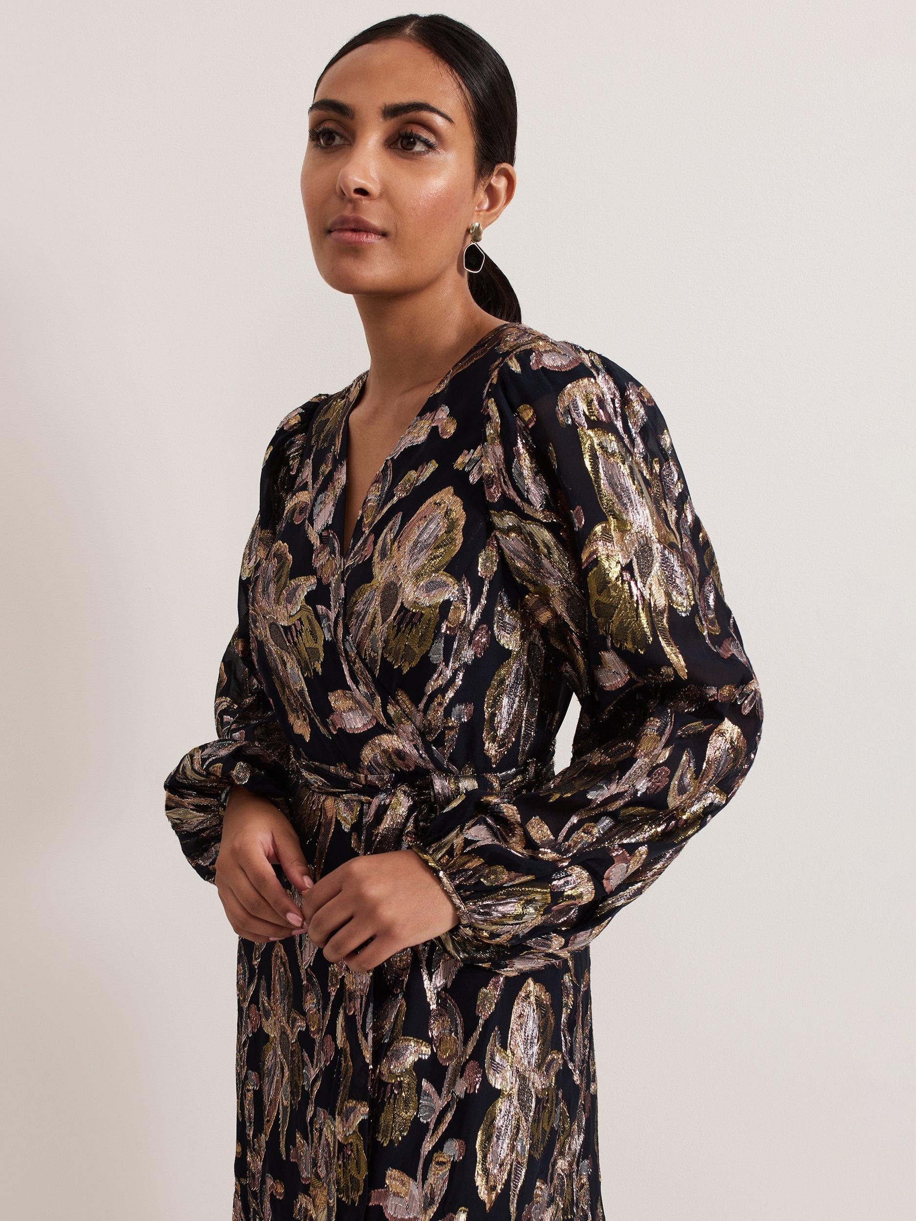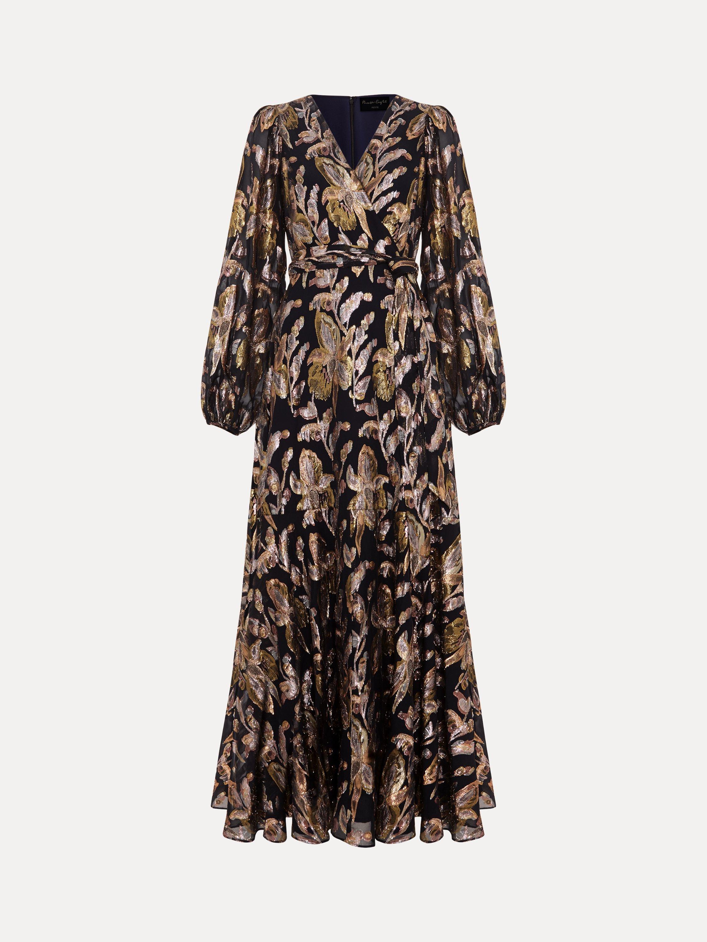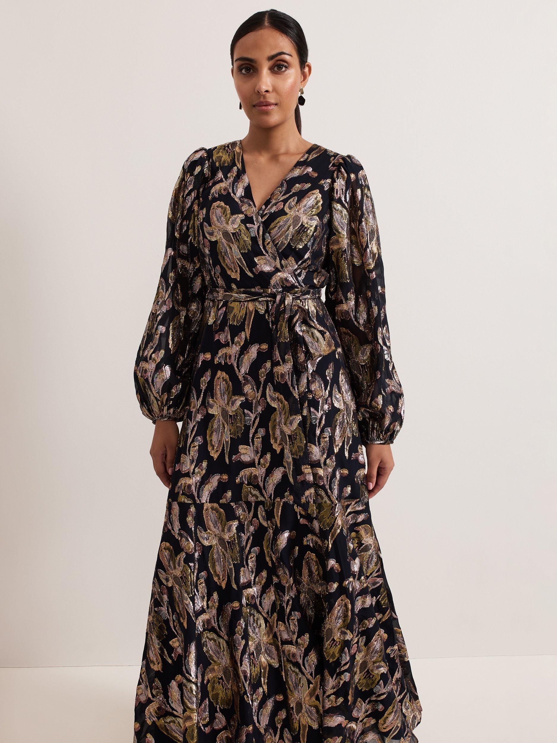 Cut from a premium silk blend, Phase Eight's Ellio dress is designed in a leaf pattern with metallic thread detailing, falling to a full maxi length. Featuring long semi-sheer blouson sleeves and a matching tie waist belt it is the perfect feminine style to pair with gold accessories for your next event.