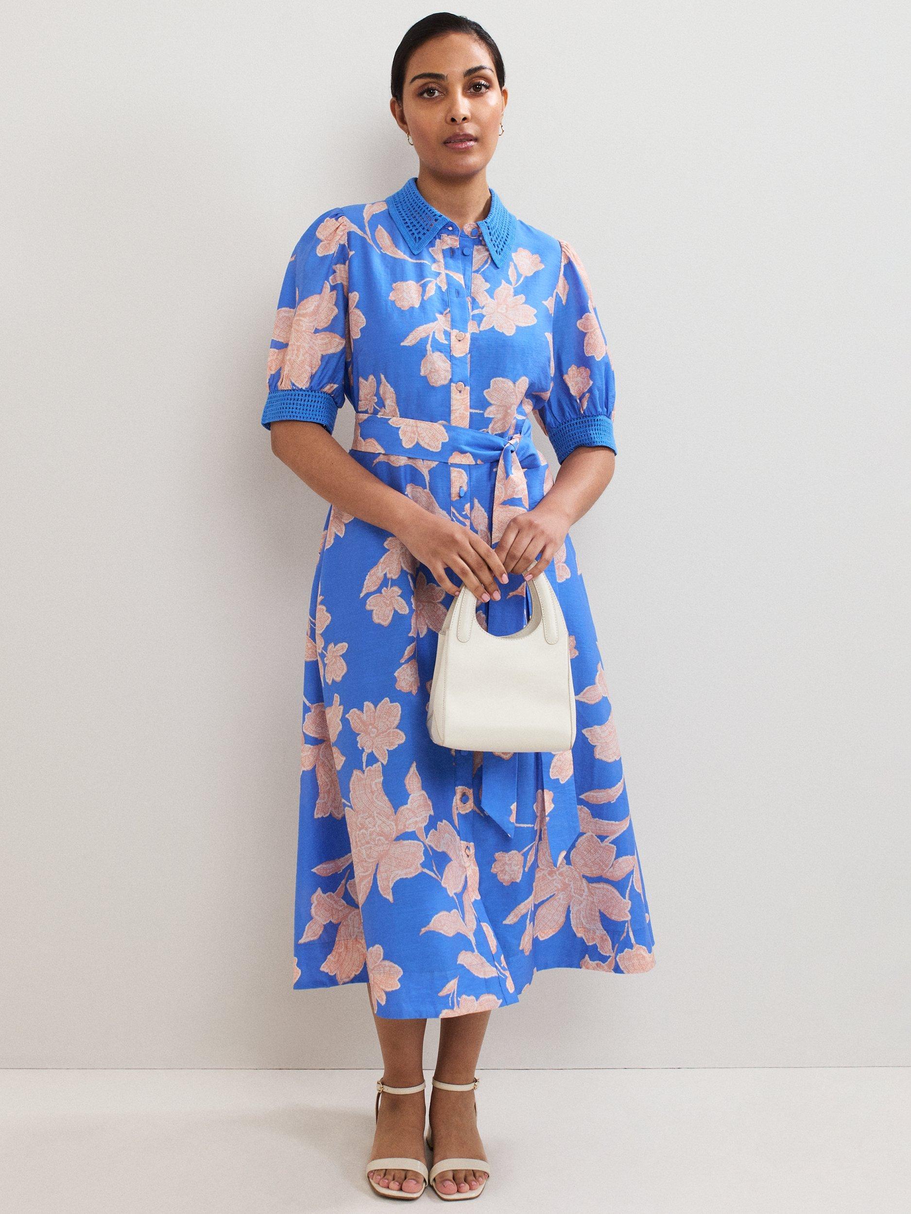 Stand out in bold print and expressive colour with this vibrant dress featuring a contrasting, soft floral print that's all about the details. Designed with a crochet collar and sleeve edging that adds texture, as well as covered buttons and a thick tie waist that creates a modern silhouette. It can be worn styled up or down, from office to party.