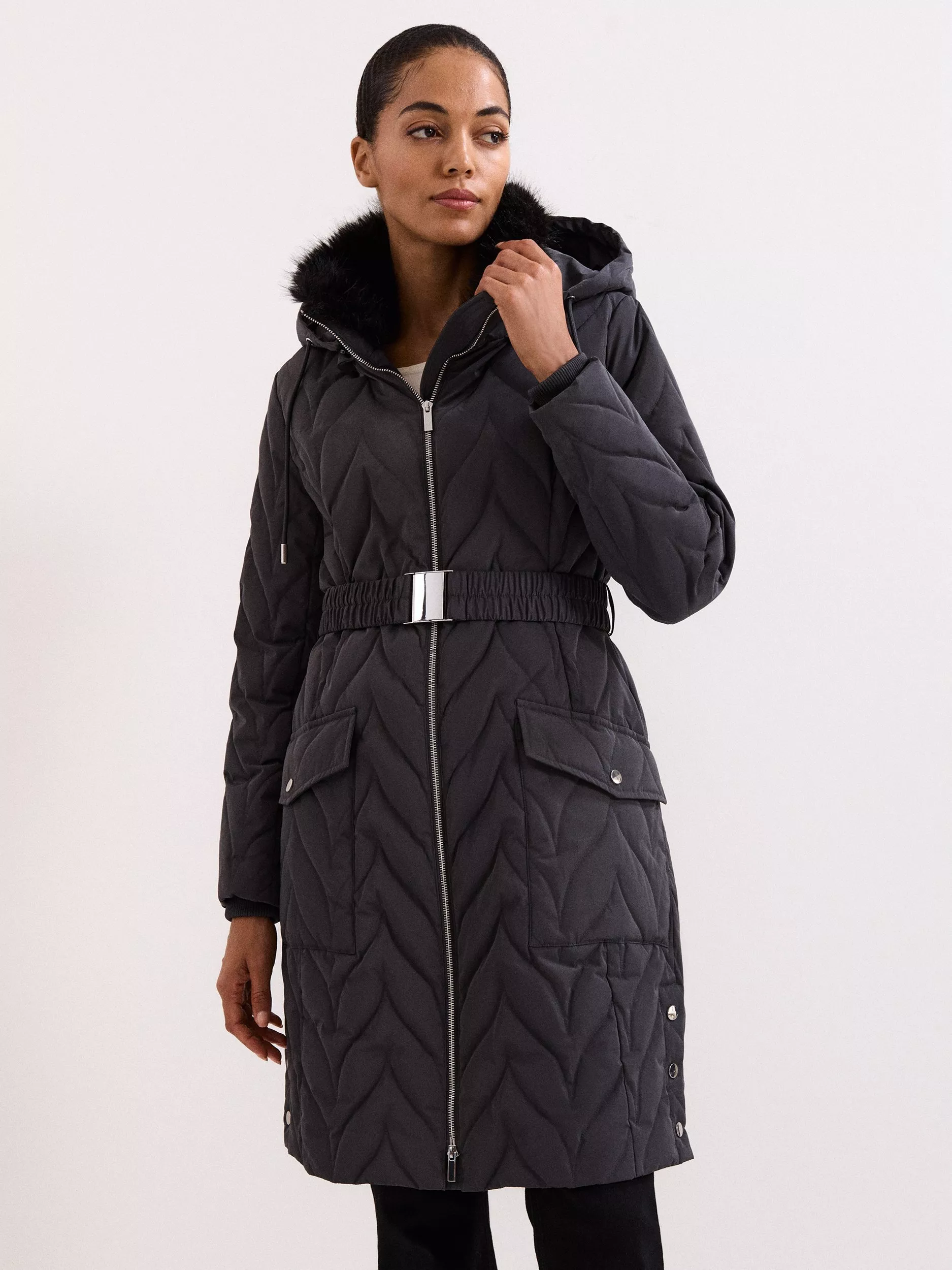 Keep warm and comfortable with this petite longline puffer coat from Phase Eight. The regular fit, zip fastening, and lined hood offer reliable protection for your day.