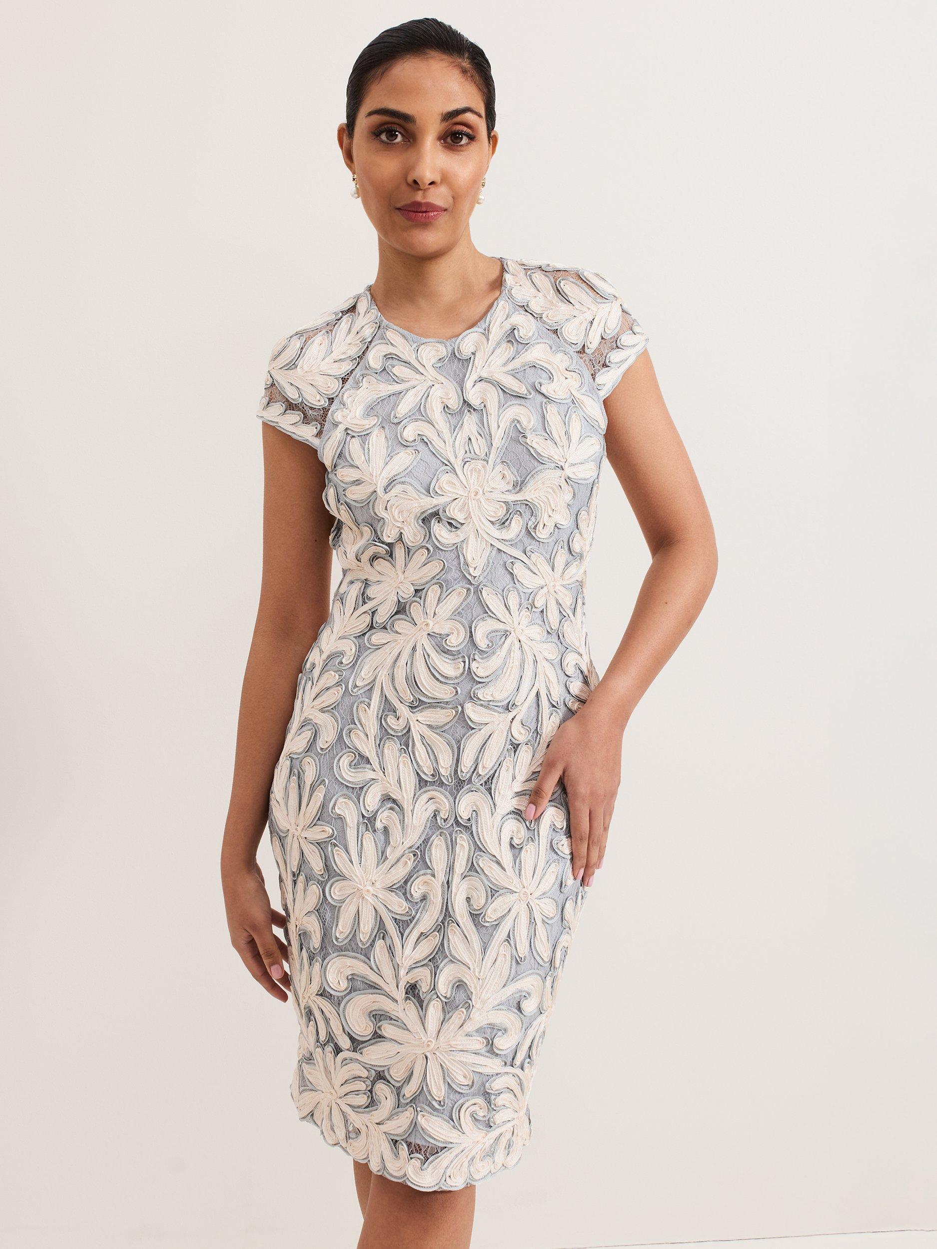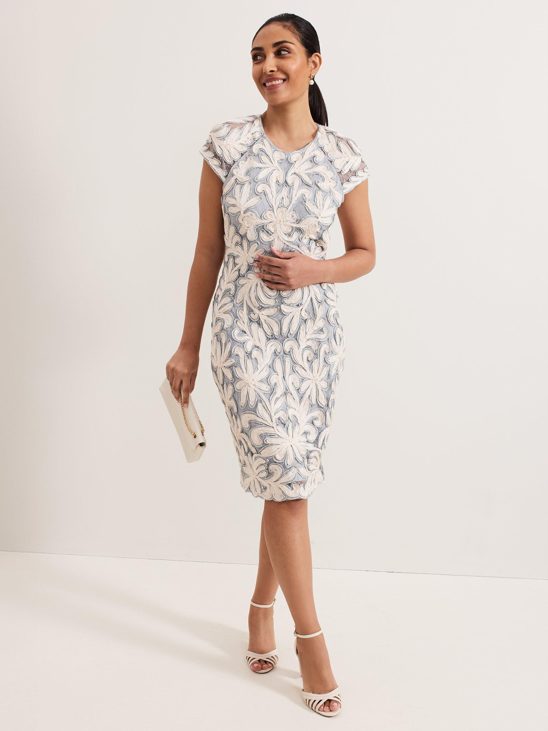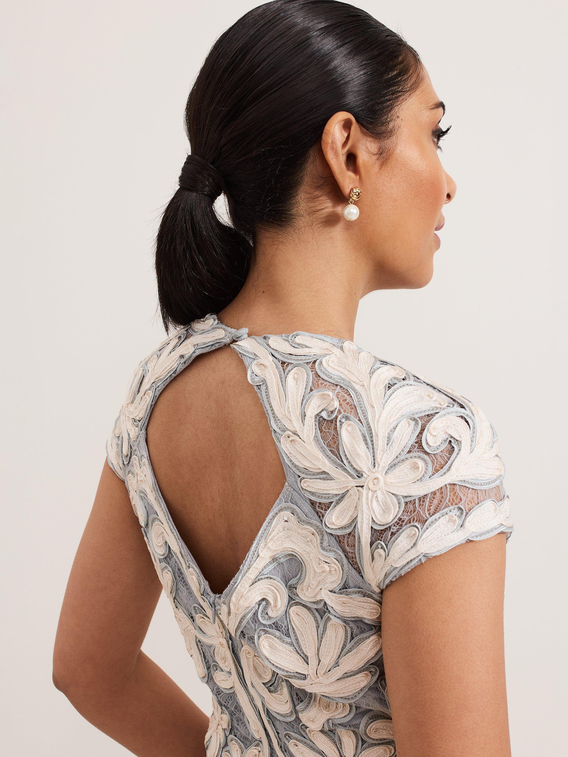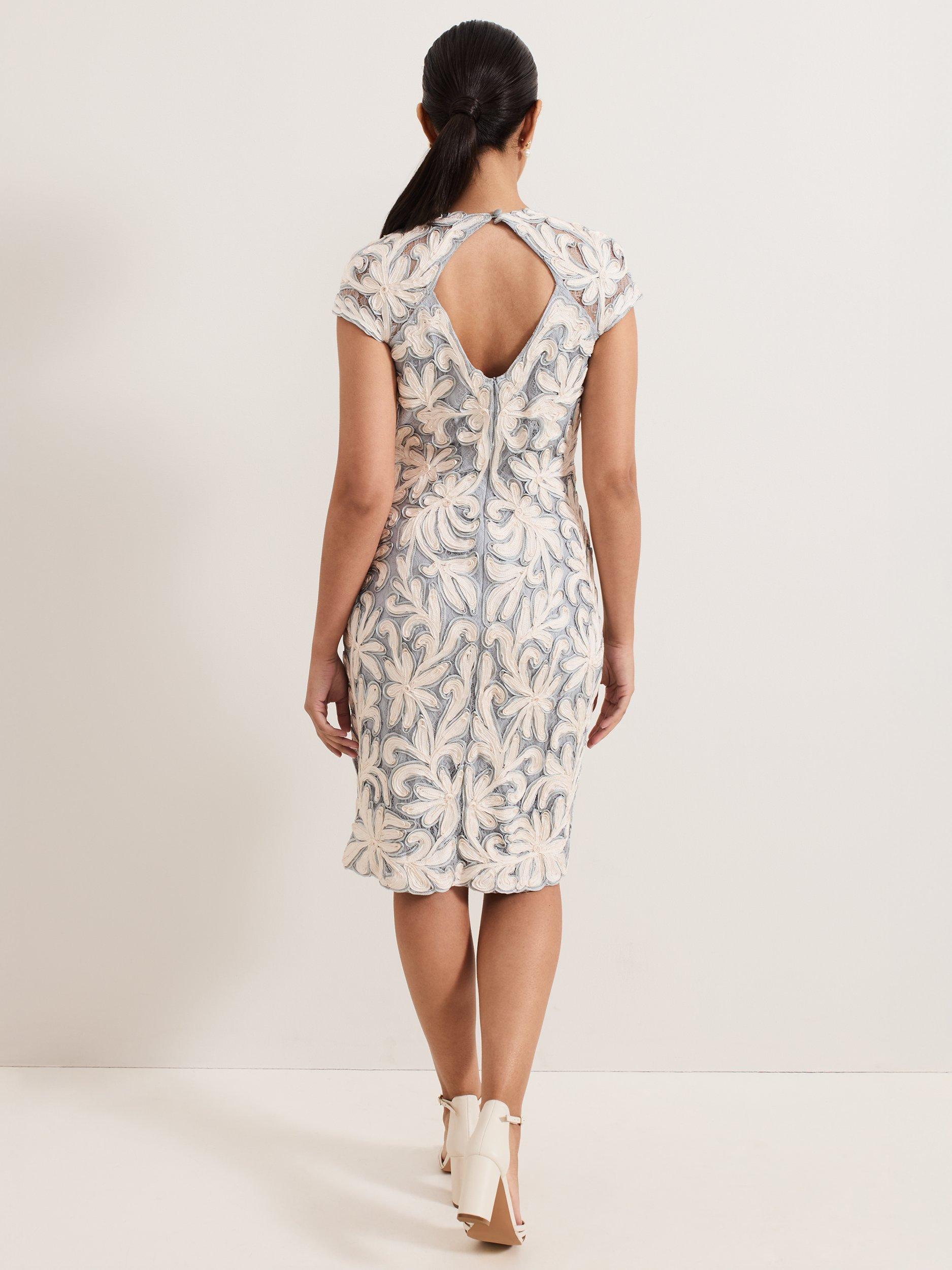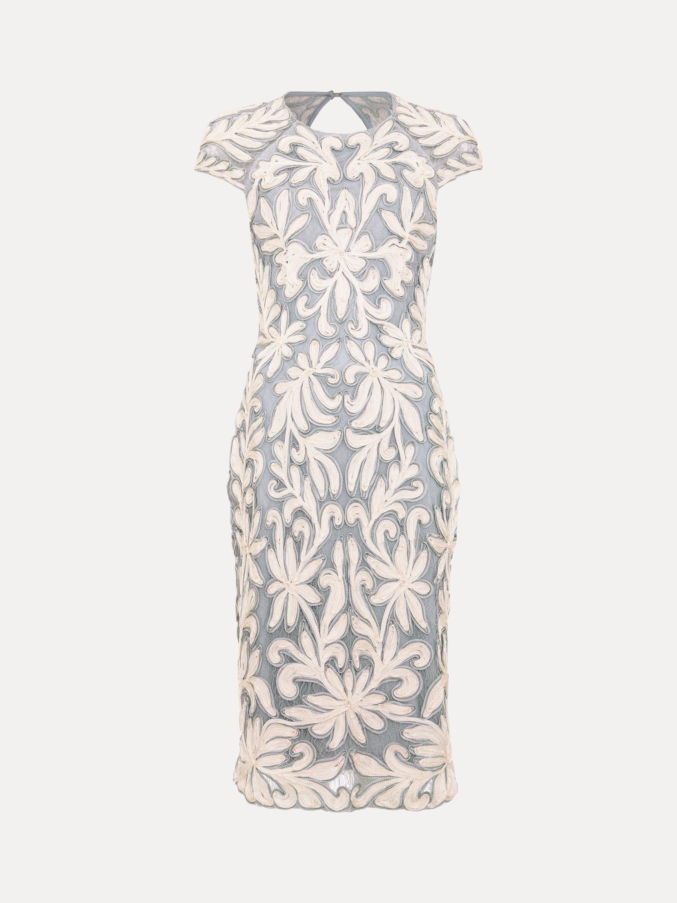 Designed for elevated evening dressing and for your most important events. Crafted from signature tapework lace, this midi dress is cut to a structured silhouette, featuring considered details such as the diamond eyelet at the back. Simply pair with matching accessories for all your formal occasions.
