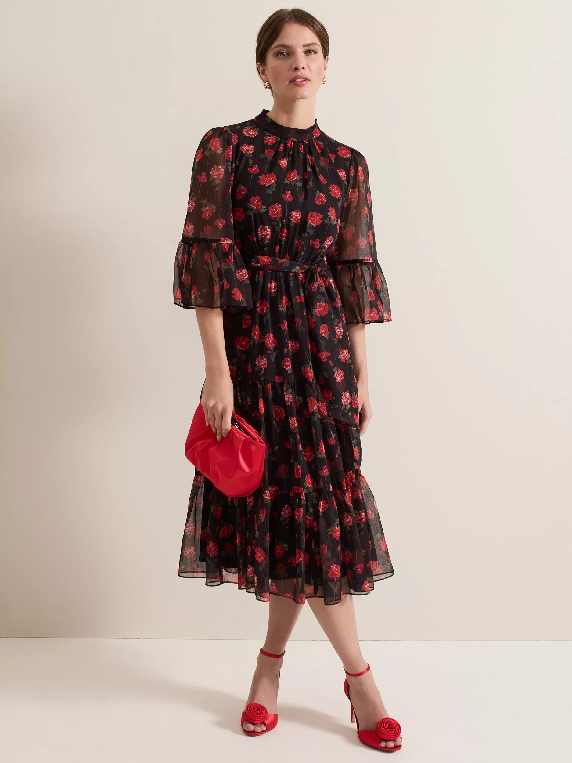 Designed in a stunning floral print, the Lela dress features an elegant high neckline, semi-sheer bell sleeves and eyelet detailing at the back. The loose tie belt highlights the waist before falling to a flowing tiered midi length to create a feminine silhouette that is perfect for your upcoming events.