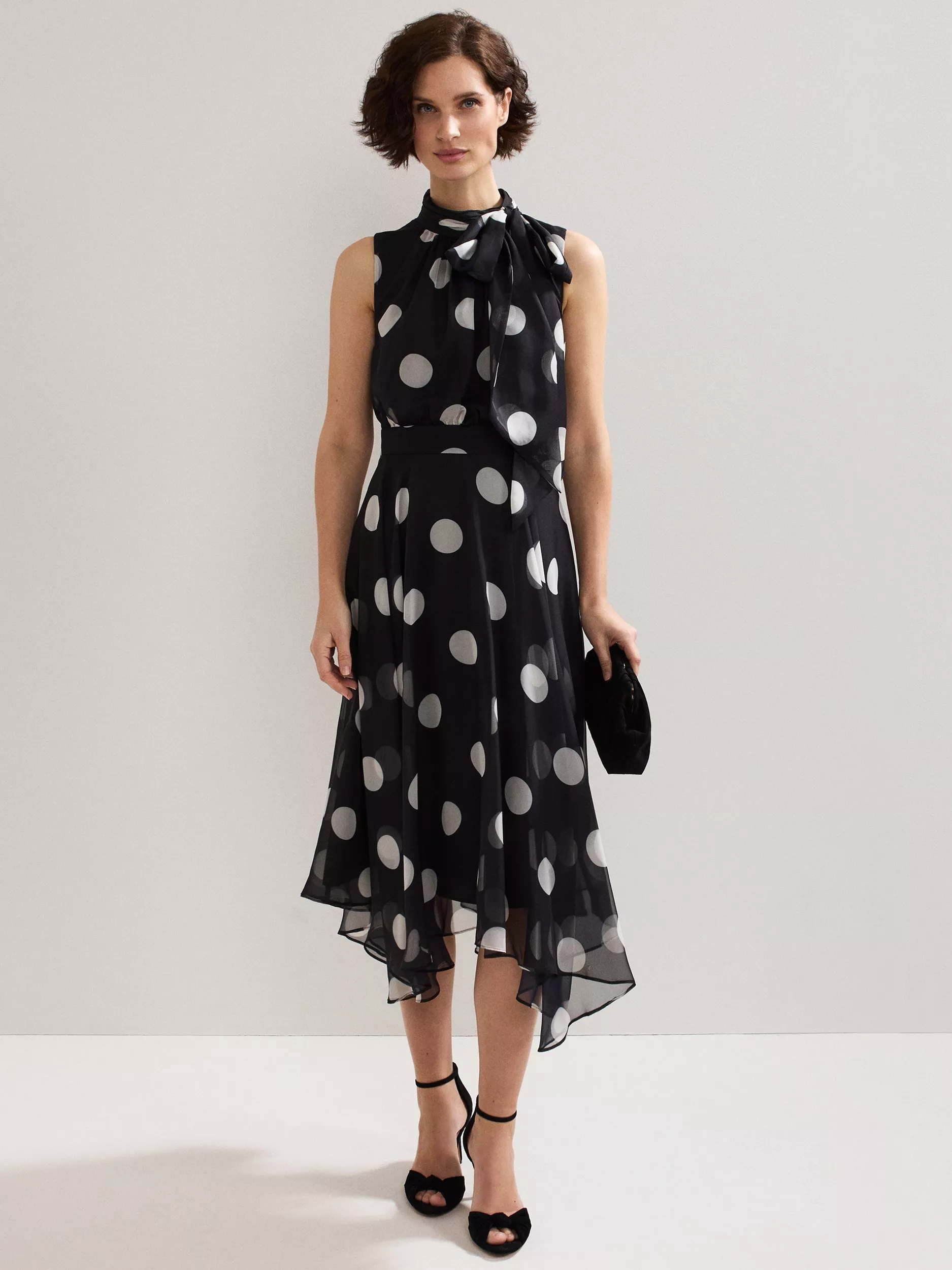 Looking for a standout occasion style? The Lucinda silhouette arrives in a new polka dot print that will never go out of style. Elevated talking points include the elegant pussybow neck and asymmetric hem that creates fluid movement. Simply style with matching accessories for special events.