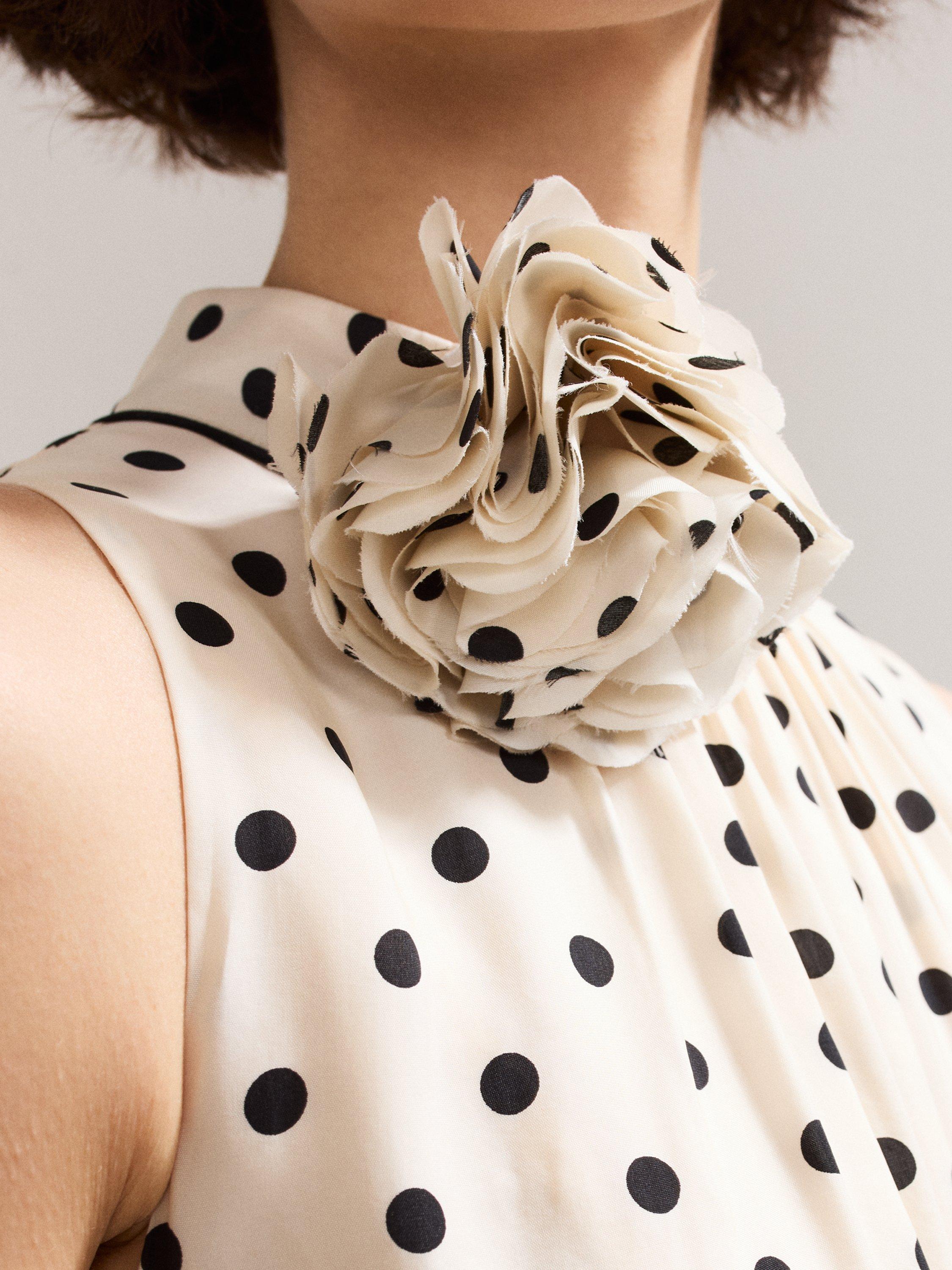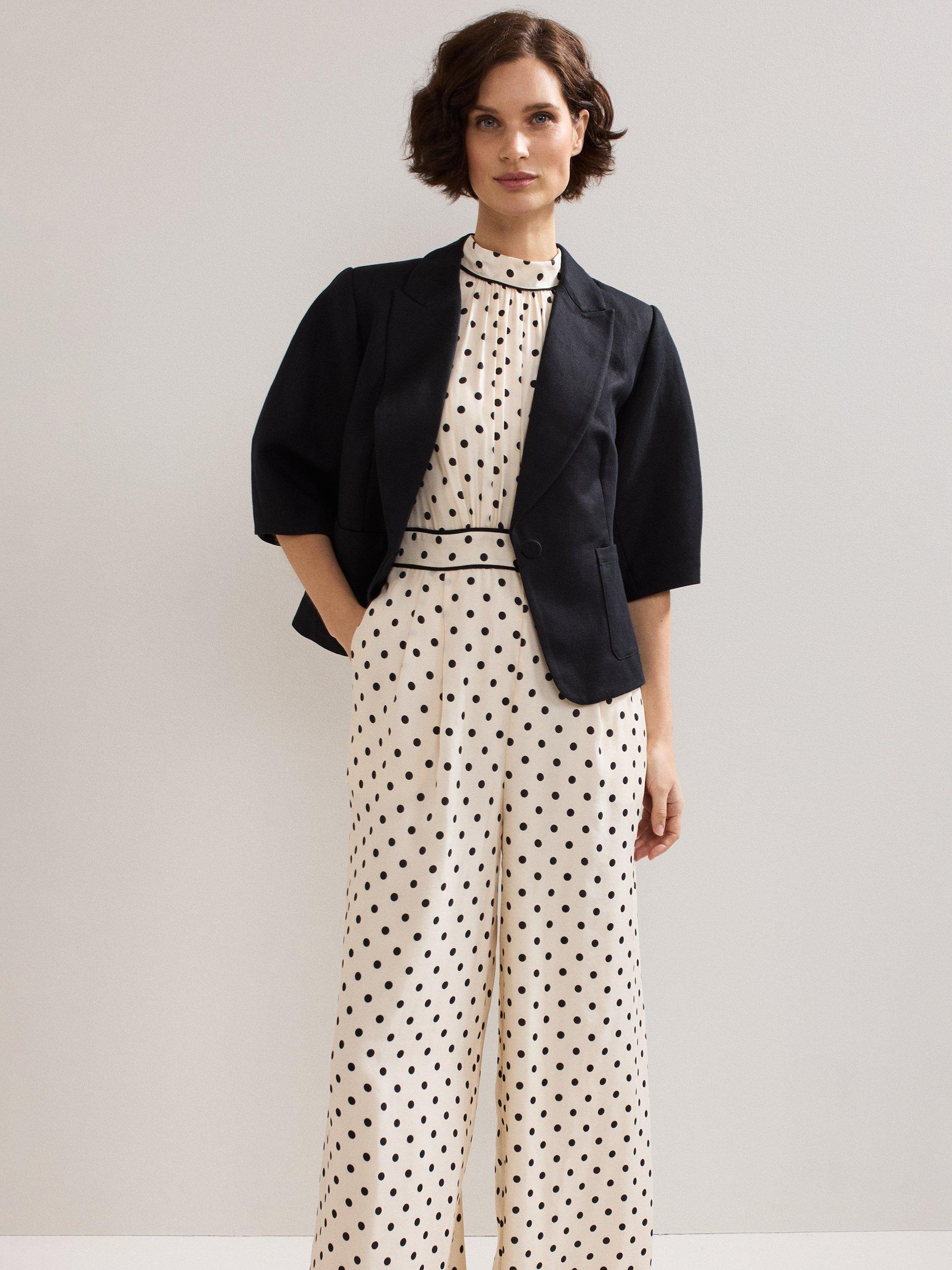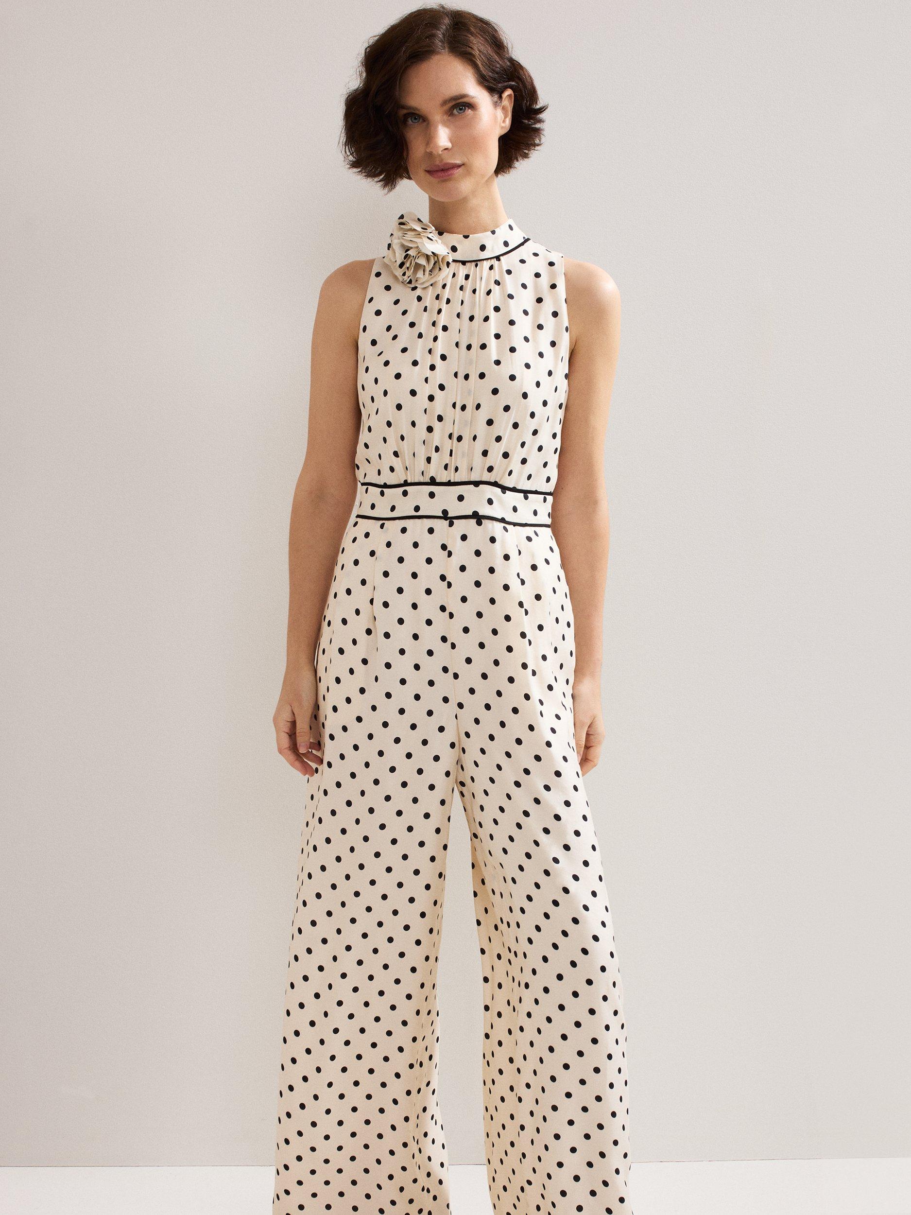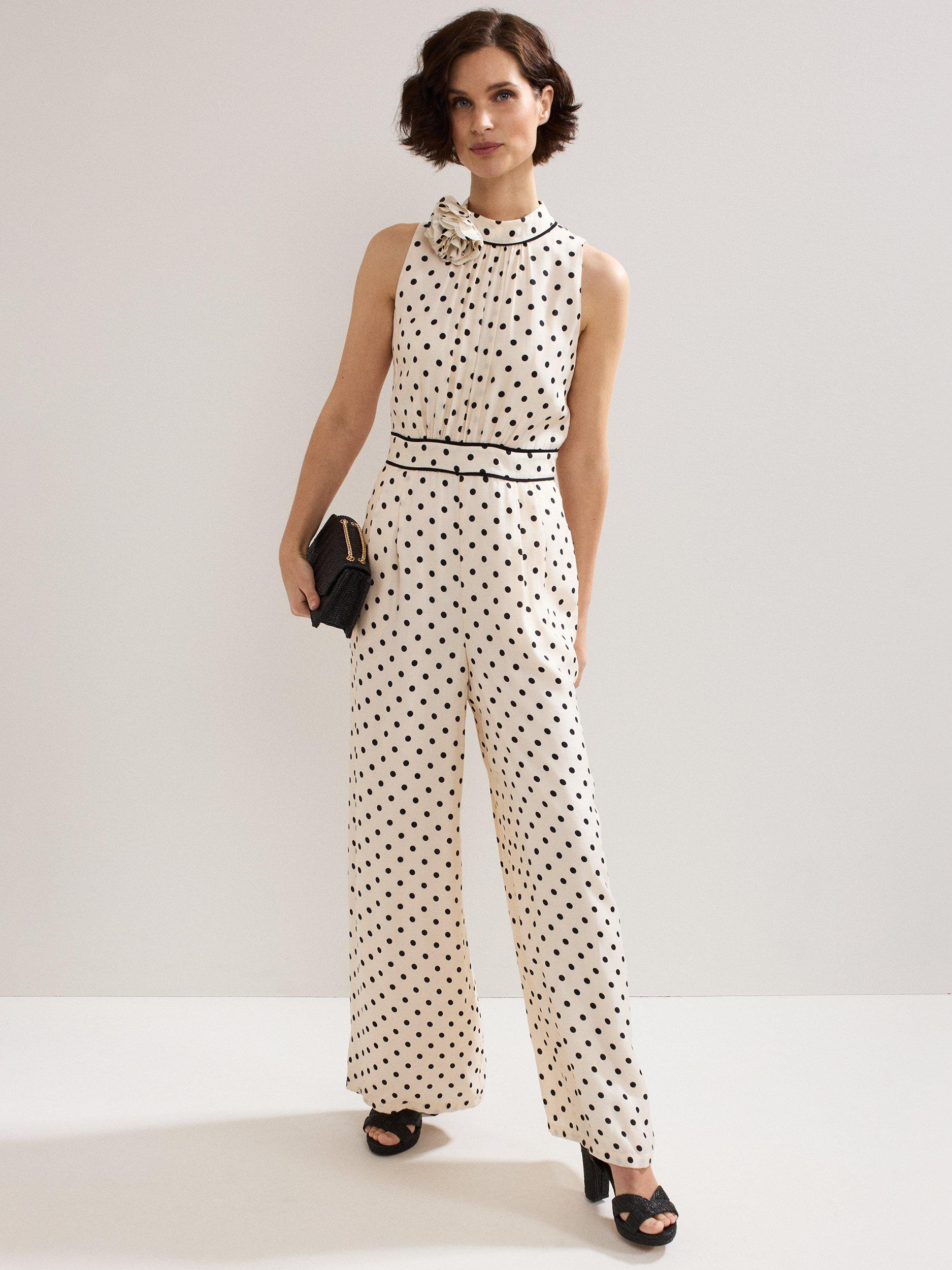 Add a touch of polka dot to your event wardrobe with this wide-leg jumpsuit. The waistband detail highlights your figure for a flattering fit, perfect for wearing all day or night. Finished with a romantic floral appliqué at the neckline, this style perfectly combines the classic and contemporary for a standout look.