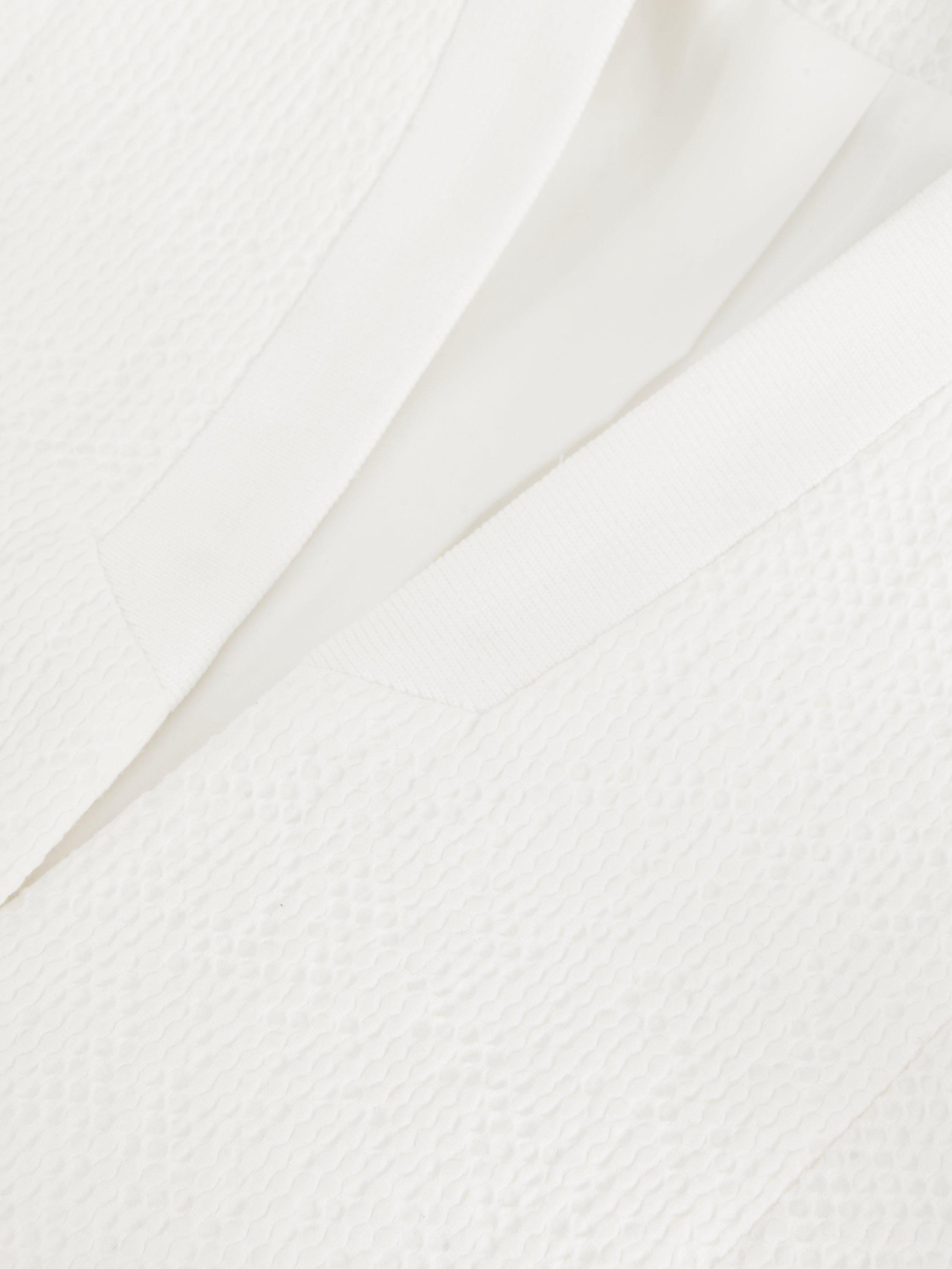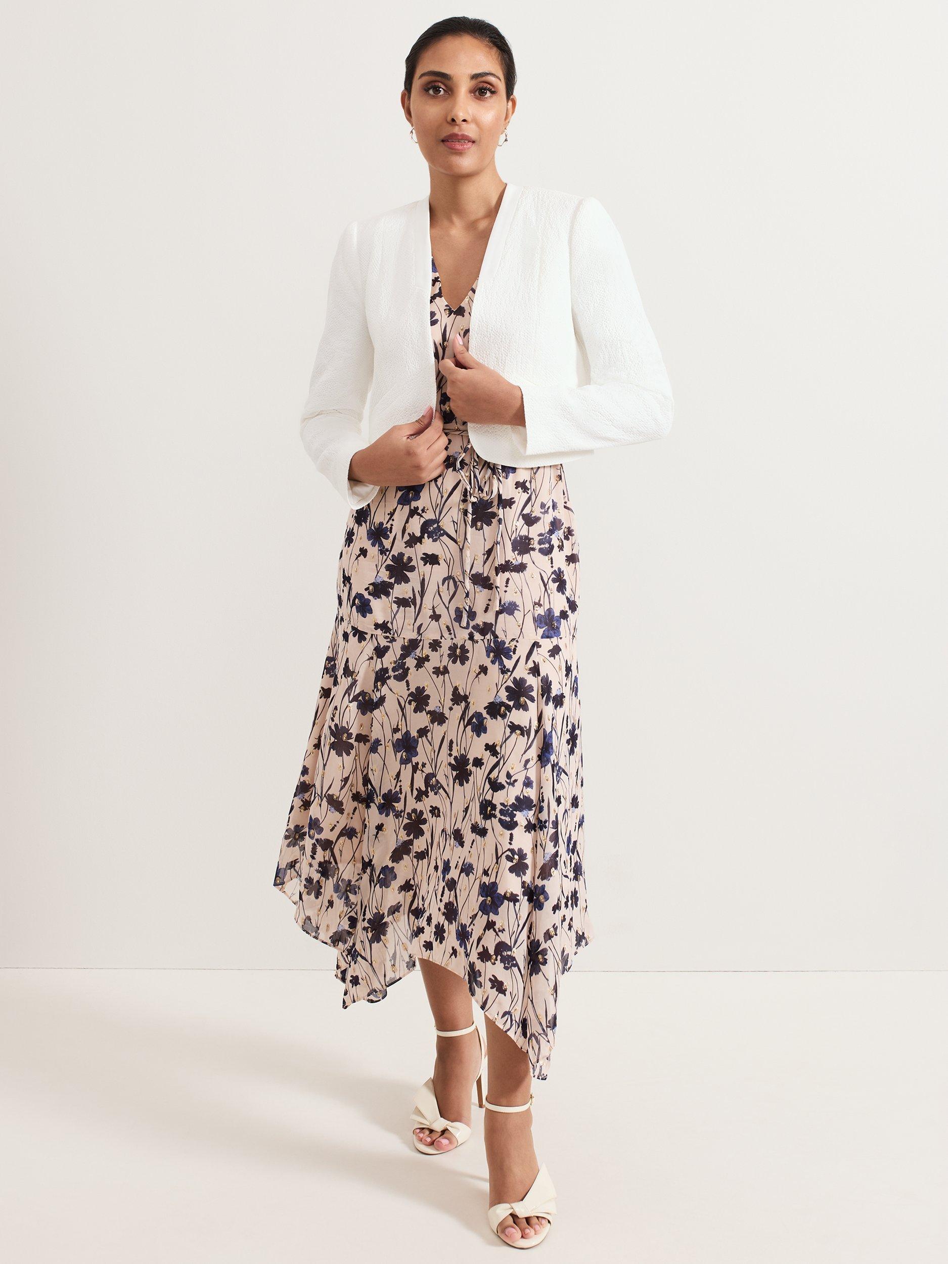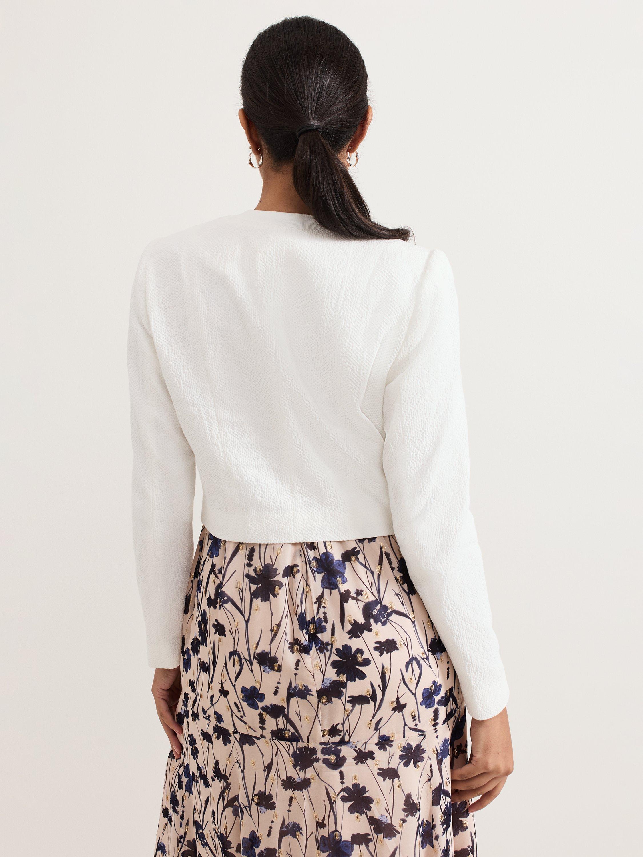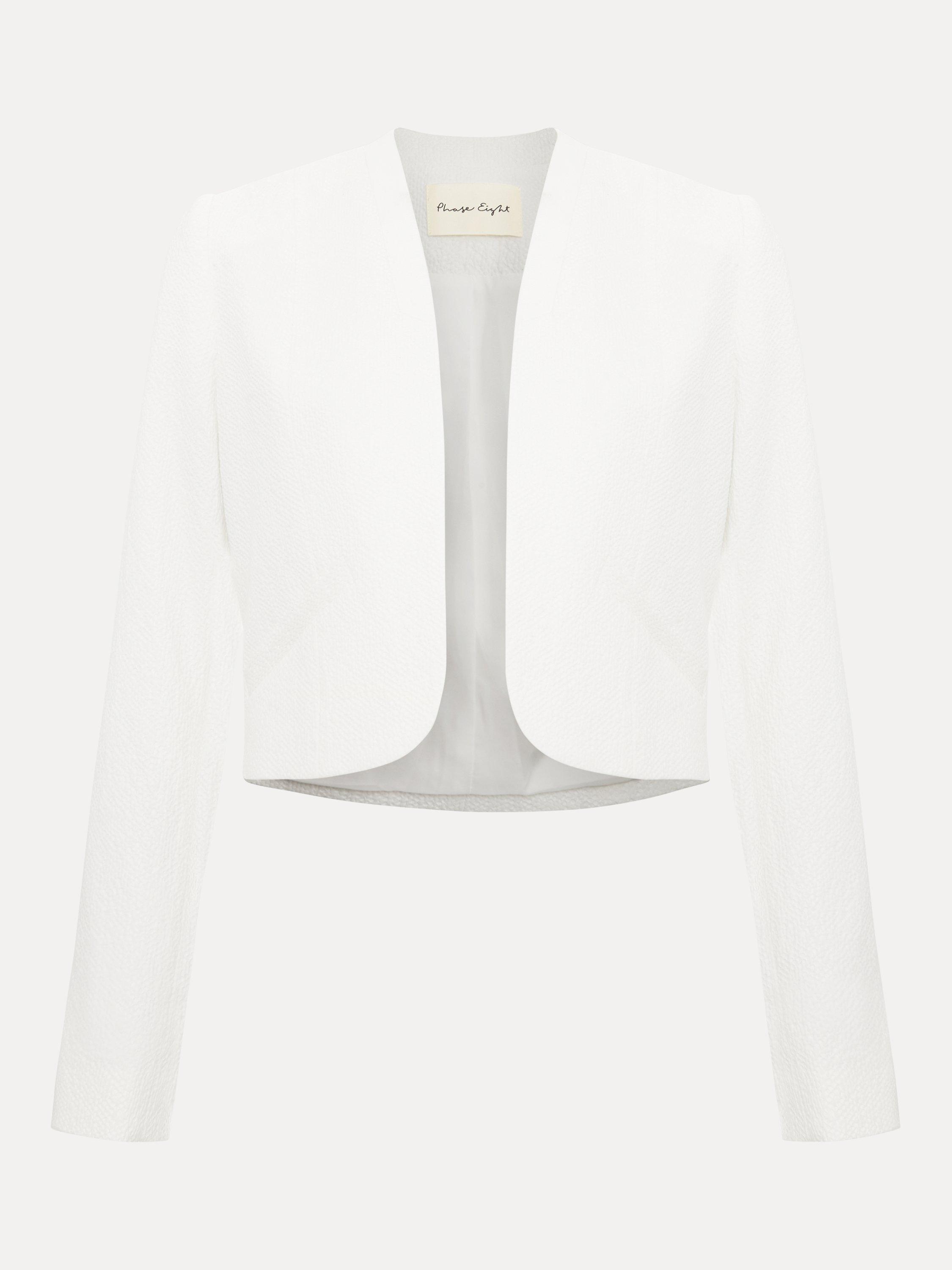 The Olivia jacket is a relaxed yet refined style. In a timeless shade, this jacket features a subtle texture for a modern edge. The cropped silhouette makes it the perfect finishing touch for your event styles for a sophisticated look.