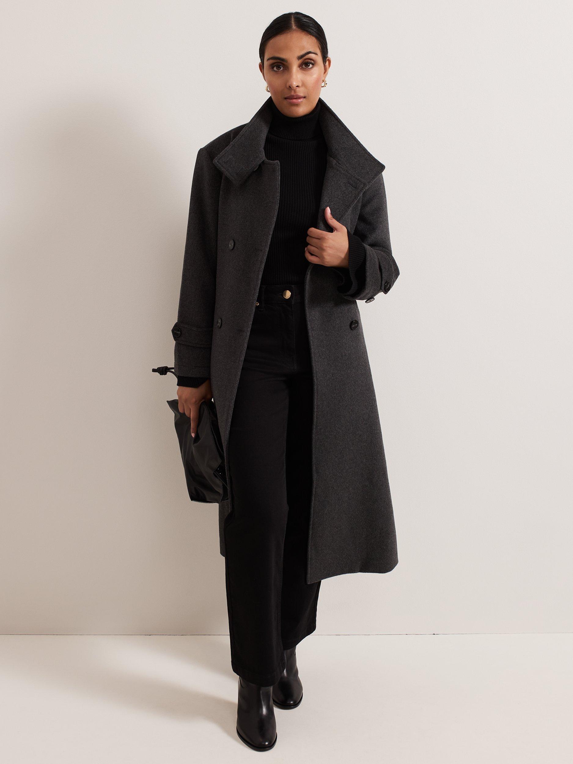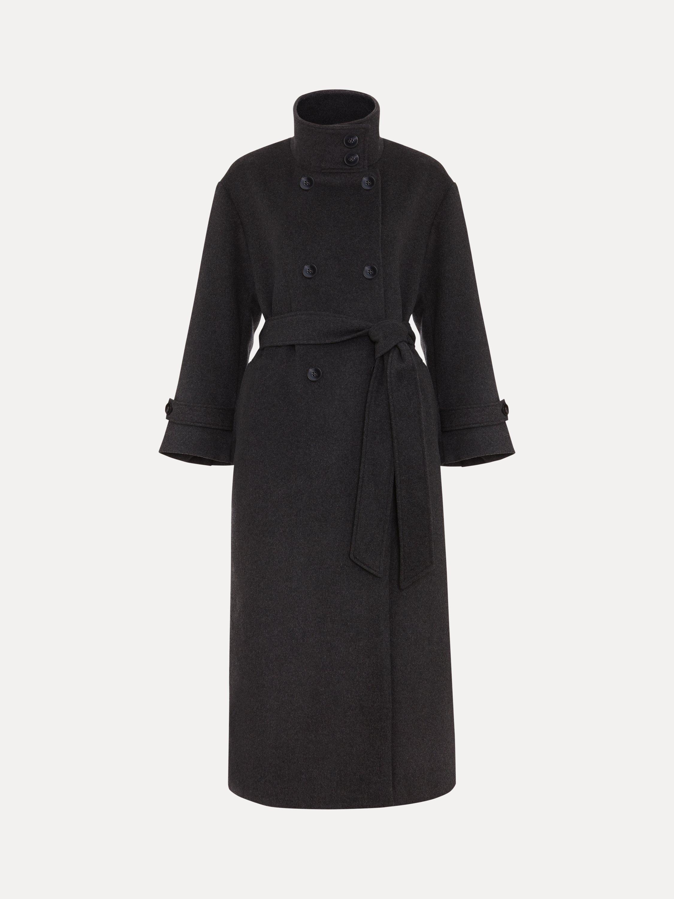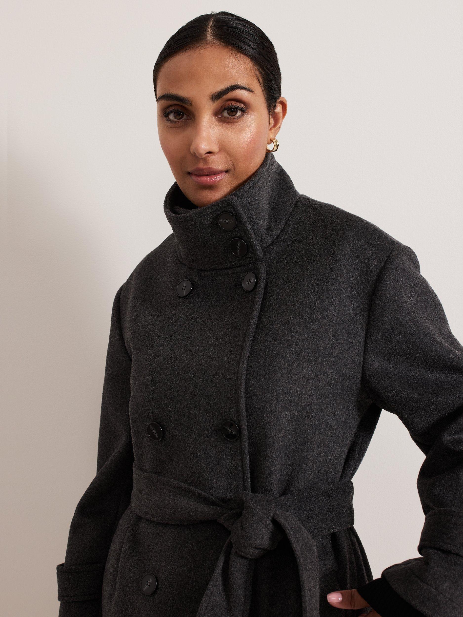 This petite, double-breasted coat is crafted from a warm wool-rich blend with a funnel neck. Featuring adjustable cuffs, drop shoulder seams, tortoiseshell buttons and a matching belt, it falls to a straight midi silhouette for timeless appeal and an effortlessly seasonal look.