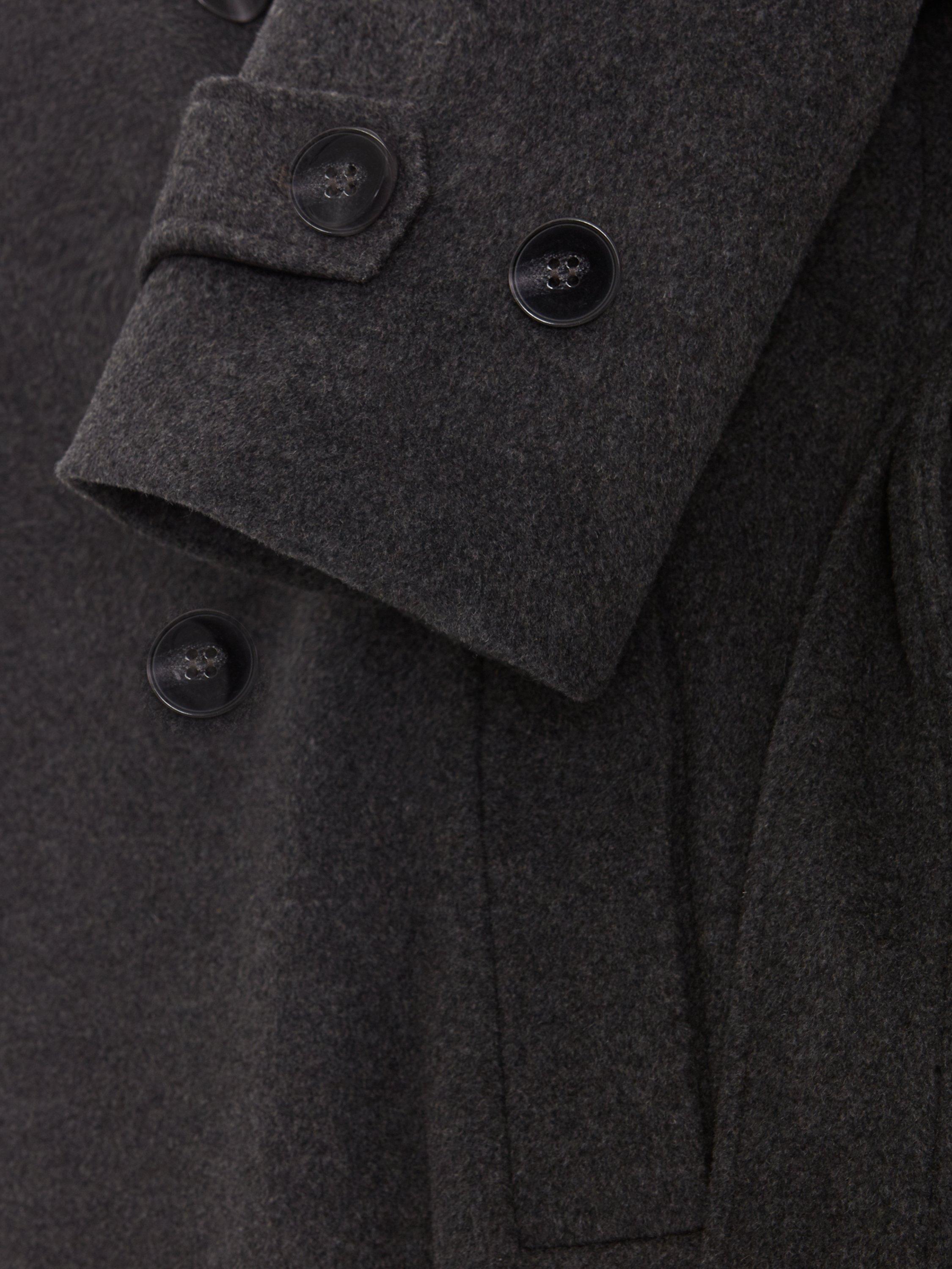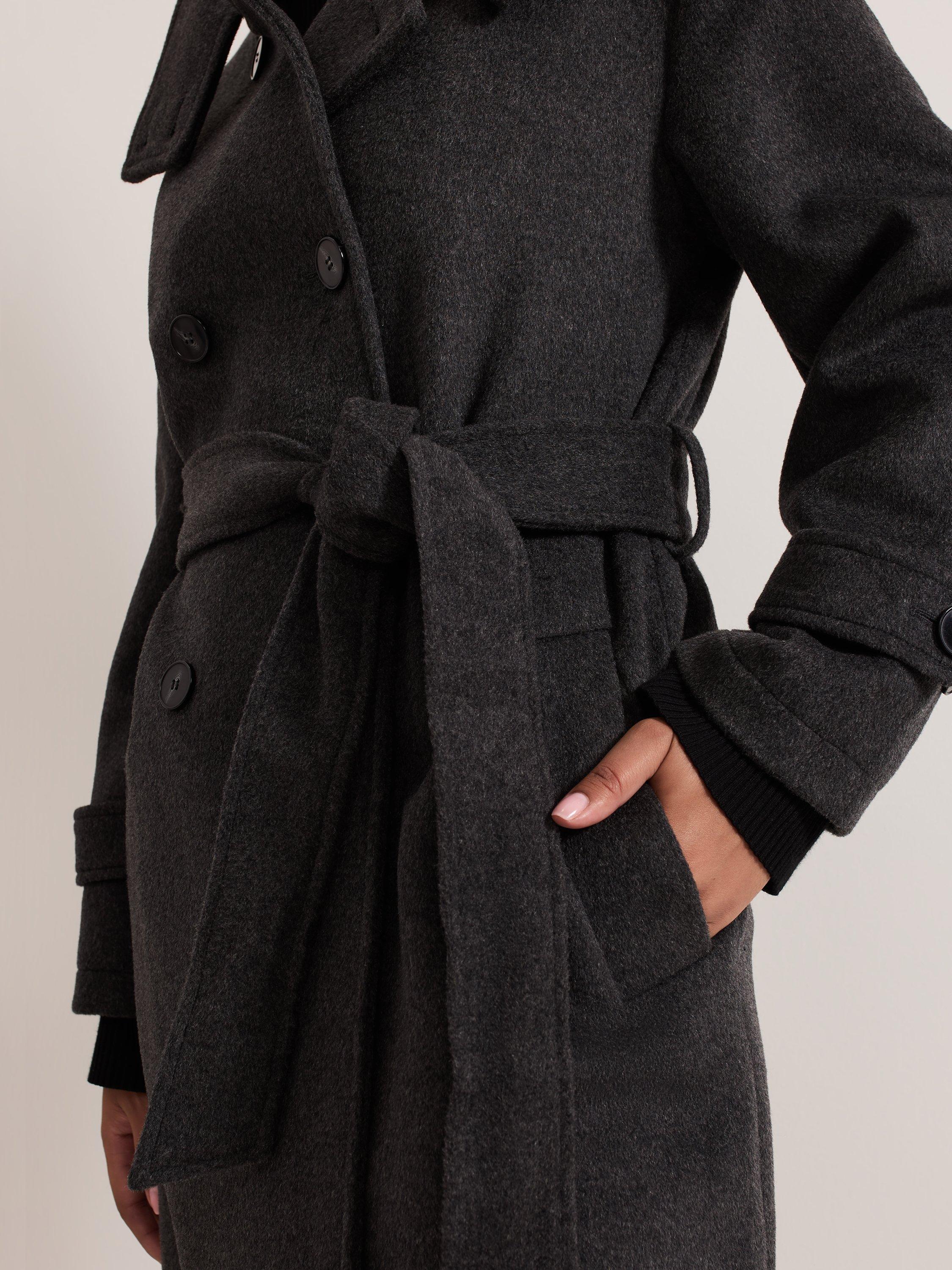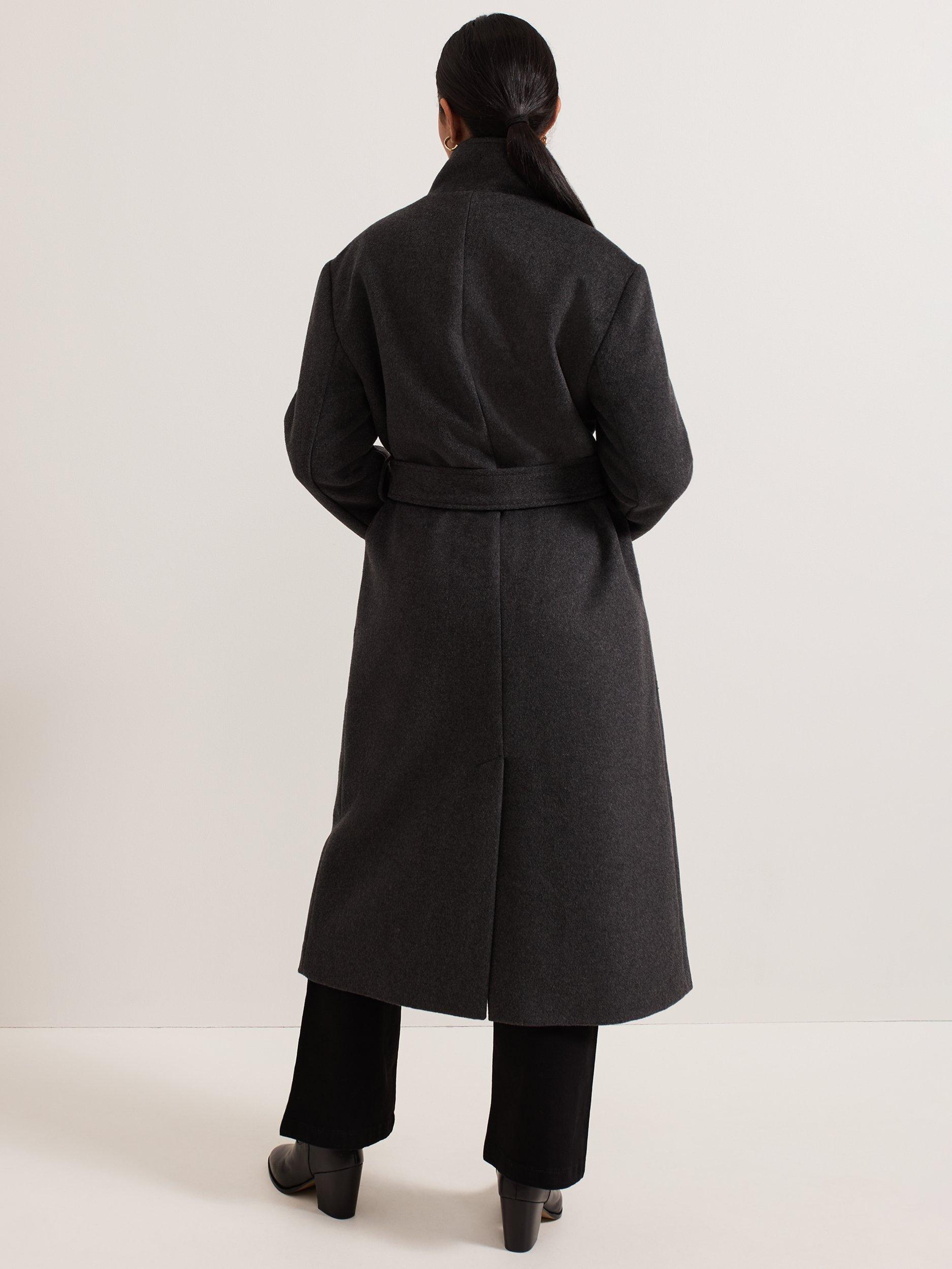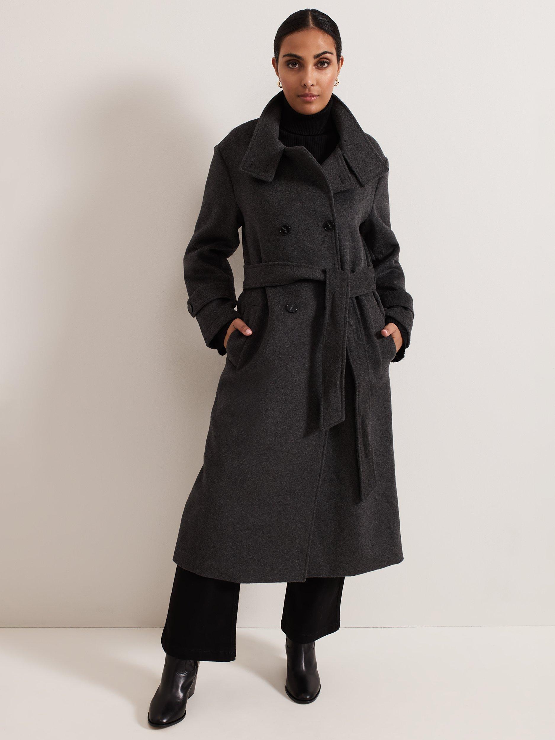 This petite, double-breasted coat is crafted from a warm wool-rich blend with a funnel neck. Featuring adjustable cuffs, drop shoulder seams, tortoiseshell buttons and a matching belt, it falls to a straight midi silhouette for timeless appeal and an effortlessly seasonal look.