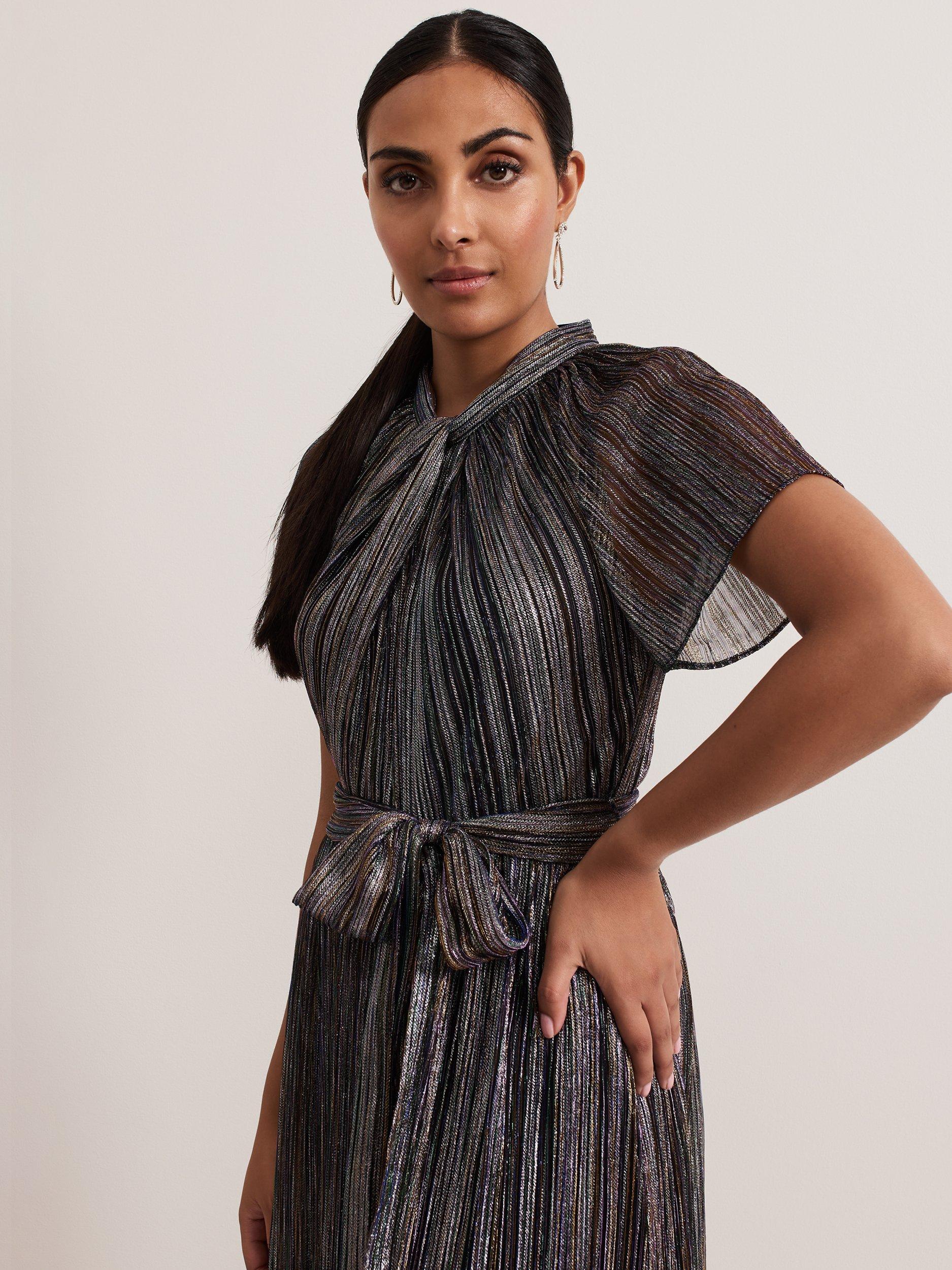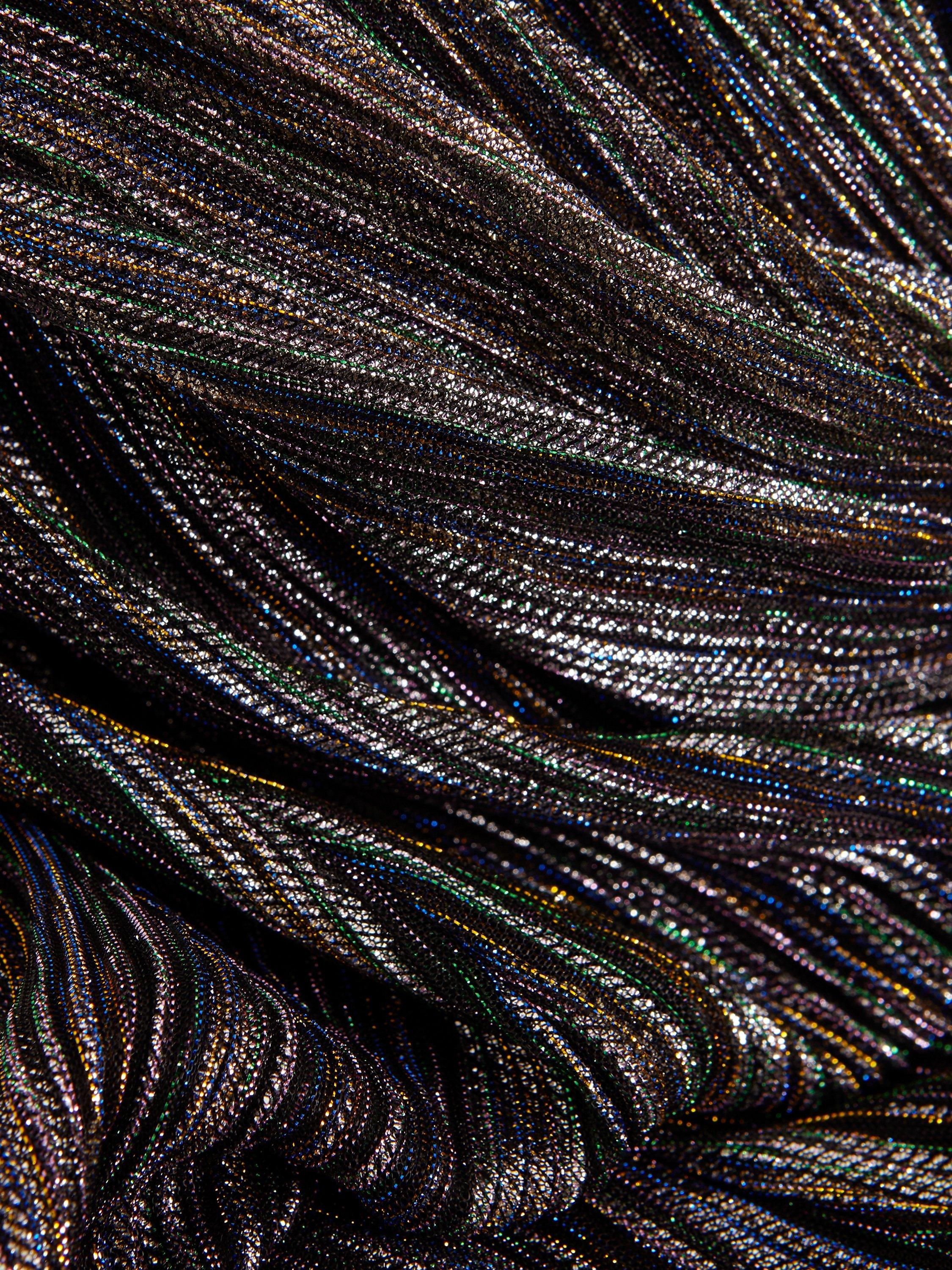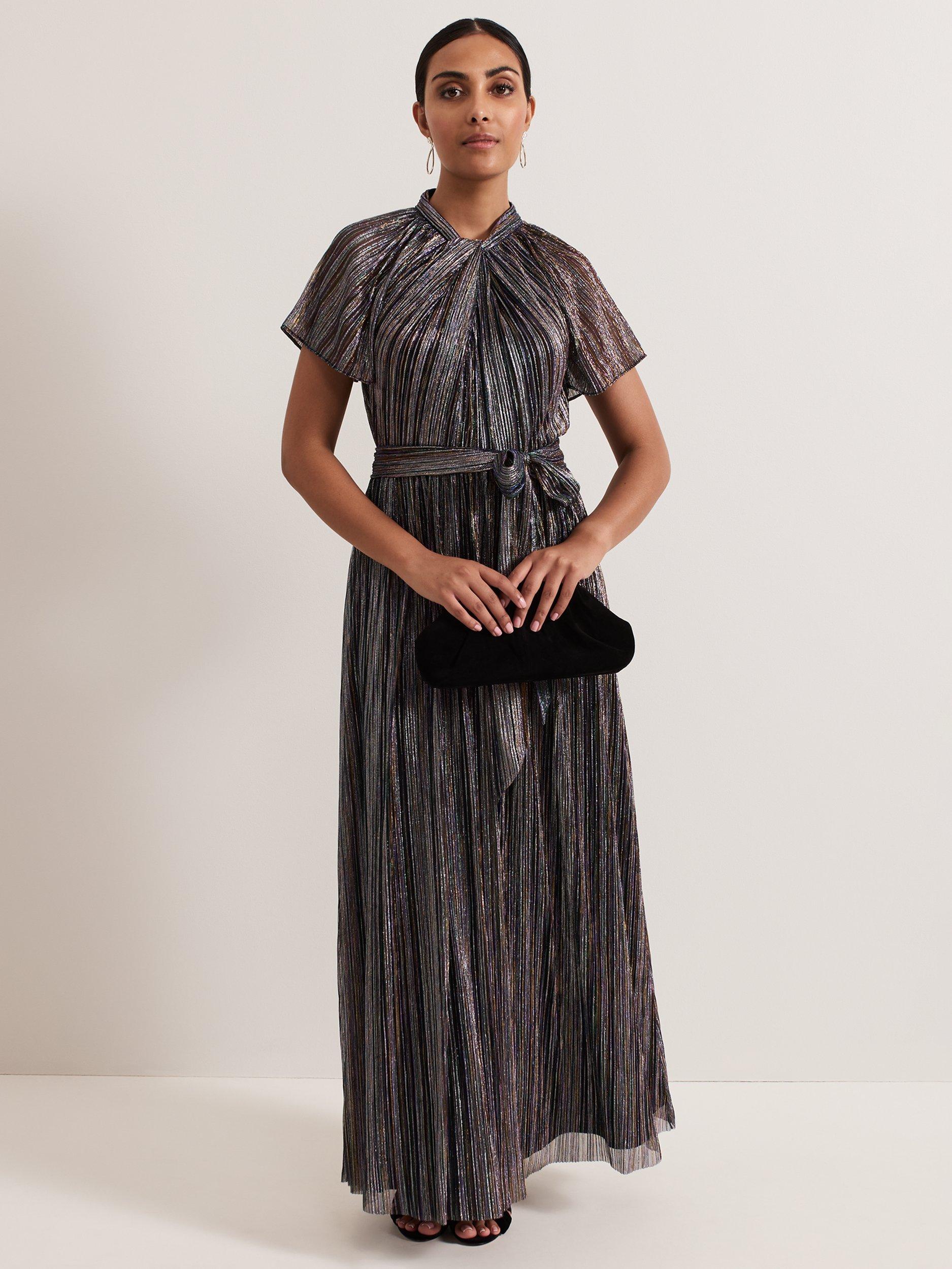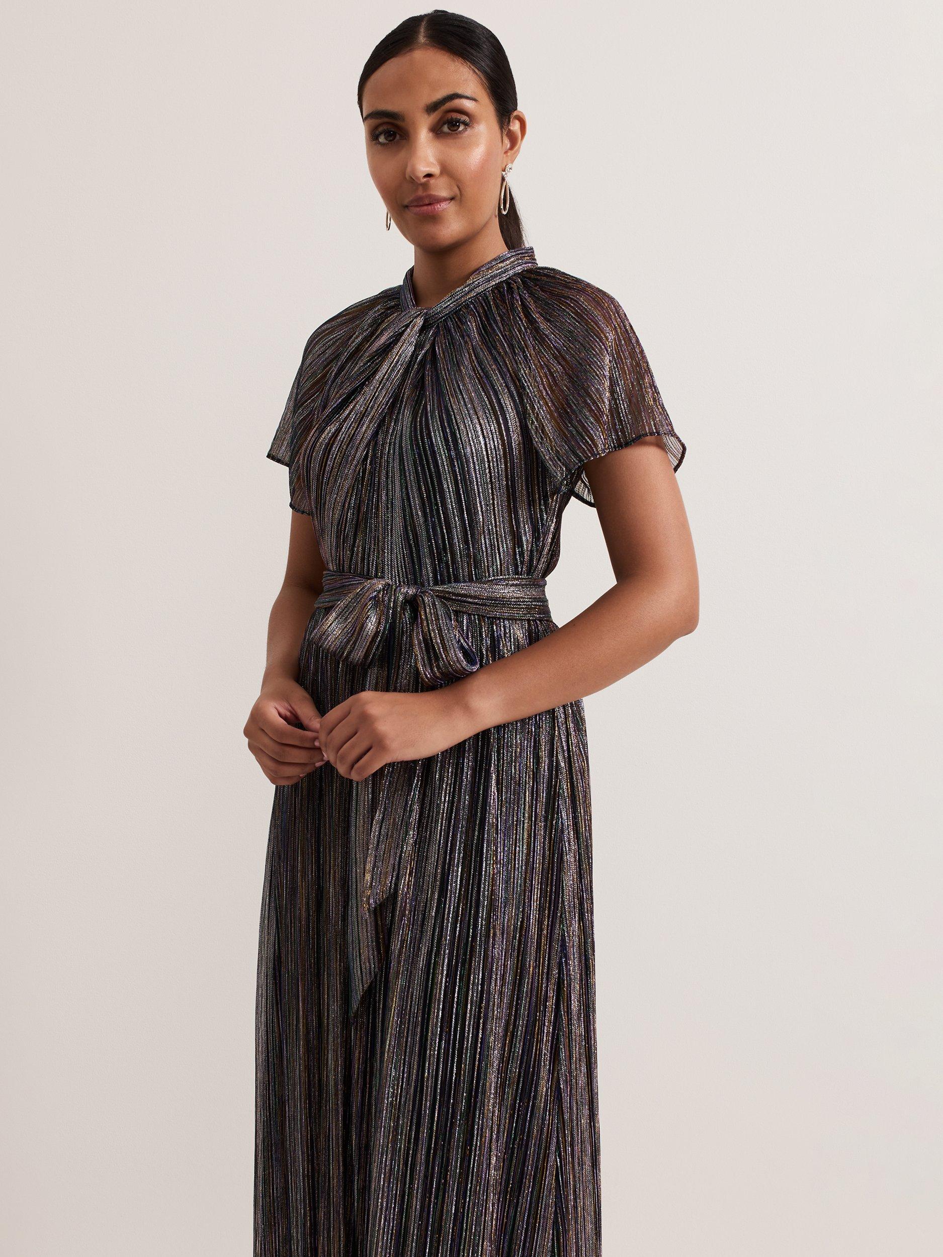 Designed with a multicoloured shimmer overlay, this eye-catching Riah dress features a twist neck, short semi-sheer sleeves and a matching tie belt to highlight the waist, falling to an elegant maxi length. Pair with black heels and a clutch for your next special occasion.