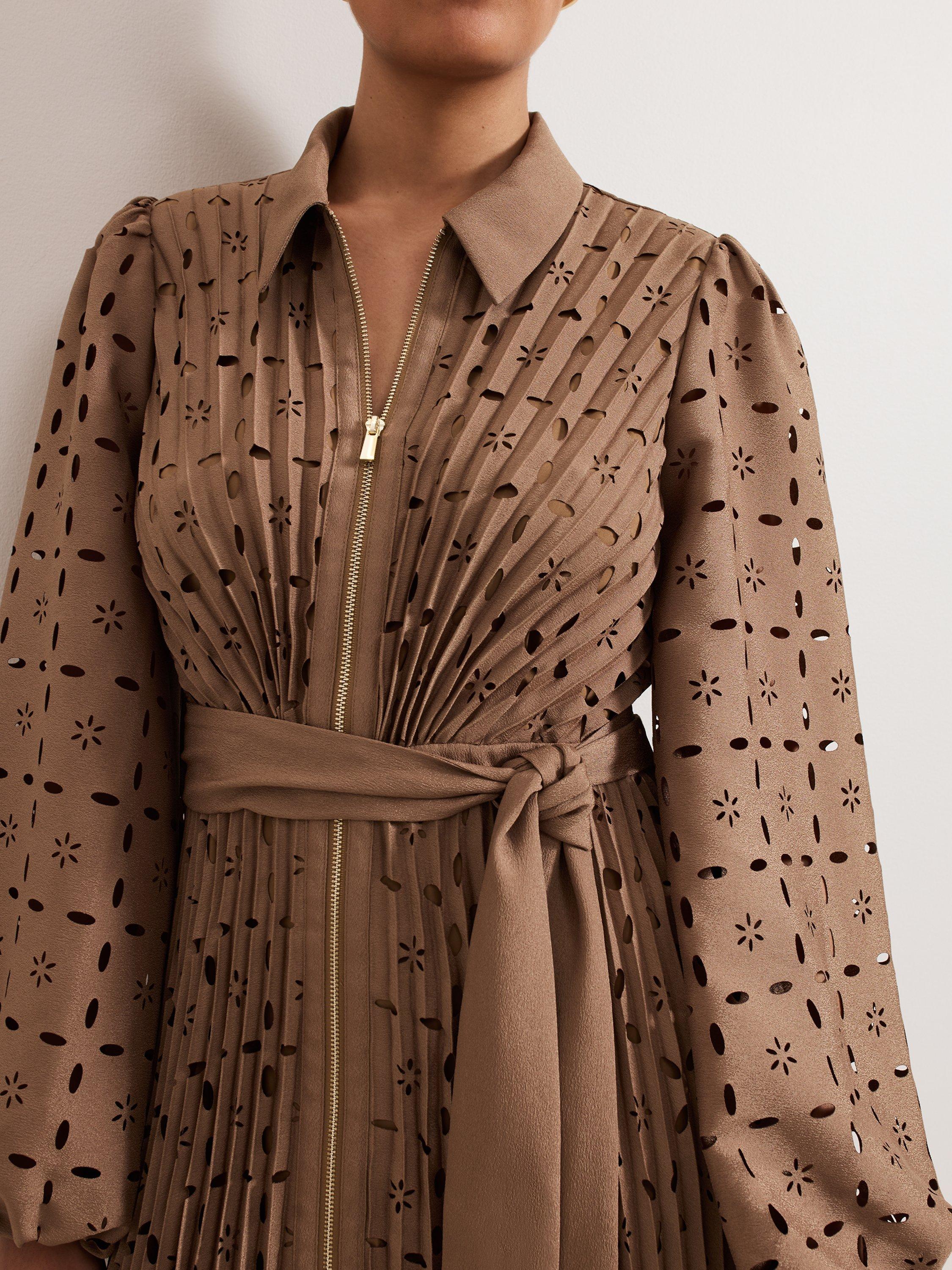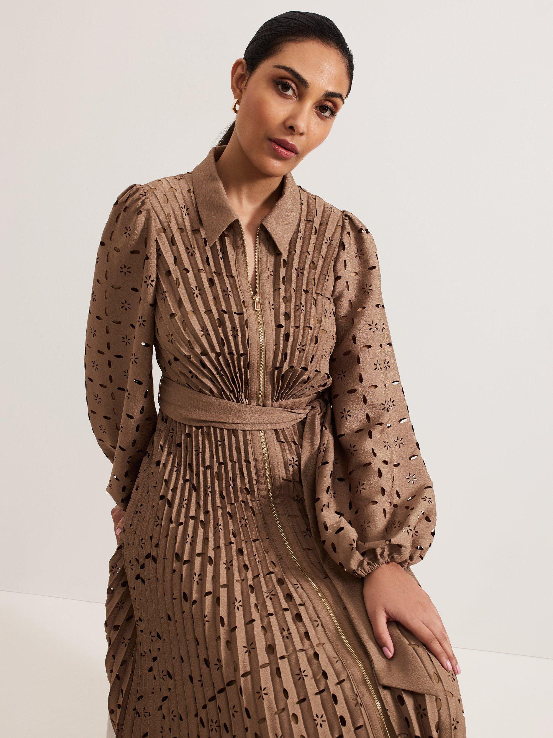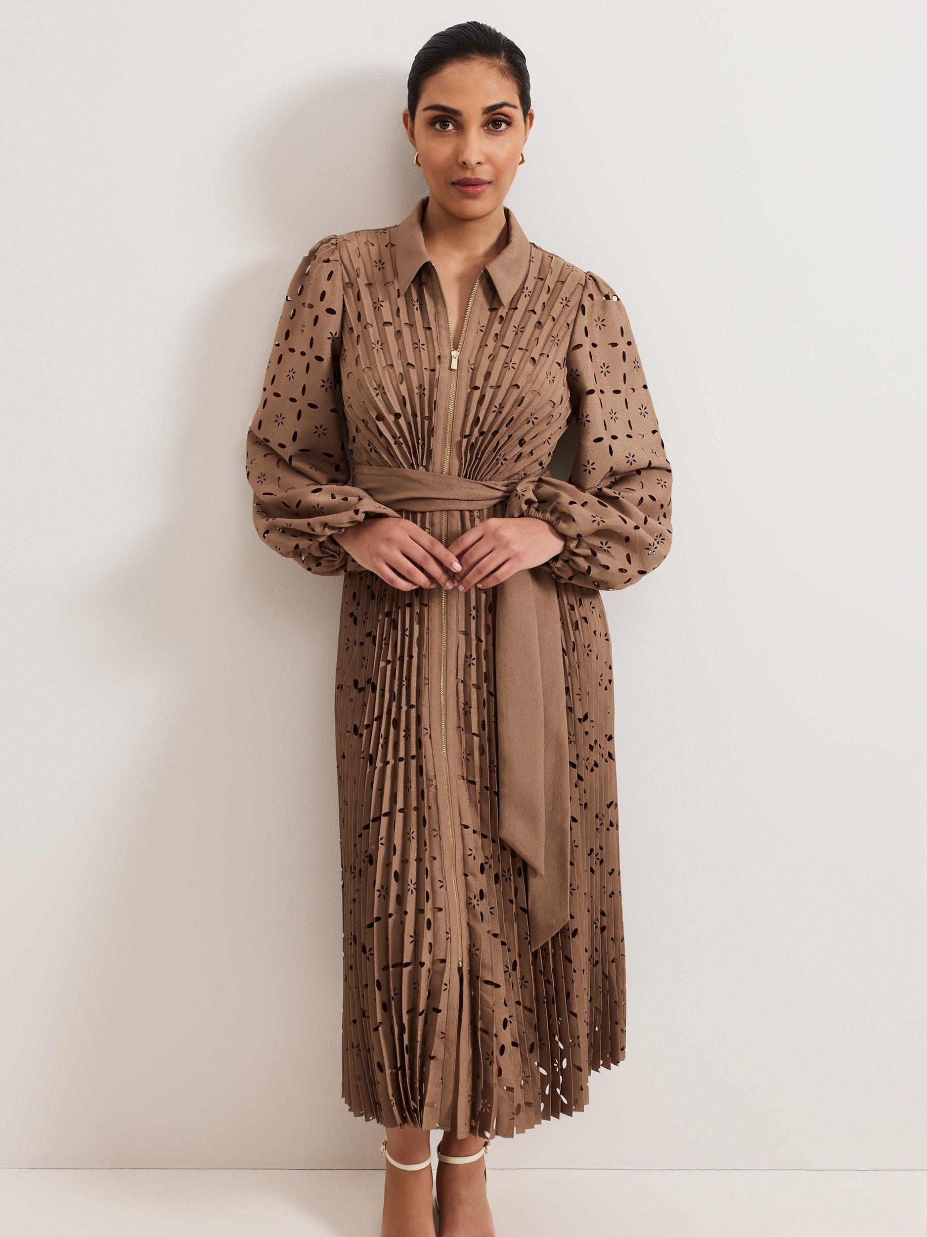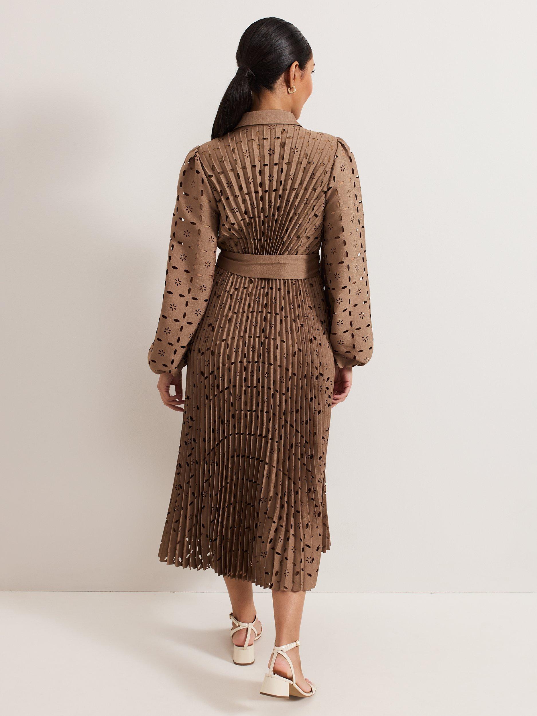 An instant classic thanks to its shirt styling and soft pleating, this petite midi dress from Phase Eight is made from a lightweight fabric. Topped with a collar, long sleeves and a tie at the waist, it's designed with an openwork embroidered detail.