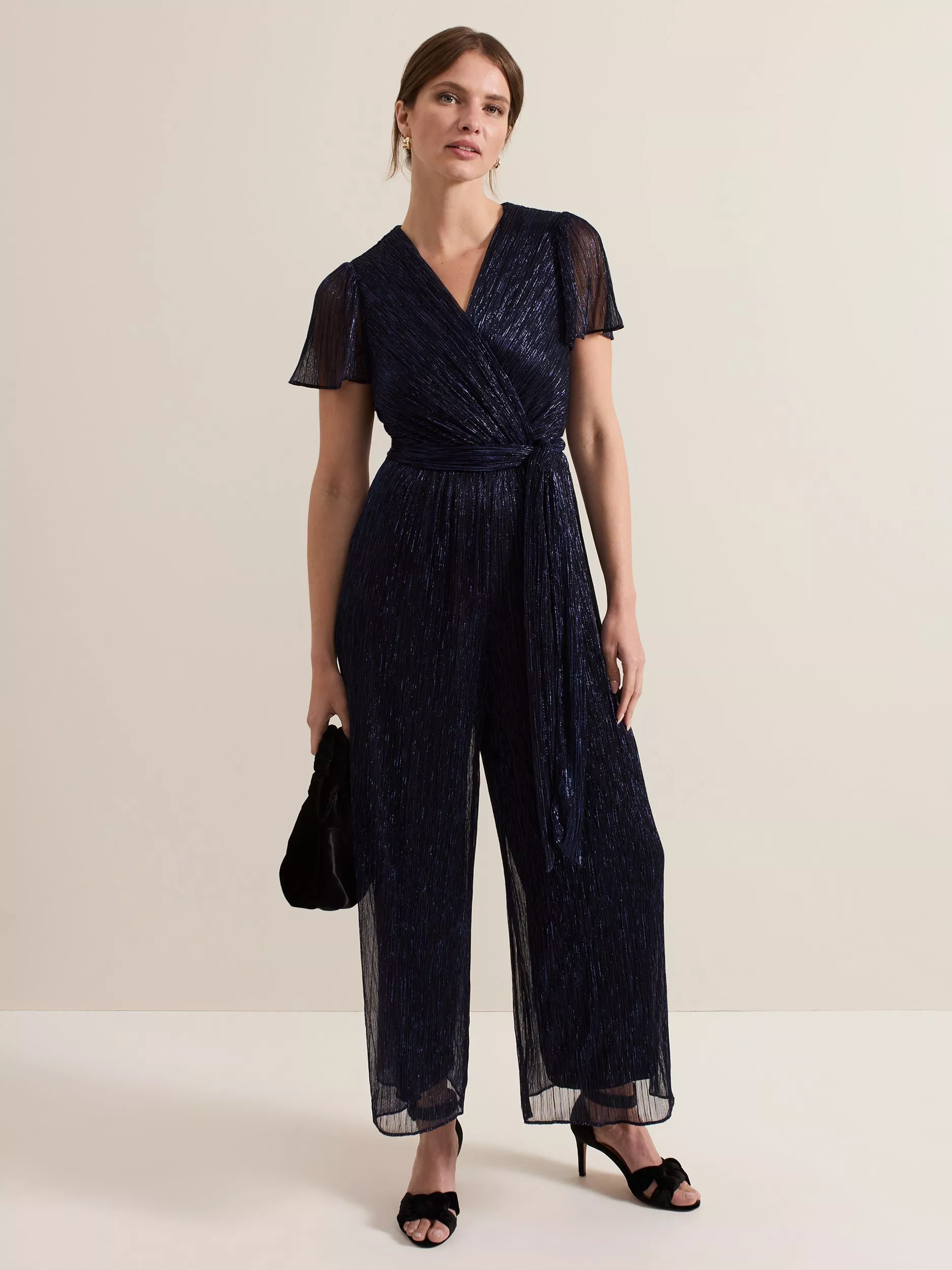 In a classic shade with metallic thread detailing, the Stella jumpsuit features a feminine V-neckline, faux wrap bodice and a plisse material throughout to create beautiful movement. The loose tie belt highlights the cinches the waist before falling to a wide leg silhouette for the perfect event style.