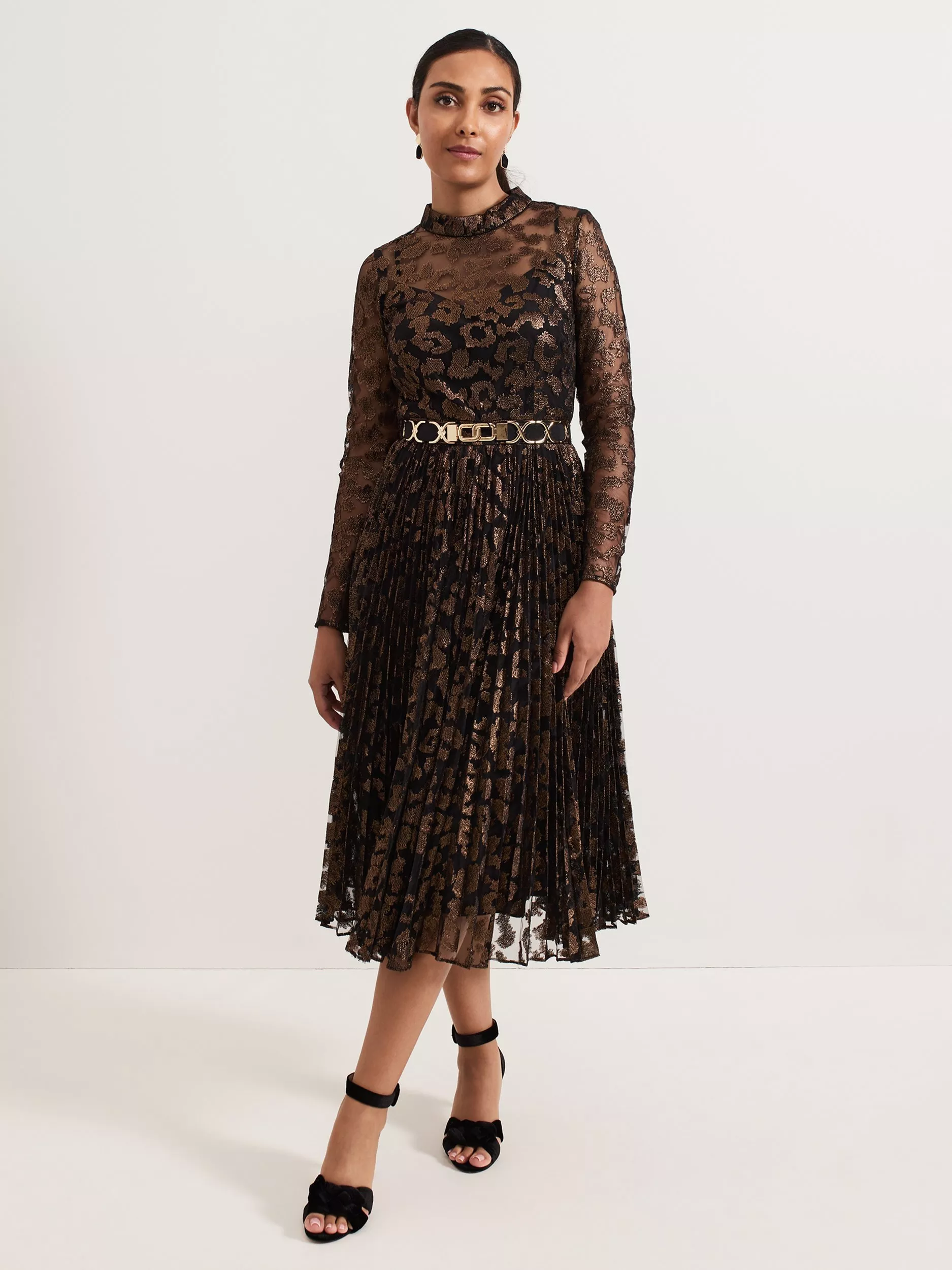 Designed in an on-trend leopard print, the petite Theodora dress requires no additions to make an entrance. Featuring a semi-sheer top with a cami underneath and a gold statement belt, this dress falls to a fully pleated midi skirt. The round neck and keyhole back create an elegant feminine style for all your special occasions.