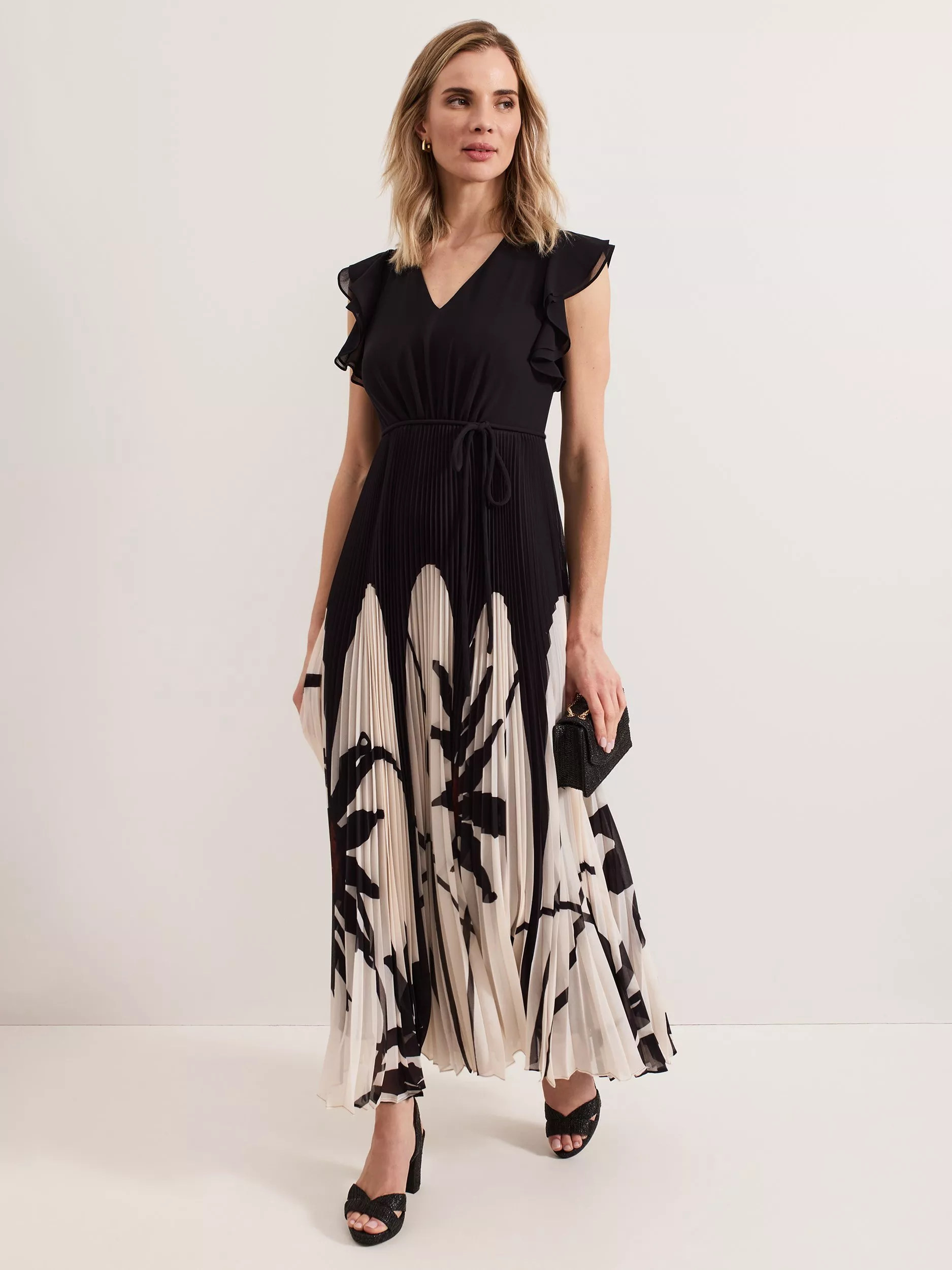 Look no further than the Uma dress for your next event style. Effortlessly elegant, this maxi style features a feminine V-neckline and frilled short sleeves for a playful finish. Elevated with a contemporary floral design, the fully pleated skirt creates beautiful soft movement as you walk. Style with matching accessories for an occasion look you can wear all year round.