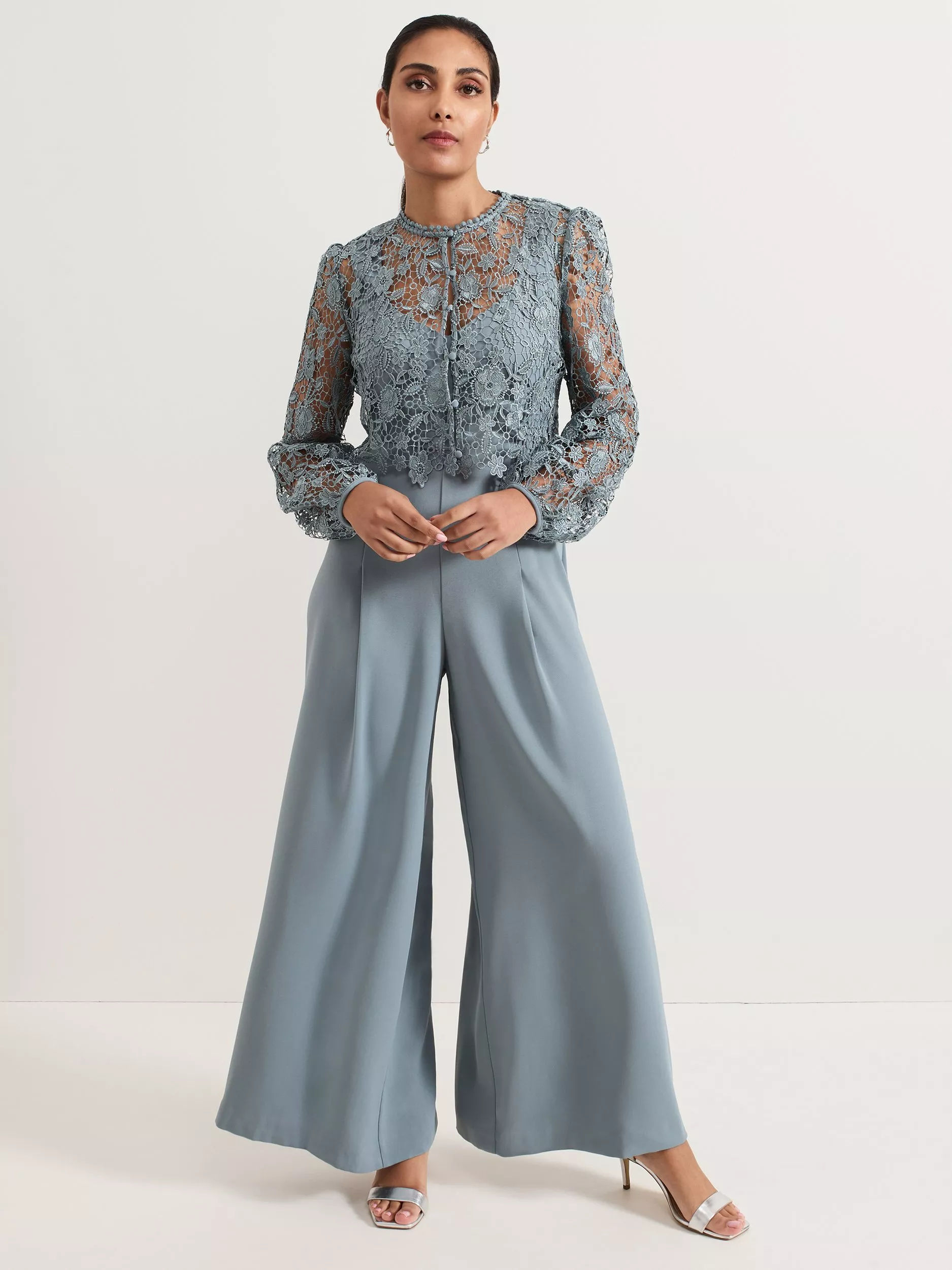 Embrace elegance with the Vanessa jumpsuit. Featuring a feminine sweetheart neckline, this jumpsuit flares through to a flowing wide-leg silhouette with structured front pleats. The matching lace overlay provides a sophisticated finish to this event style that would make a perfect mother-of-the-bride look.
