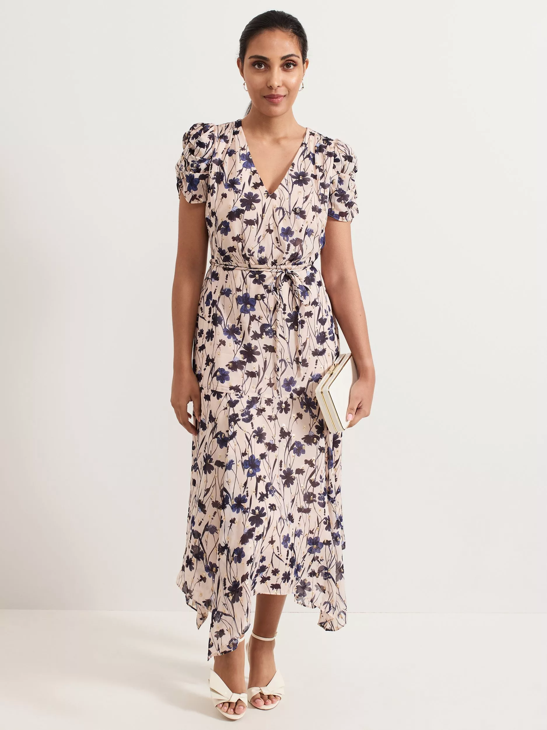 Embrace florals with the elegant Verity dress. Full of beautiful detailing, this midi dress has ruched sleeves to create a gathered effect, falling to a midi length with an asymmetric hem. Flecks of detailing subtly catch the light as you move, making it the perfect feminine style for all your upcoming occasions.