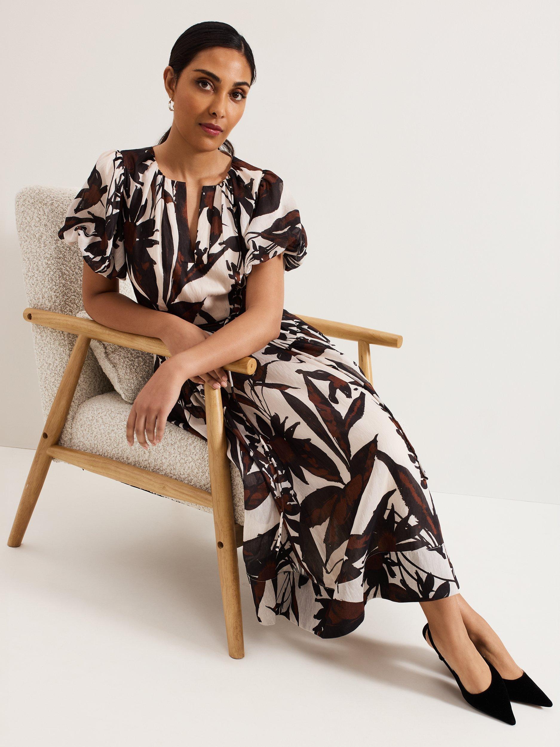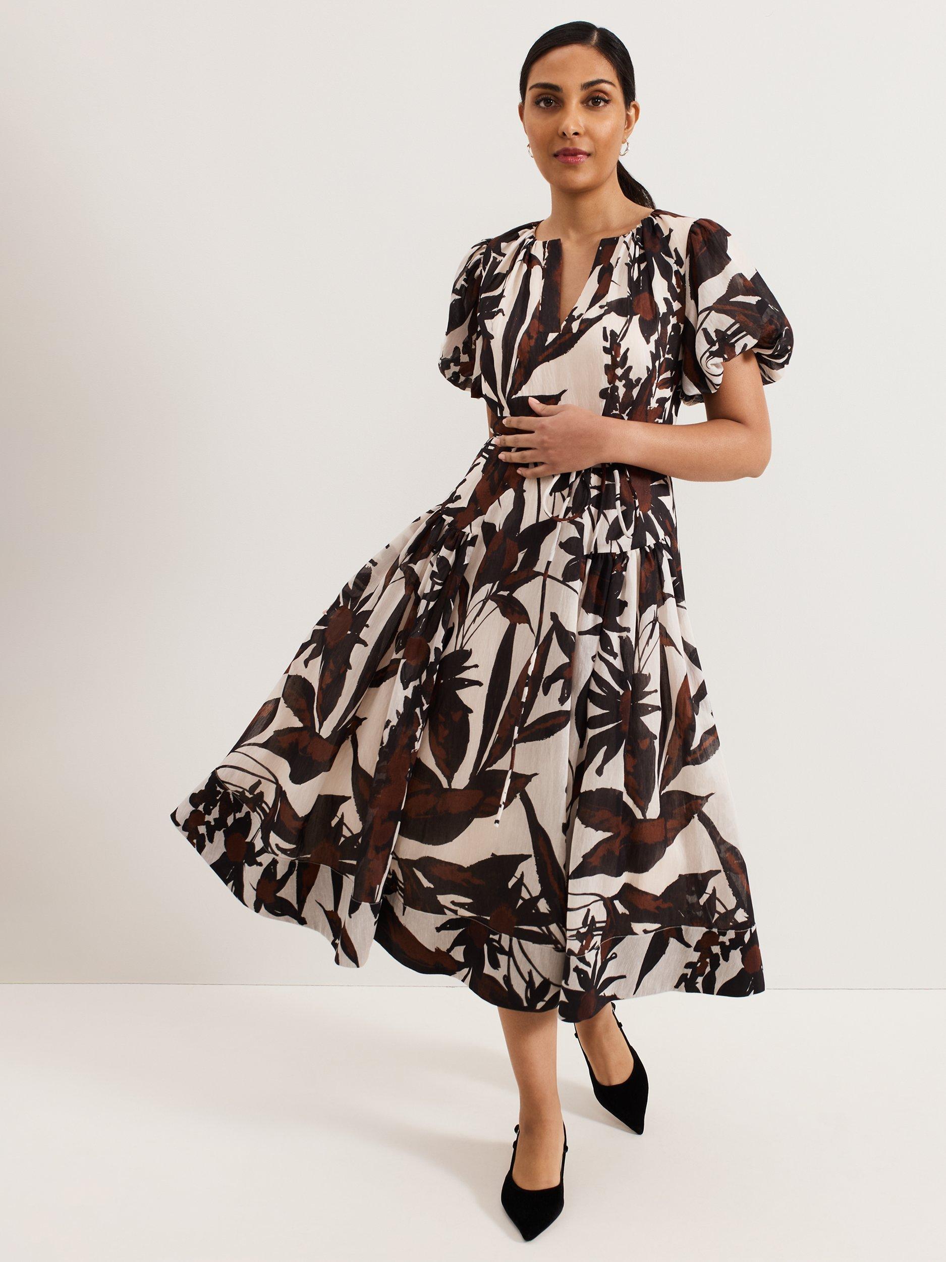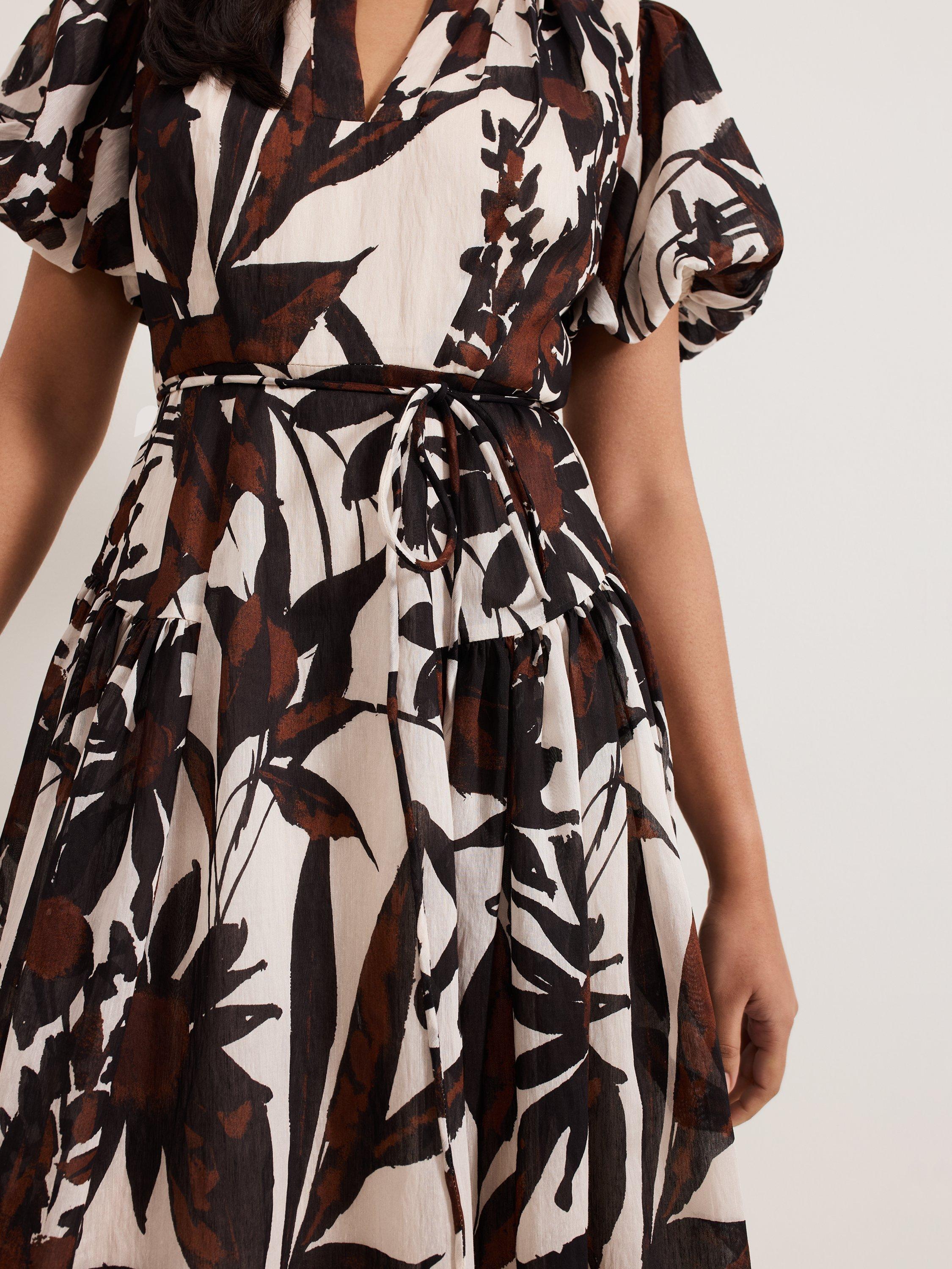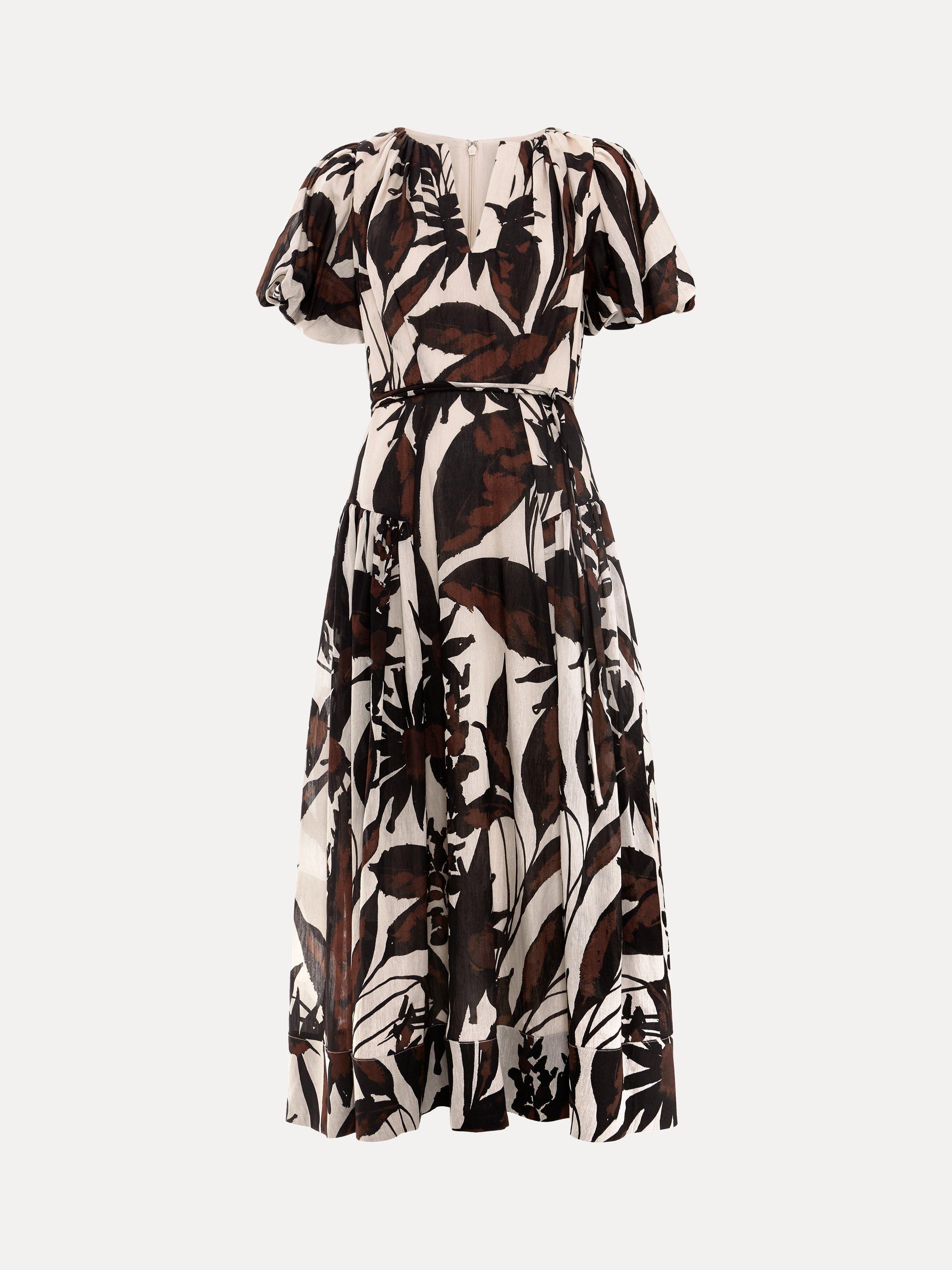 Meet the Zarah dress, a fresh take on monochromatic style. Designed with a contemporary leaf design, this dress features a dropped waist that elongates the midi silhouette, flowing through to a subtly pleated skirt that moves with you. Feminine details, including the V-neckline and elegant puff sleeves, provide subtle structure and shape to create a modern style you'll wear for seasons to come.TENCEL™ Lyocell fibres used in this product are extracted from sustainable wood pulp and are produced through an environmentally responsible, closed loop fibre process.
