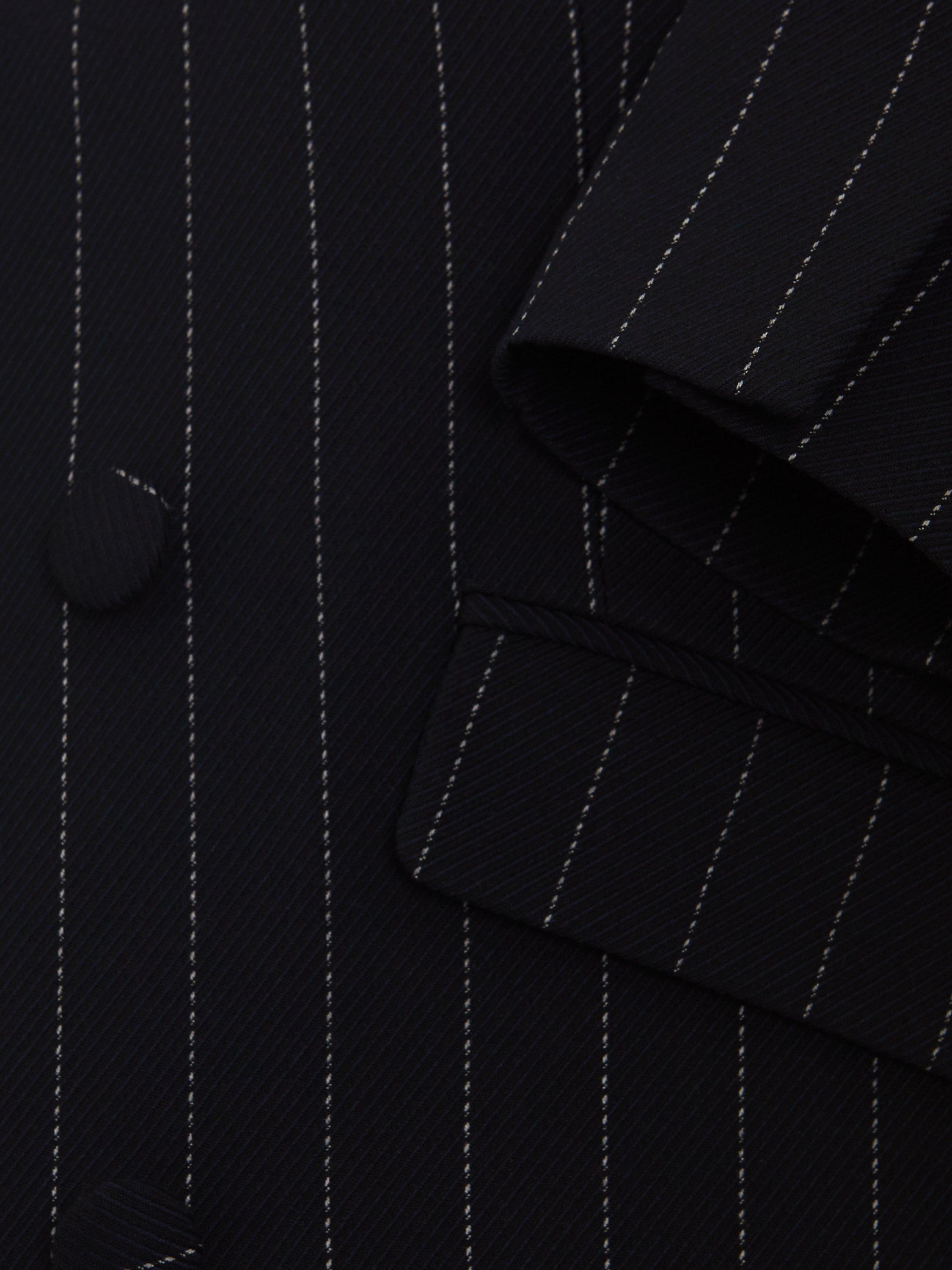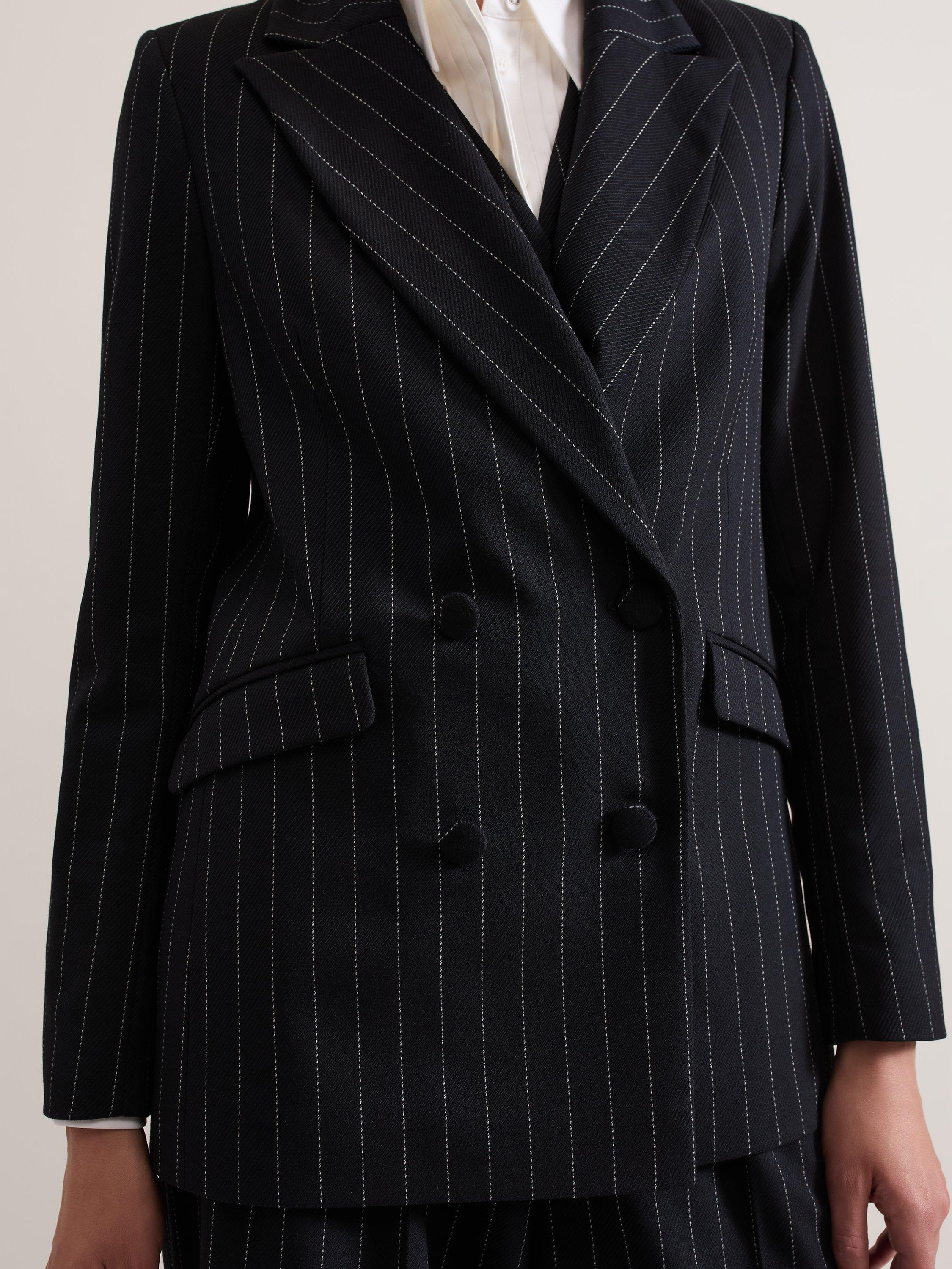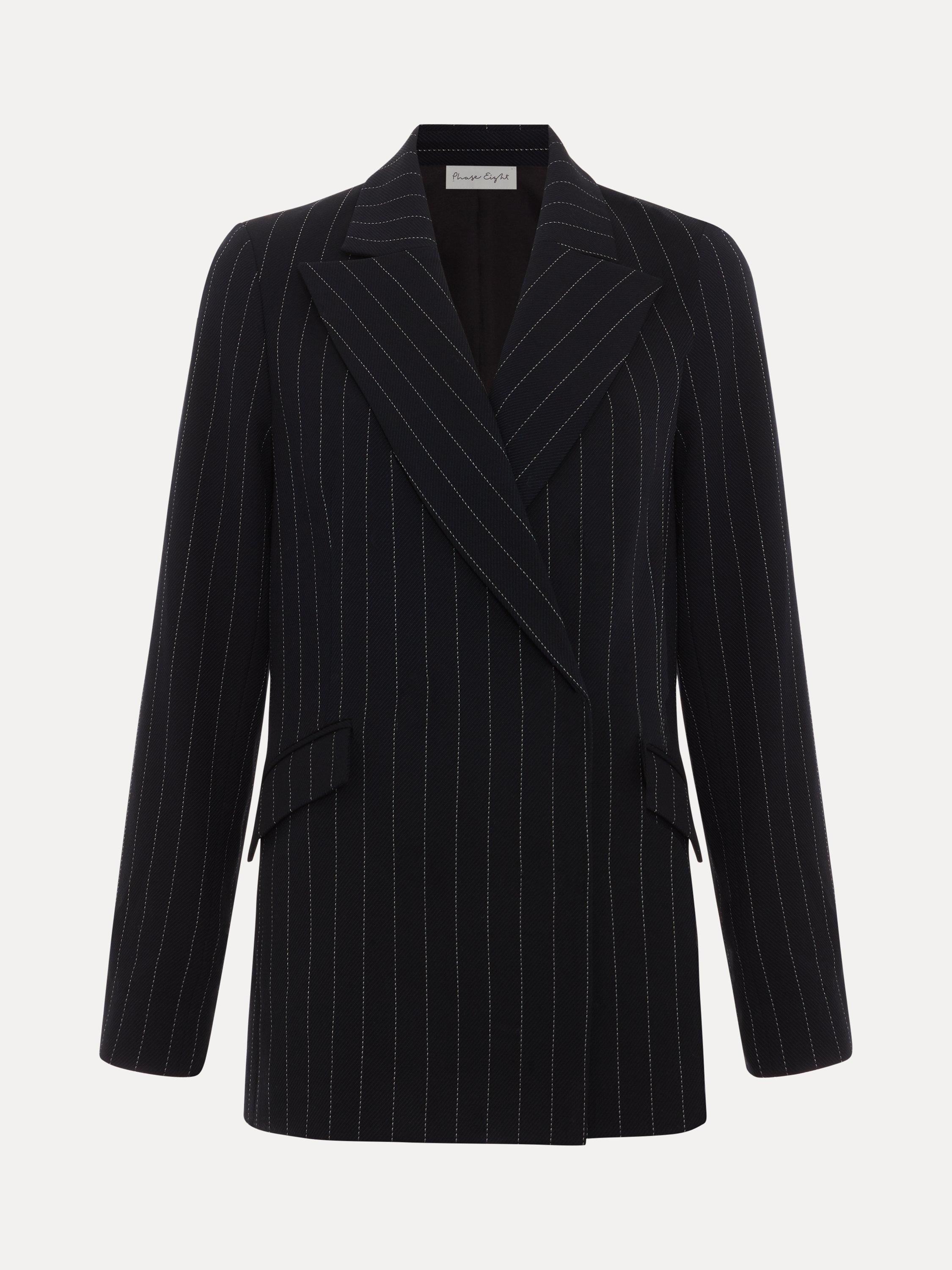 Designed in a classic pinstripe, this double breasted Pia blazer features a notched collar and flap pockets.