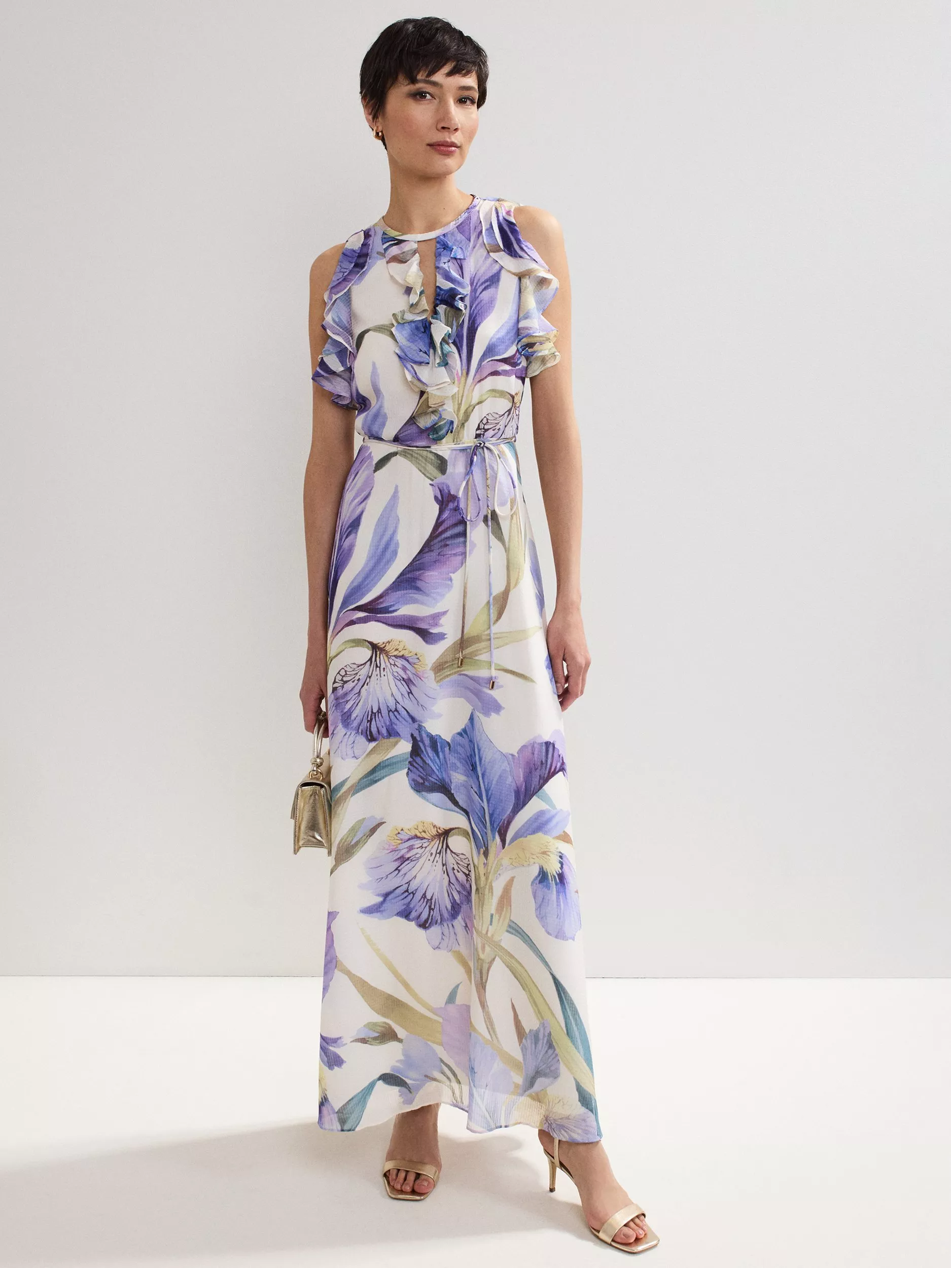 Beautiful spring florals decorate the Rachel dress, perfect for weddings and special occasions alike. The sleeveless shape is emphasised by feminine ruffle detailing, flowing through to a fluid maxi silhouette for beautiful movement. Style with matching gold accessories for an elevated event look you'll turn to time and time again.