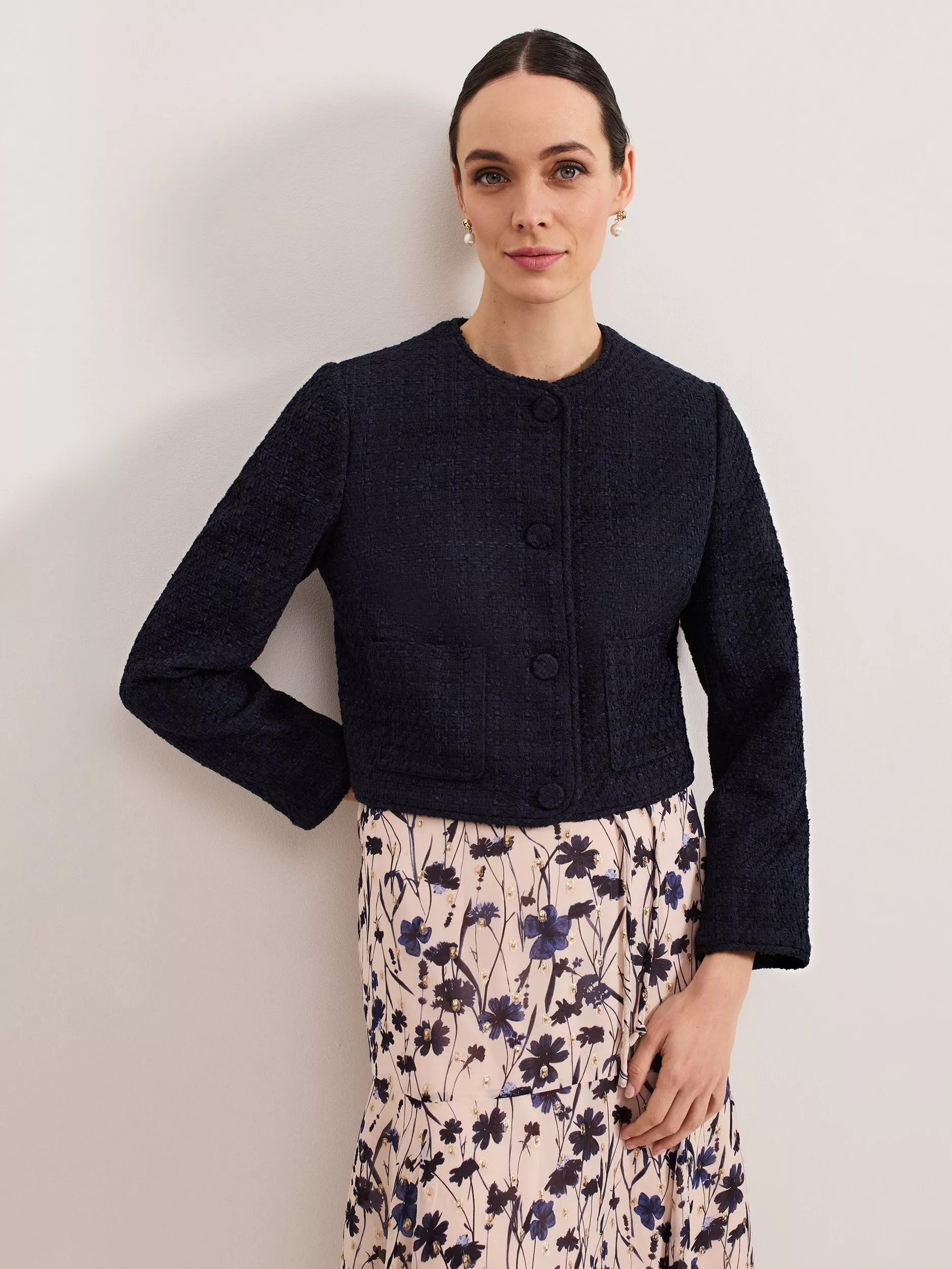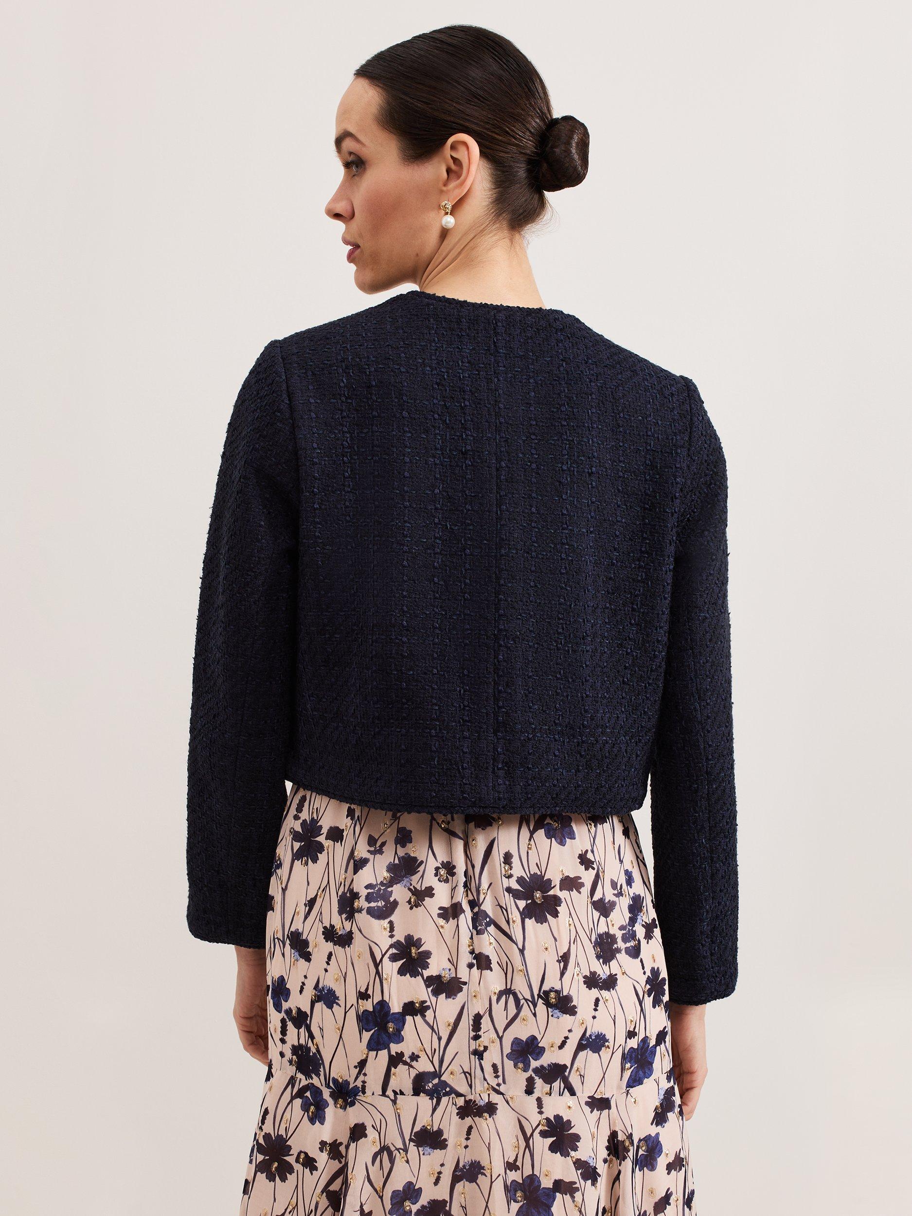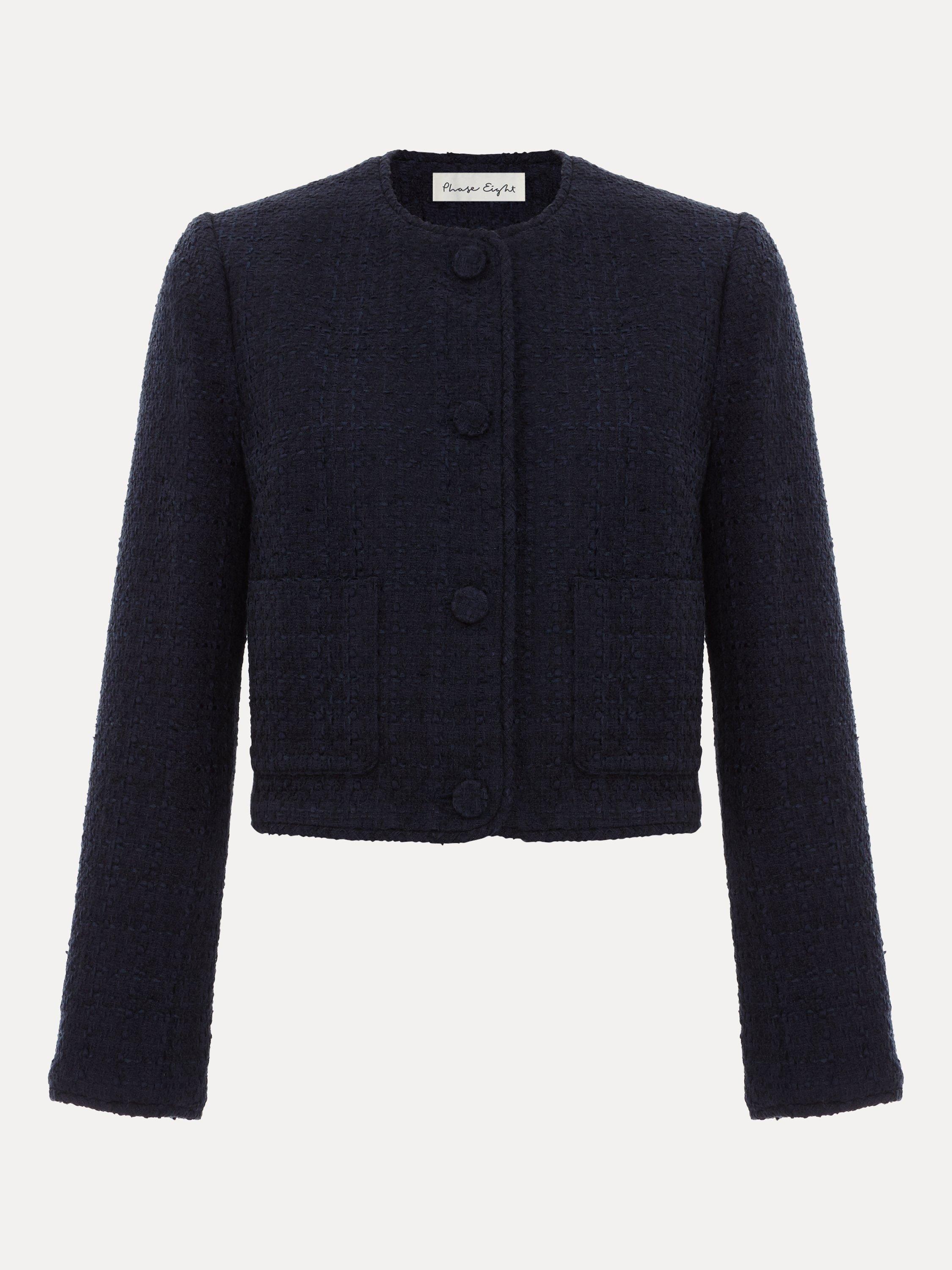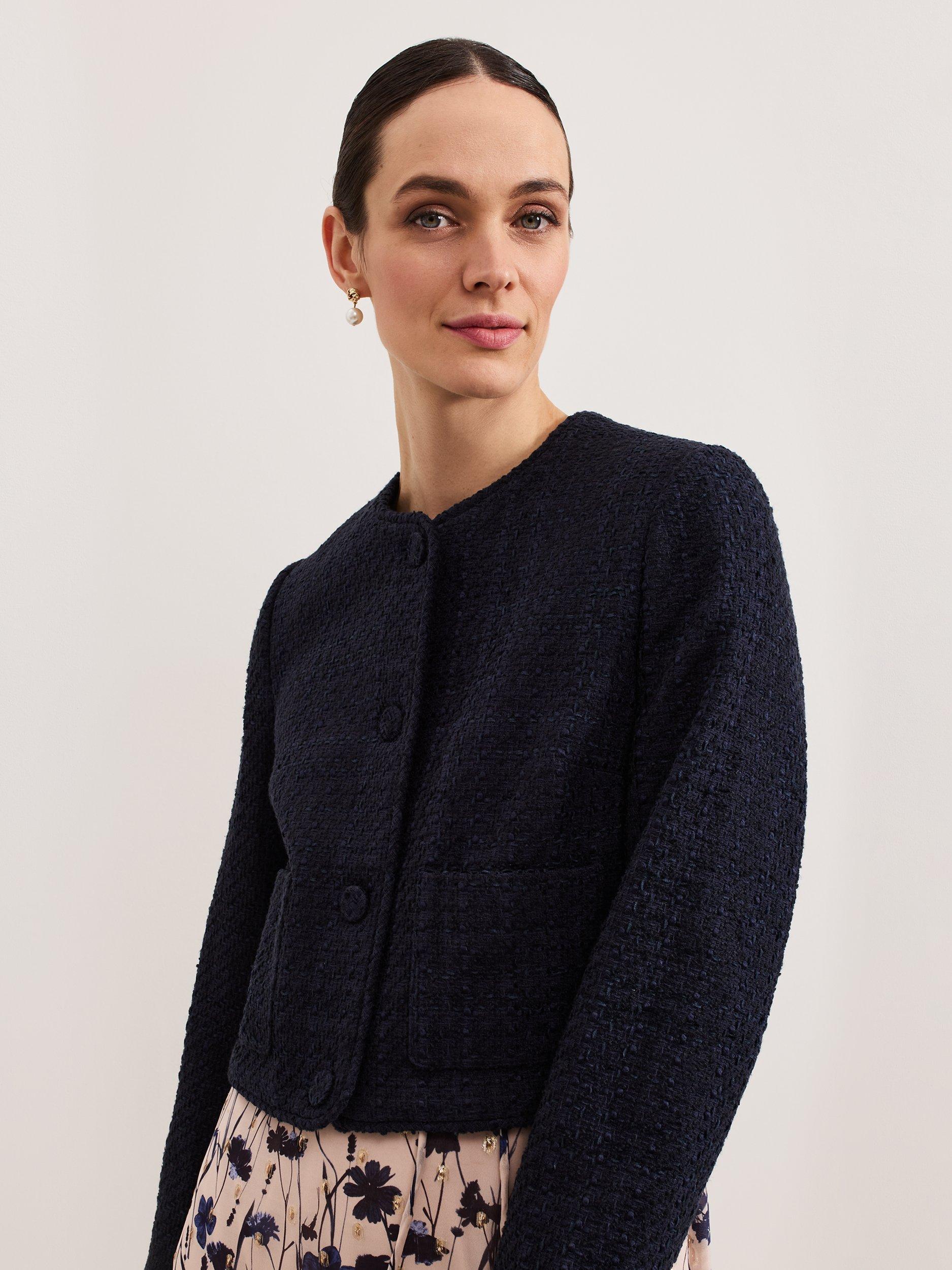 The Ripley jacket is a timeless style to add to your outerwear rotation. With a cropped silhouette, this jacket features a subtle texture for added interest, finished with matching covered buttons and patch pockets. Style over your favourite event outfit or trousers or for a sophisticated look, day or night.