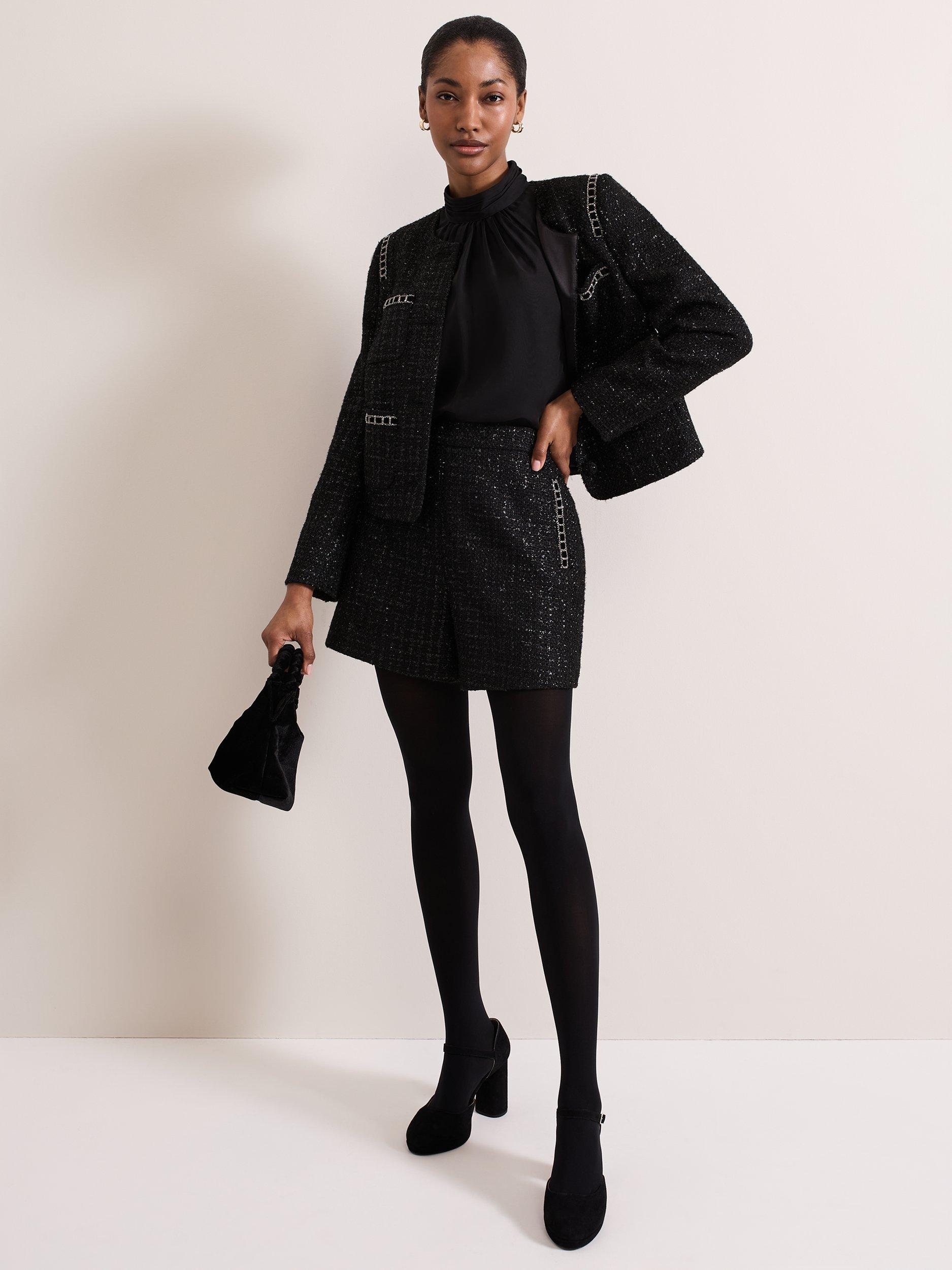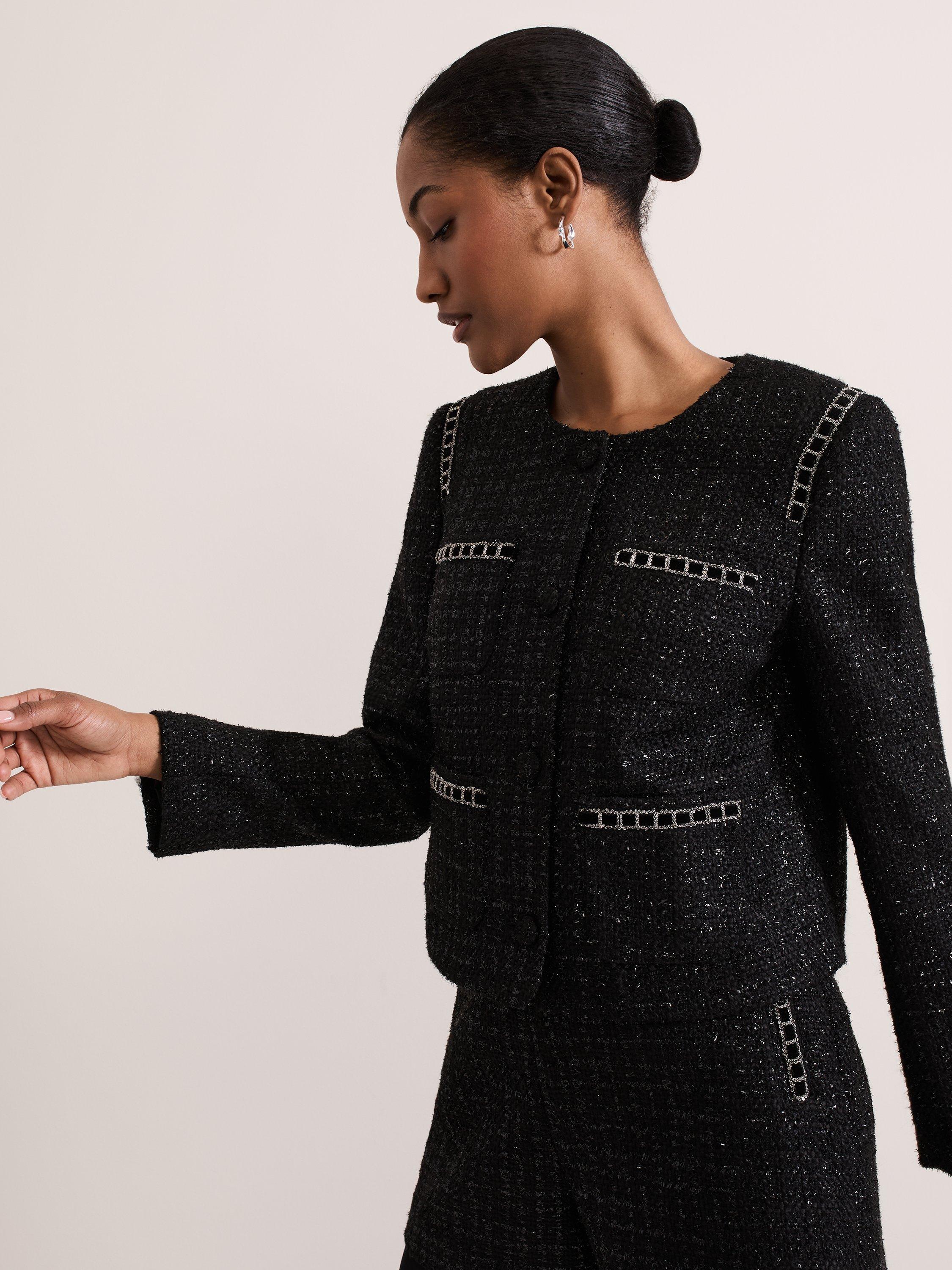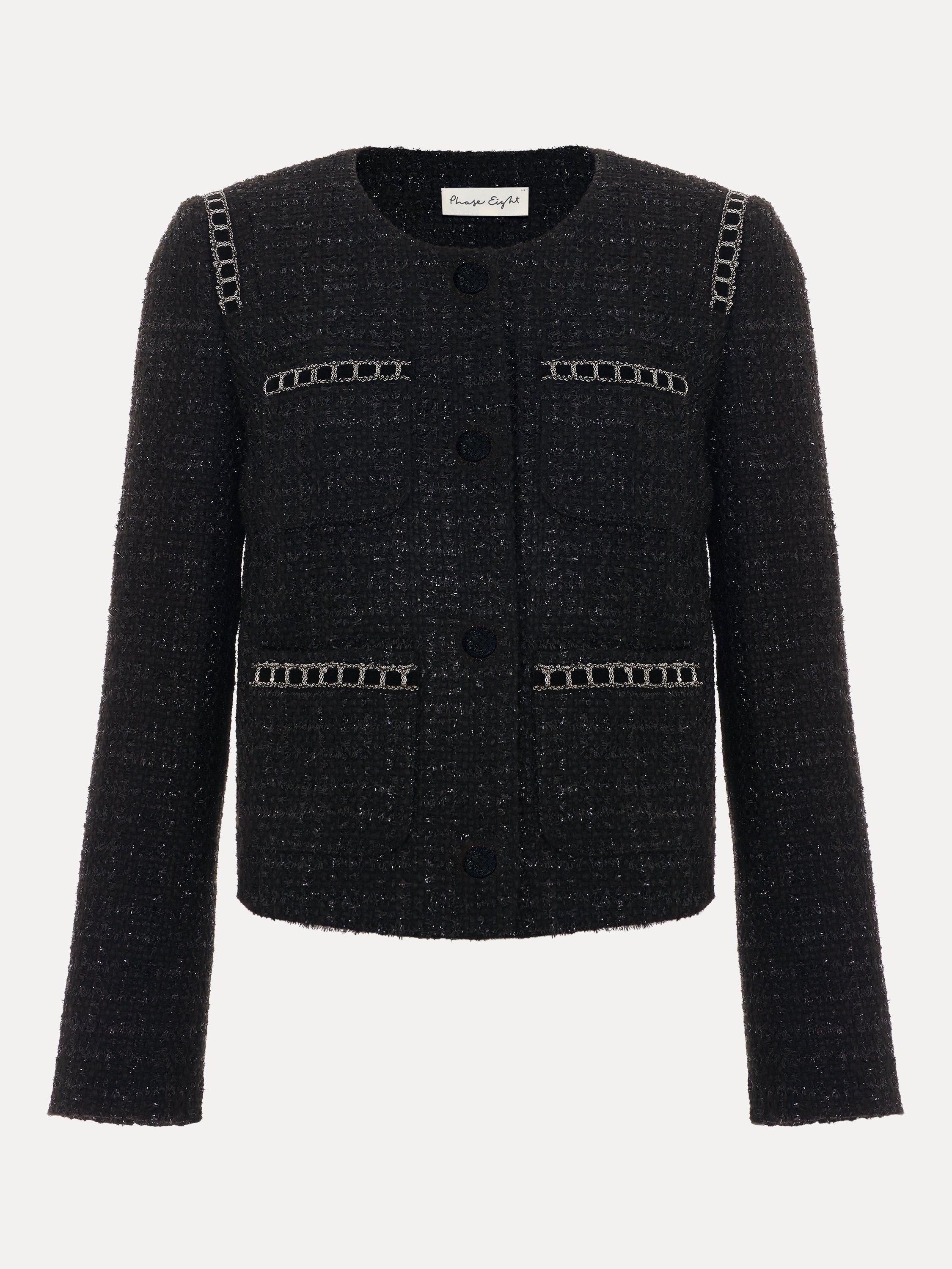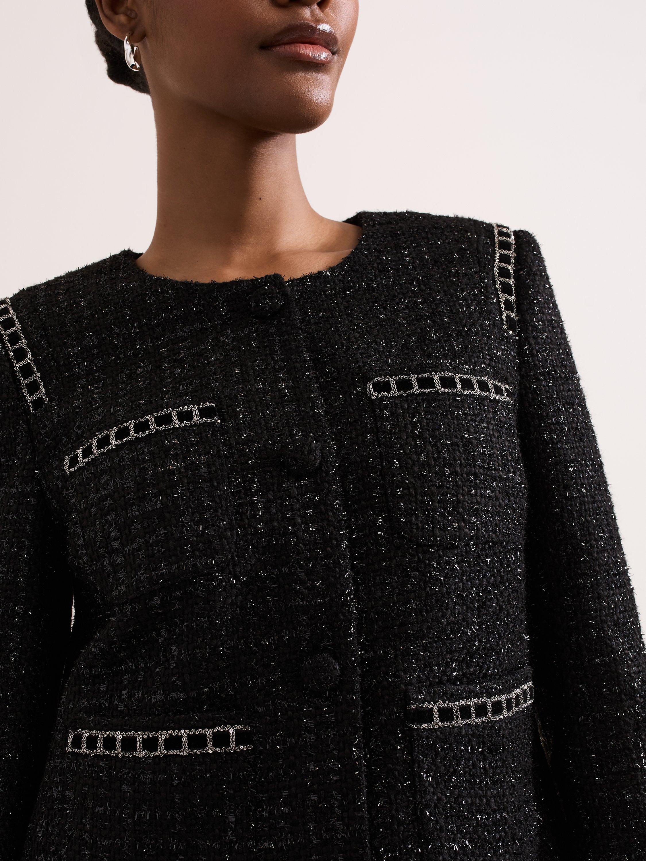 Designed with metallic thread detailing, our Ripley jacket features pockets embellished by black velvet ribbon and silver chain detailing and covered buttons to create the perfect style to elevate all your outfits.