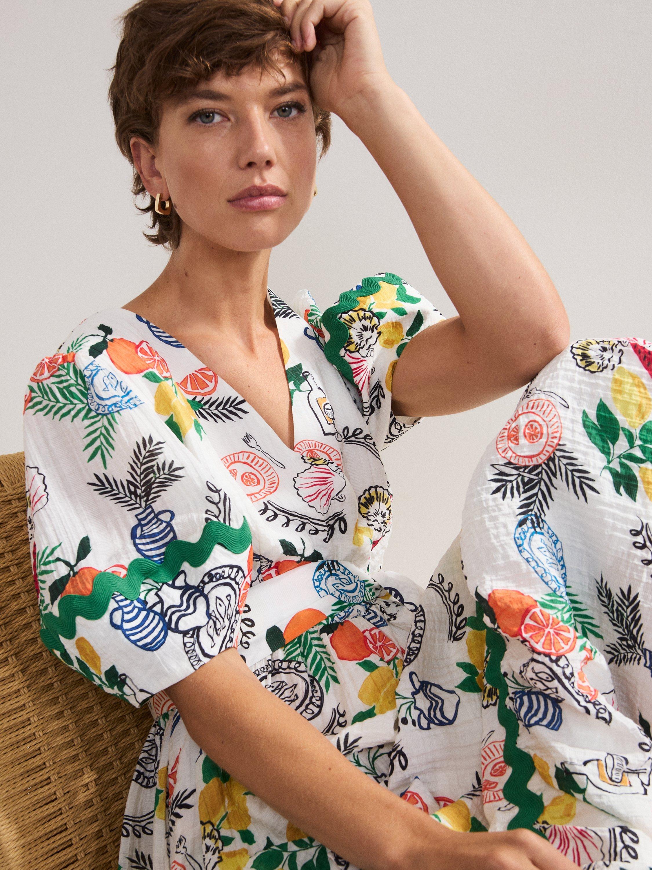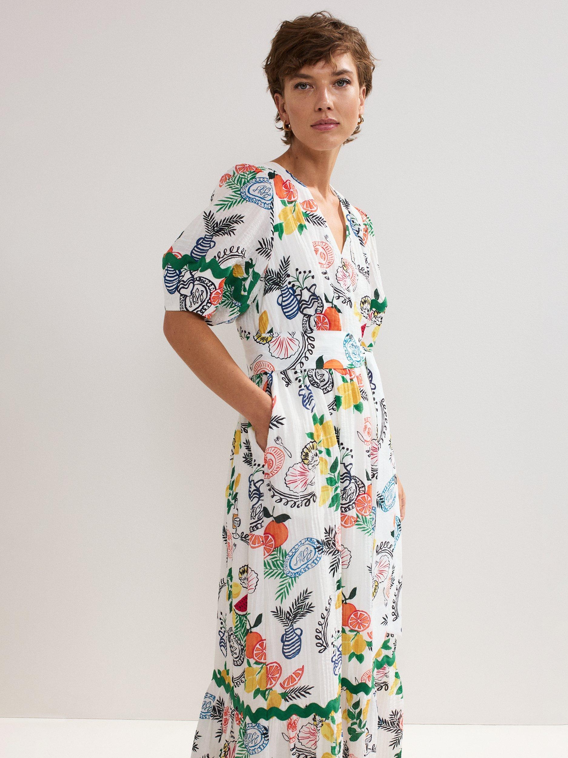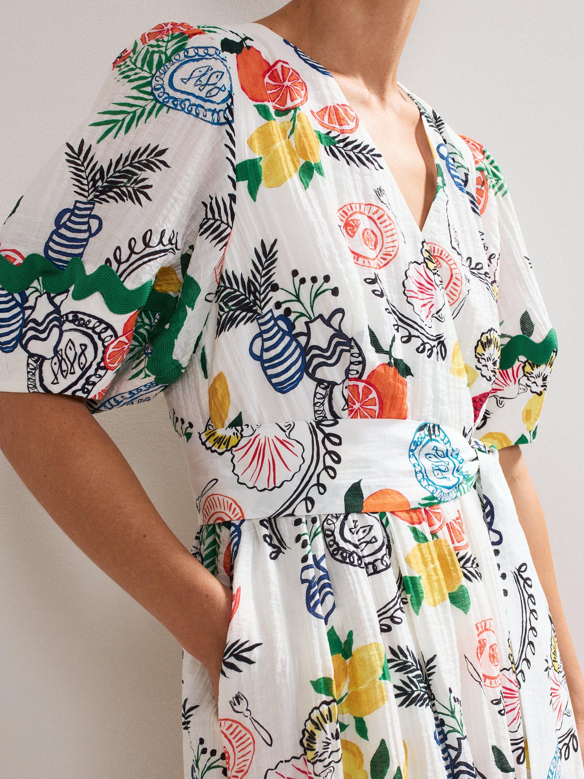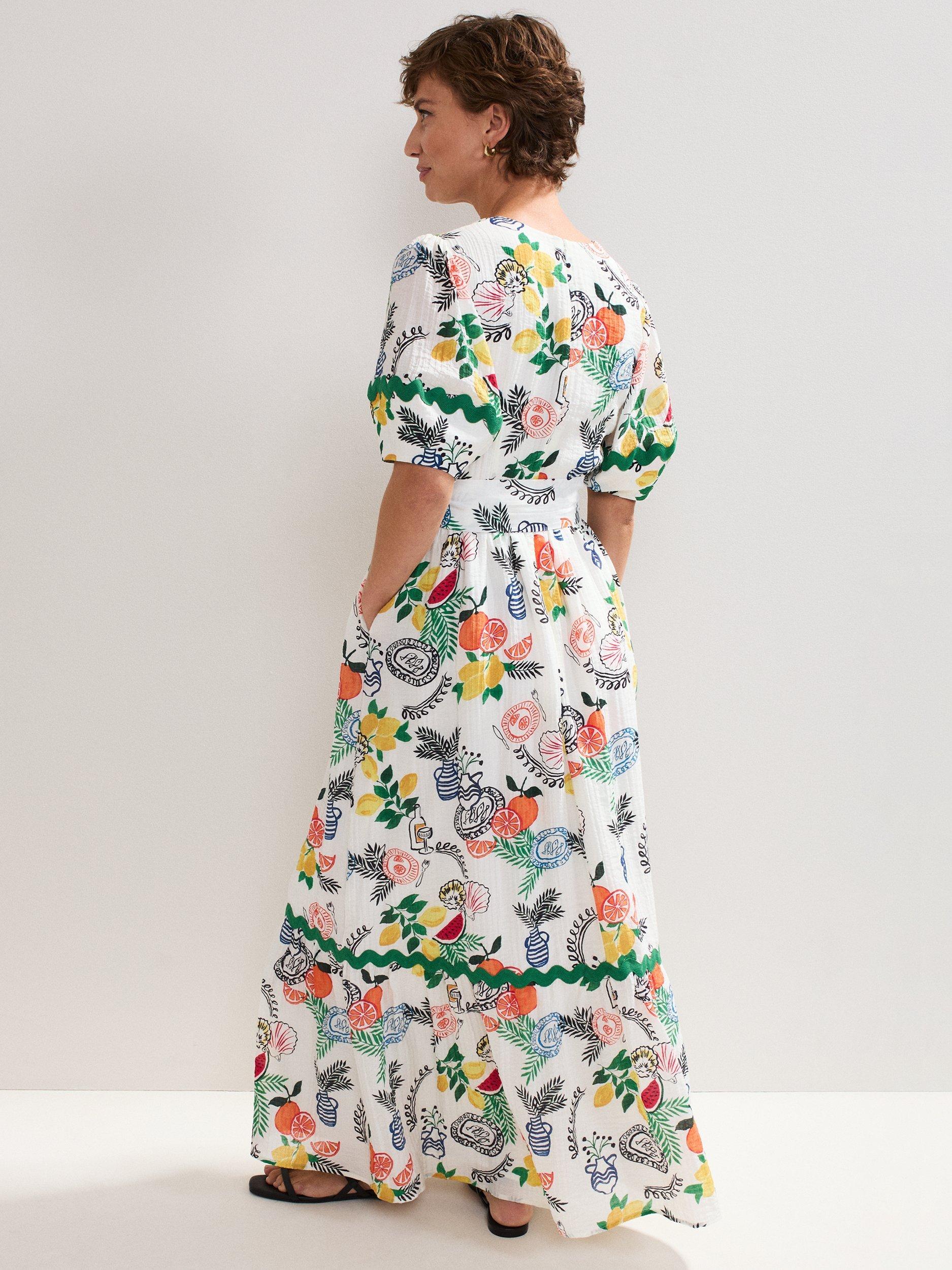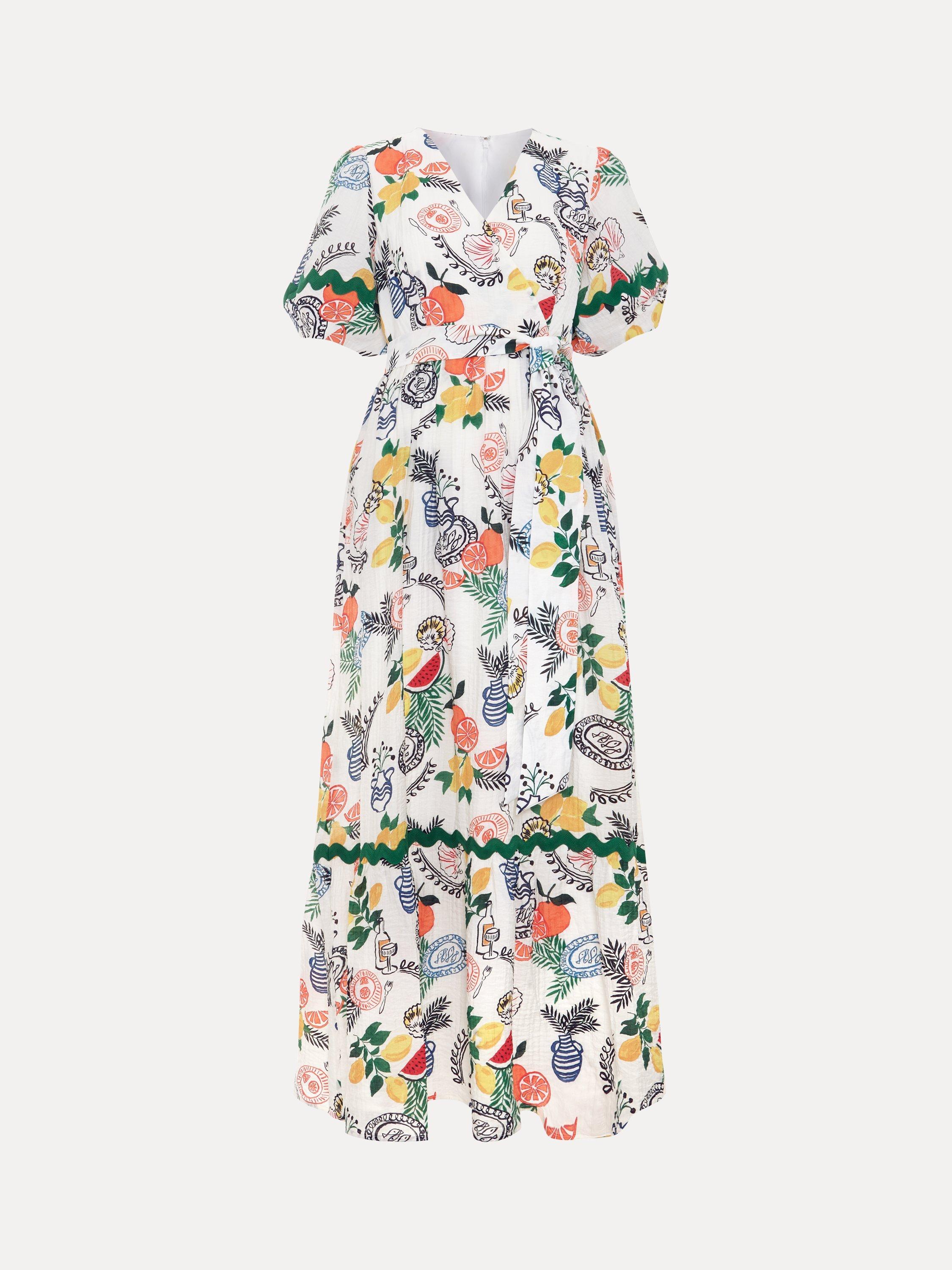 Decorated with a Sicilian-inspired postcard print that is guaranteed to turn heads, meet the Rochella dress. Feminine puff sleeves add subtle volume to the maxi silhouette, finished with ric rac detailing for a modern edge. Styled with your favourite sandals, we love this style for an effortlessly chic summer holiday look.