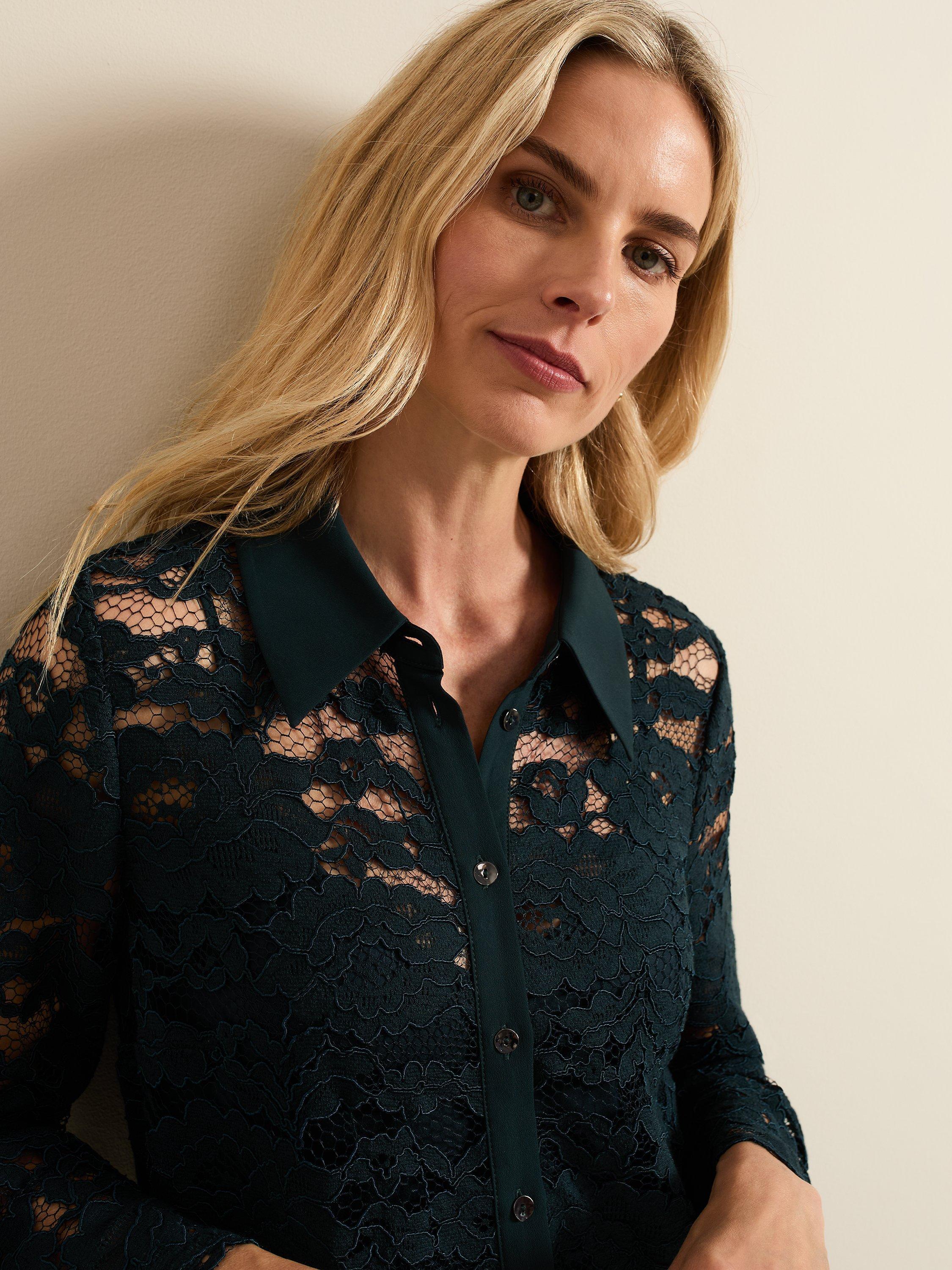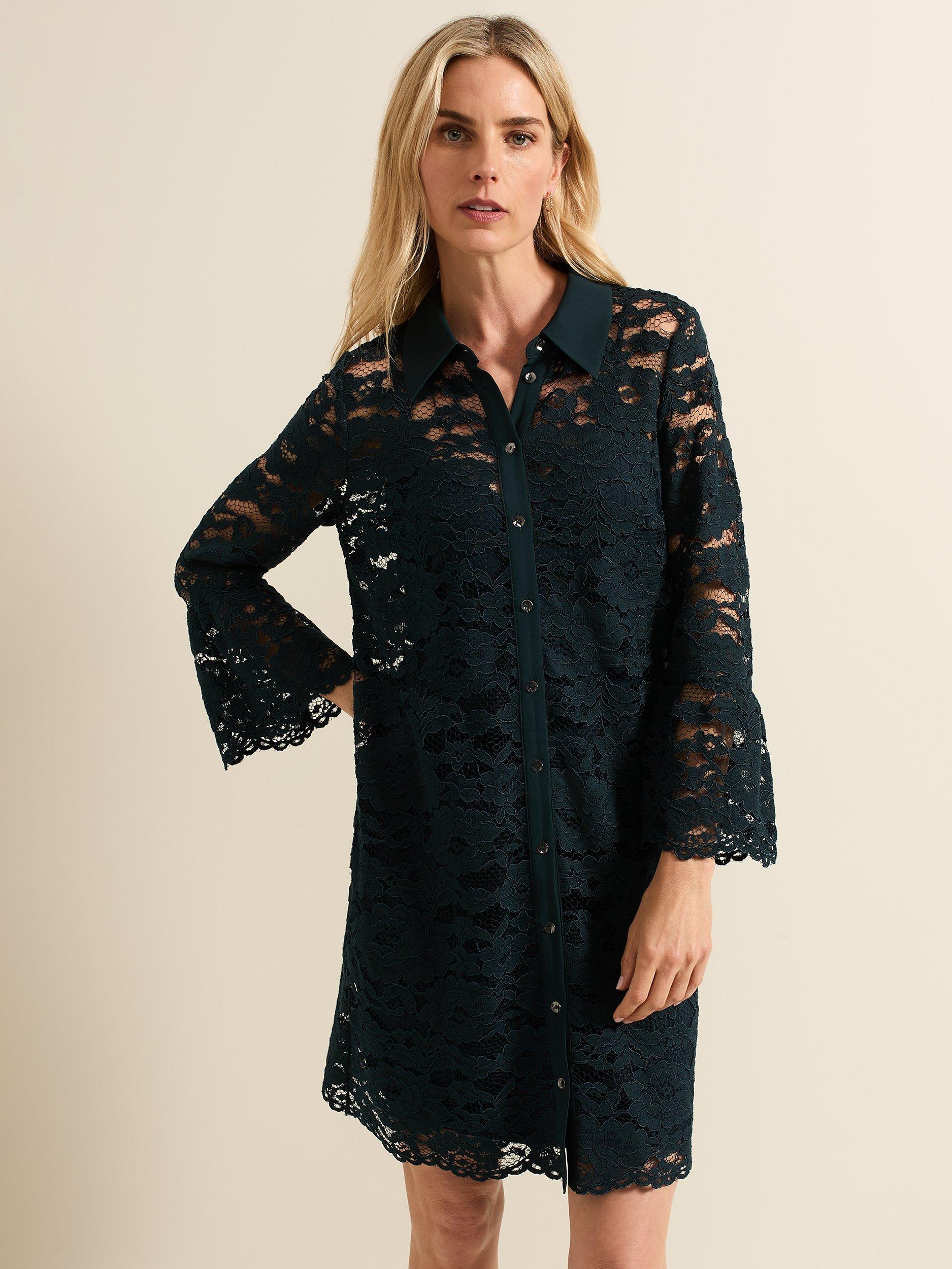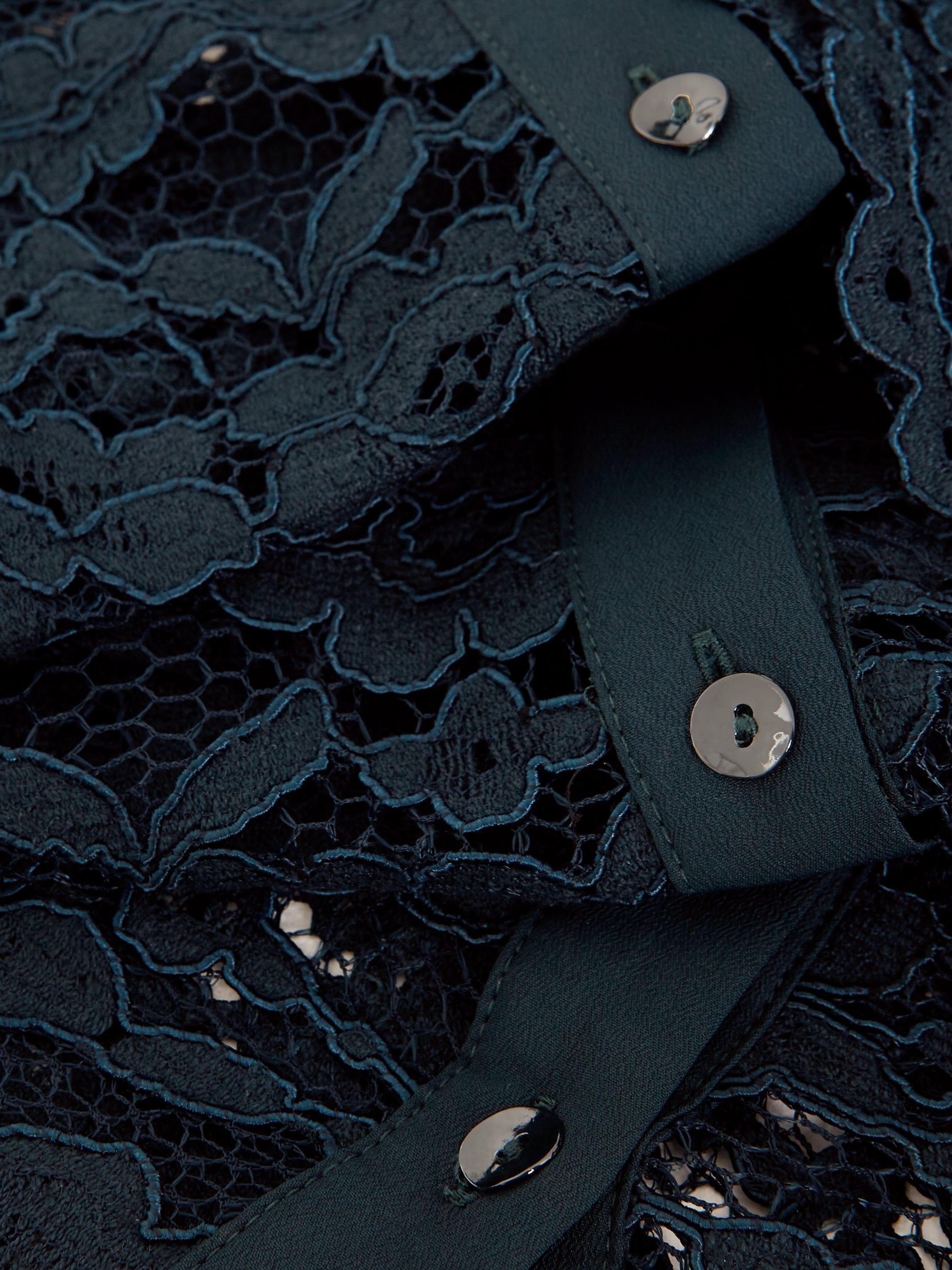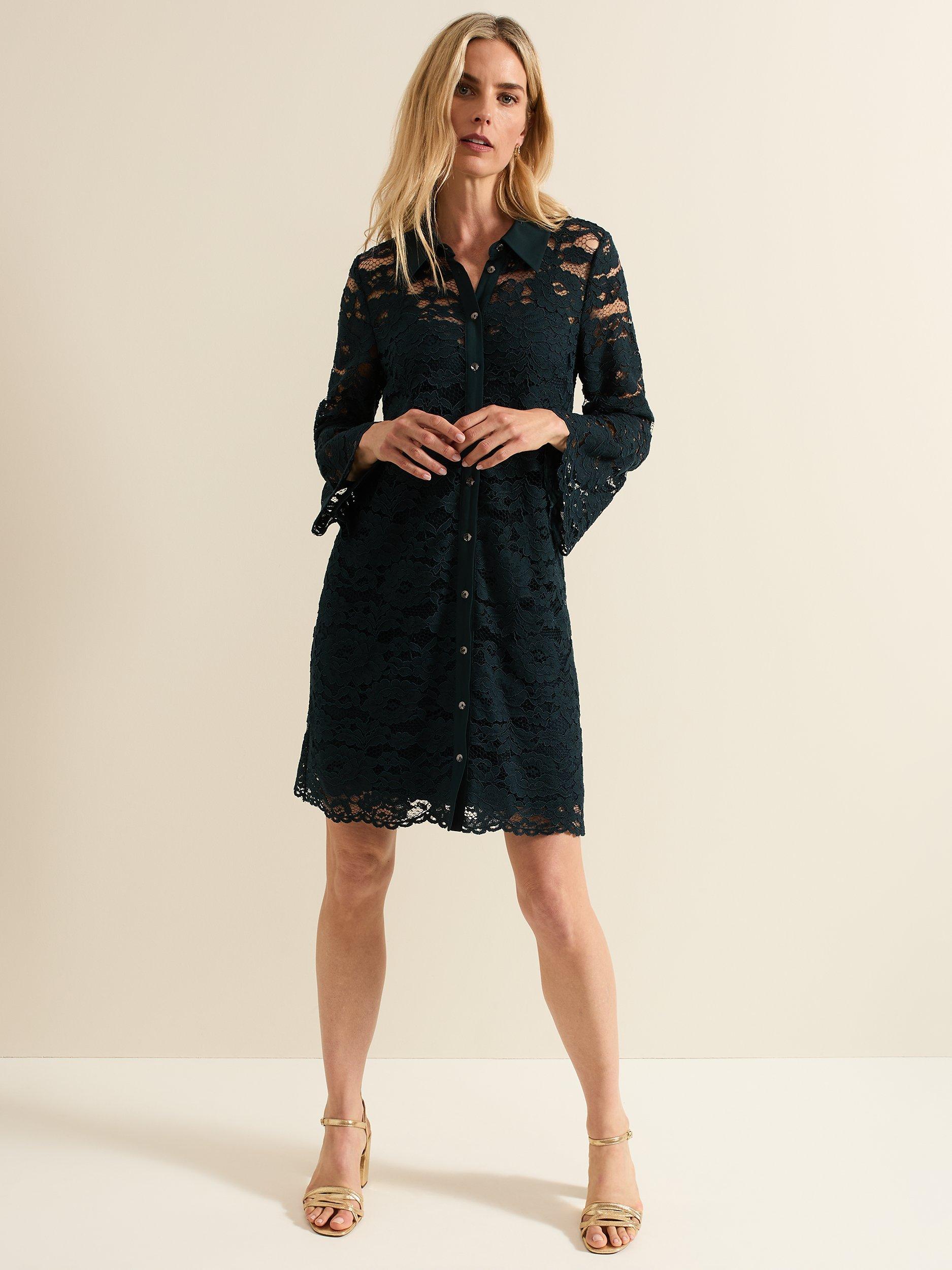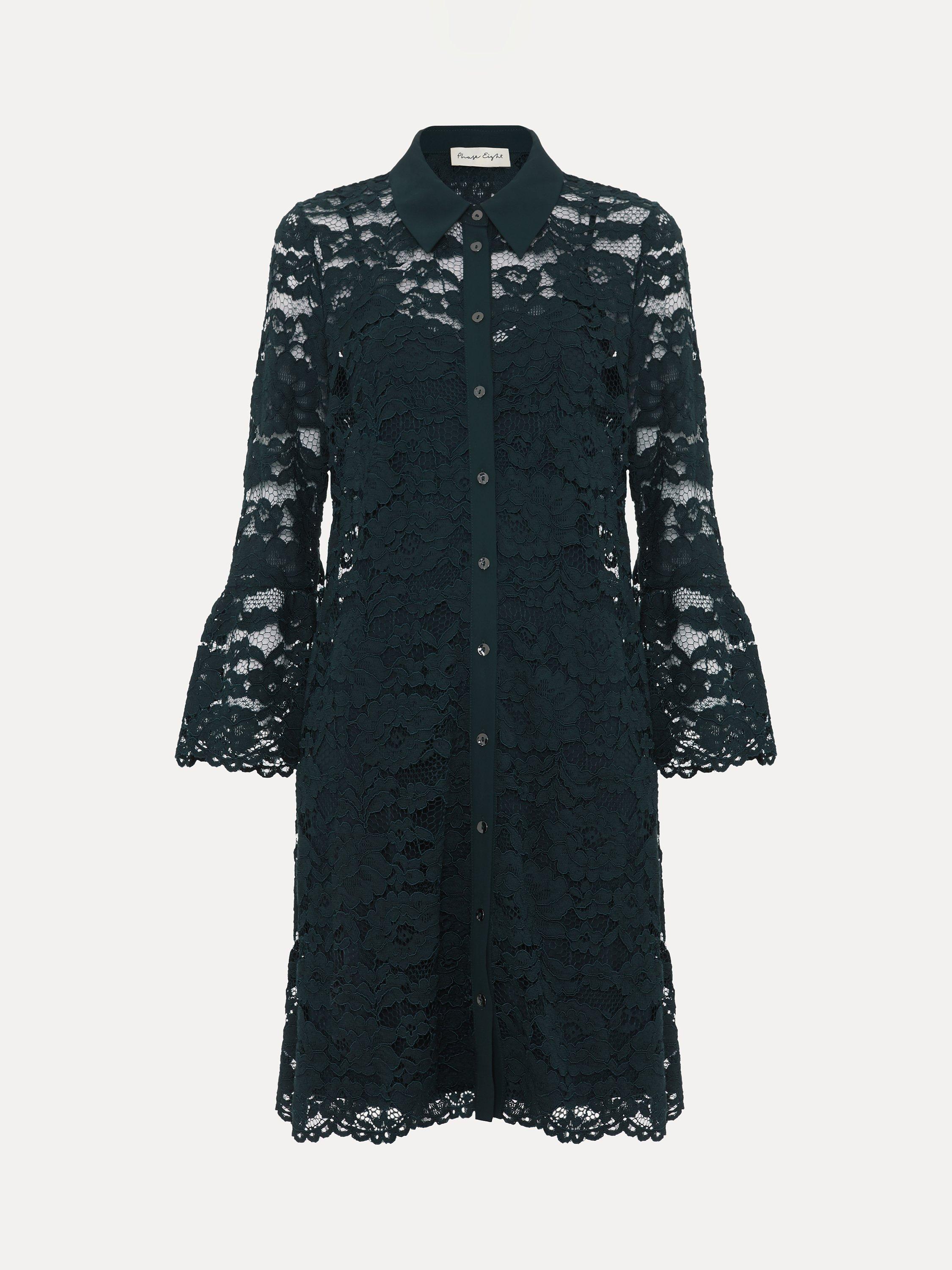In a deep shade the Rojina dress is designed in delicate lace for a classic look. Semi-sheer detailing and bell sleeves elevate the style to create the perfect mini to take you from day to night.