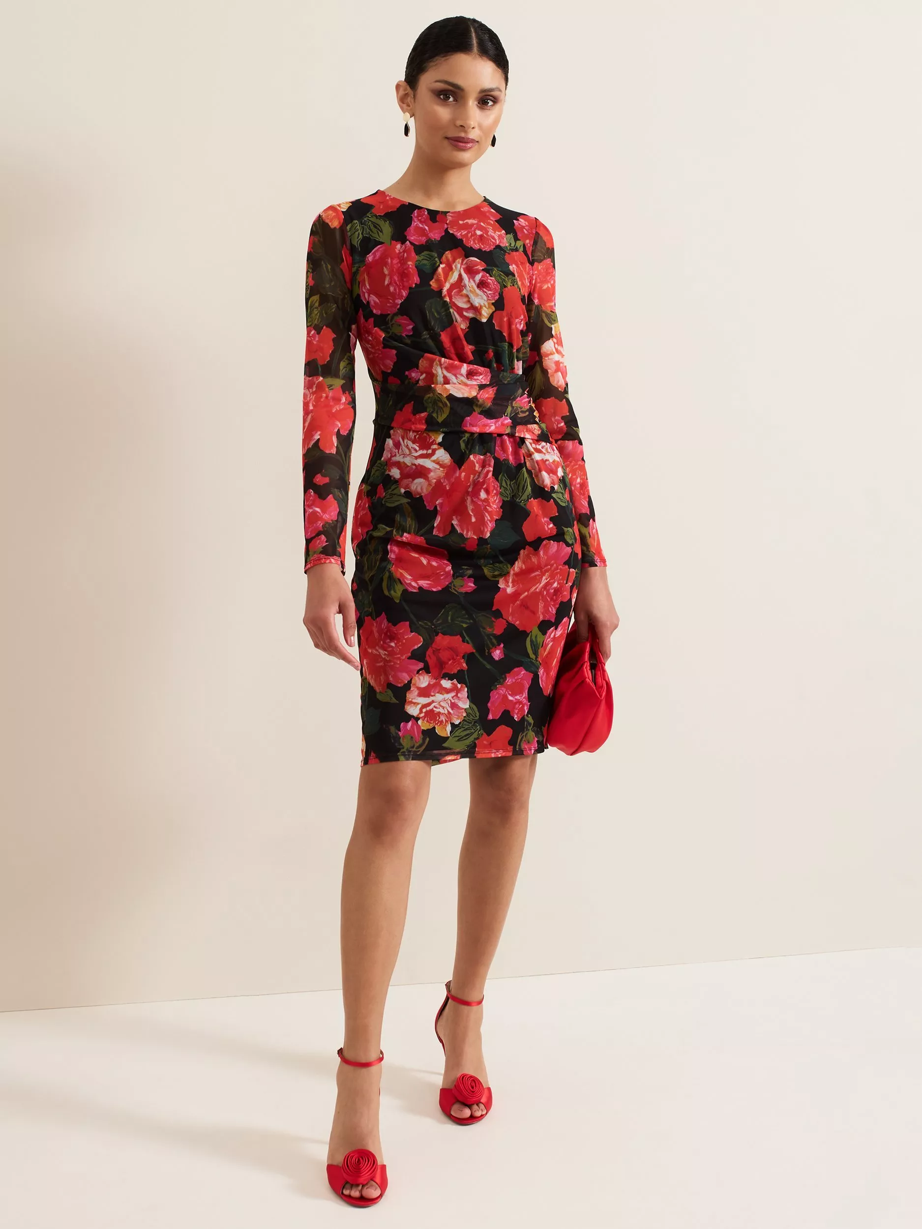 Cut to a ruched wrap silhouette that highlights the waist, this mid-length dress from Phase Eight is crafted from a blend of fabrics. Defined with a conventional round neckline and long skinny sleeves, it is planted with flourishing florals.