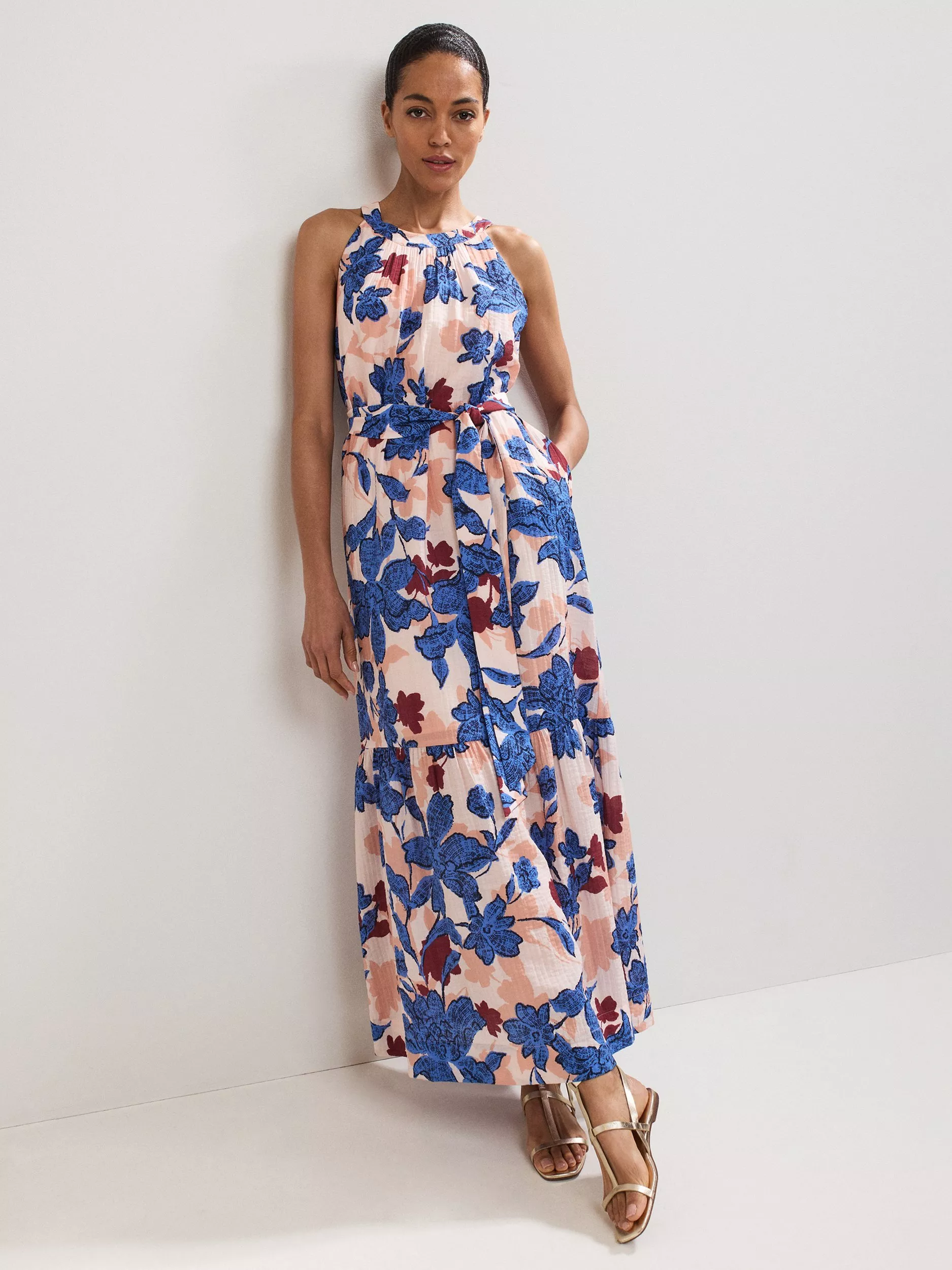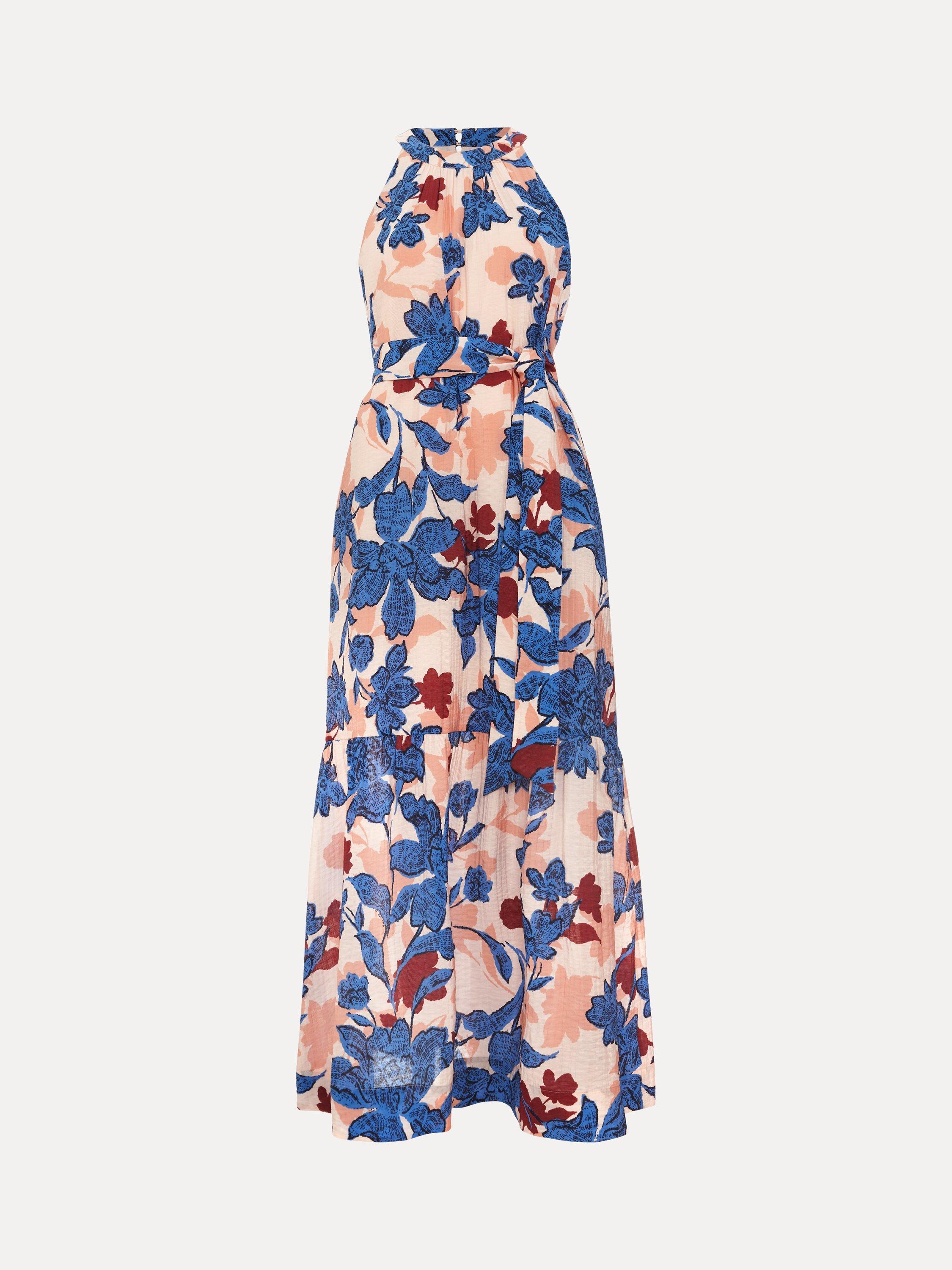 Exuding understated elegance, this dress features a sophisticated floral print in feminine shades. The high neckline and patterned tie belt accentuate the beautiful flow of the tiered maxi skirt. Finish the look with your go-to sandals, clutch bag and statement earrings.