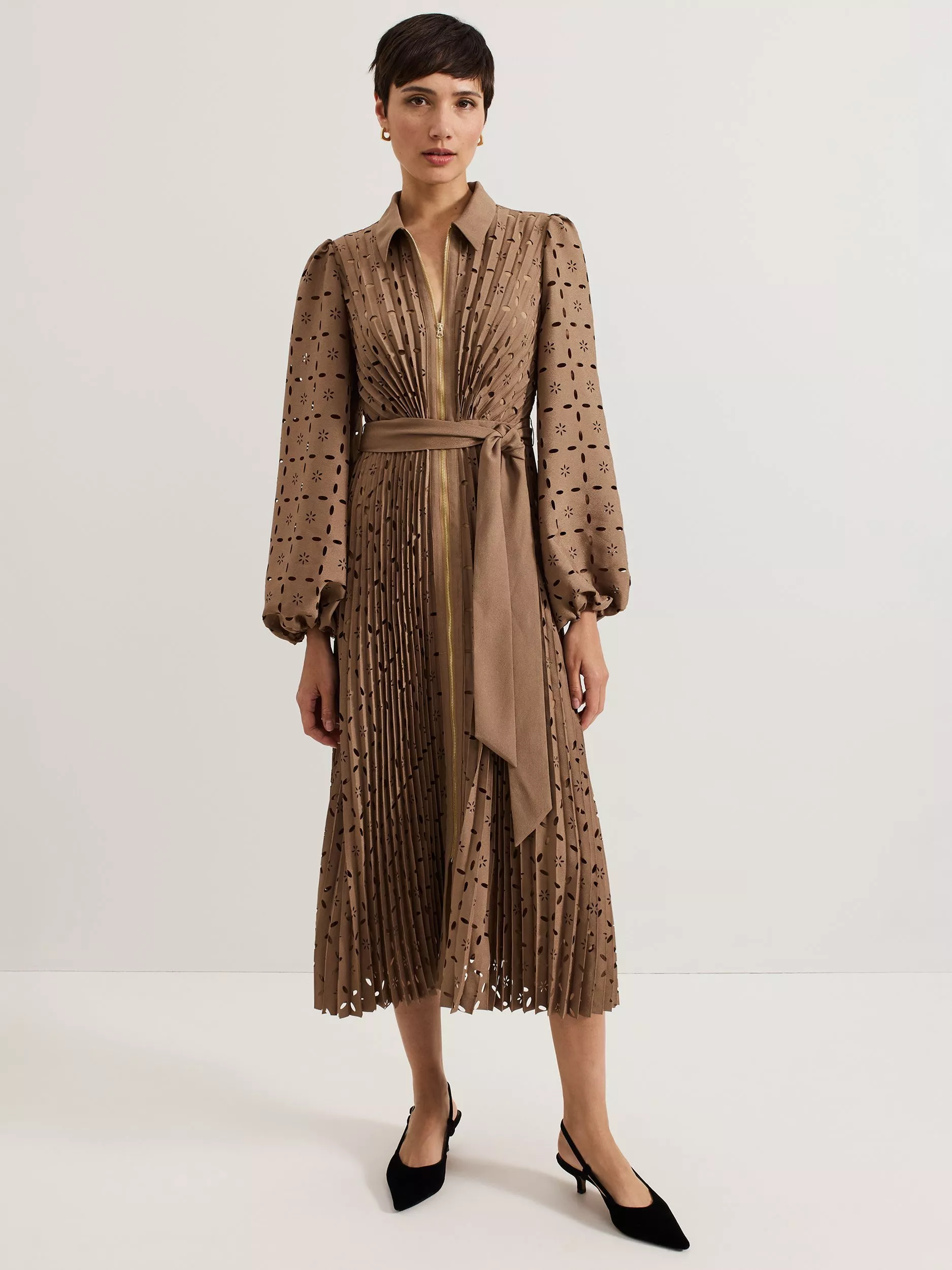 A classic style you can rely on again and again, this midi shirt dress from Phase Eight is a design classic. Smartened with a collar neckline and full-length sleeves with button cuffs, this style features cutout embroidery all over and is finished with a self-tie waist belt.