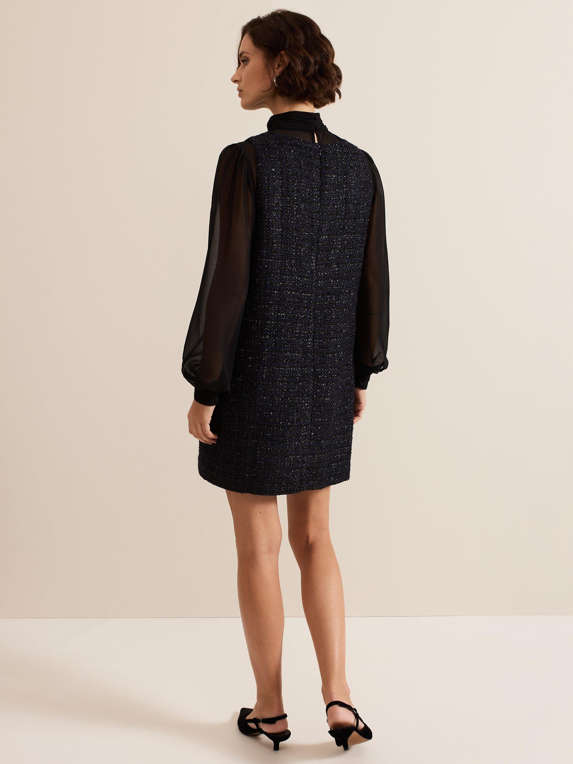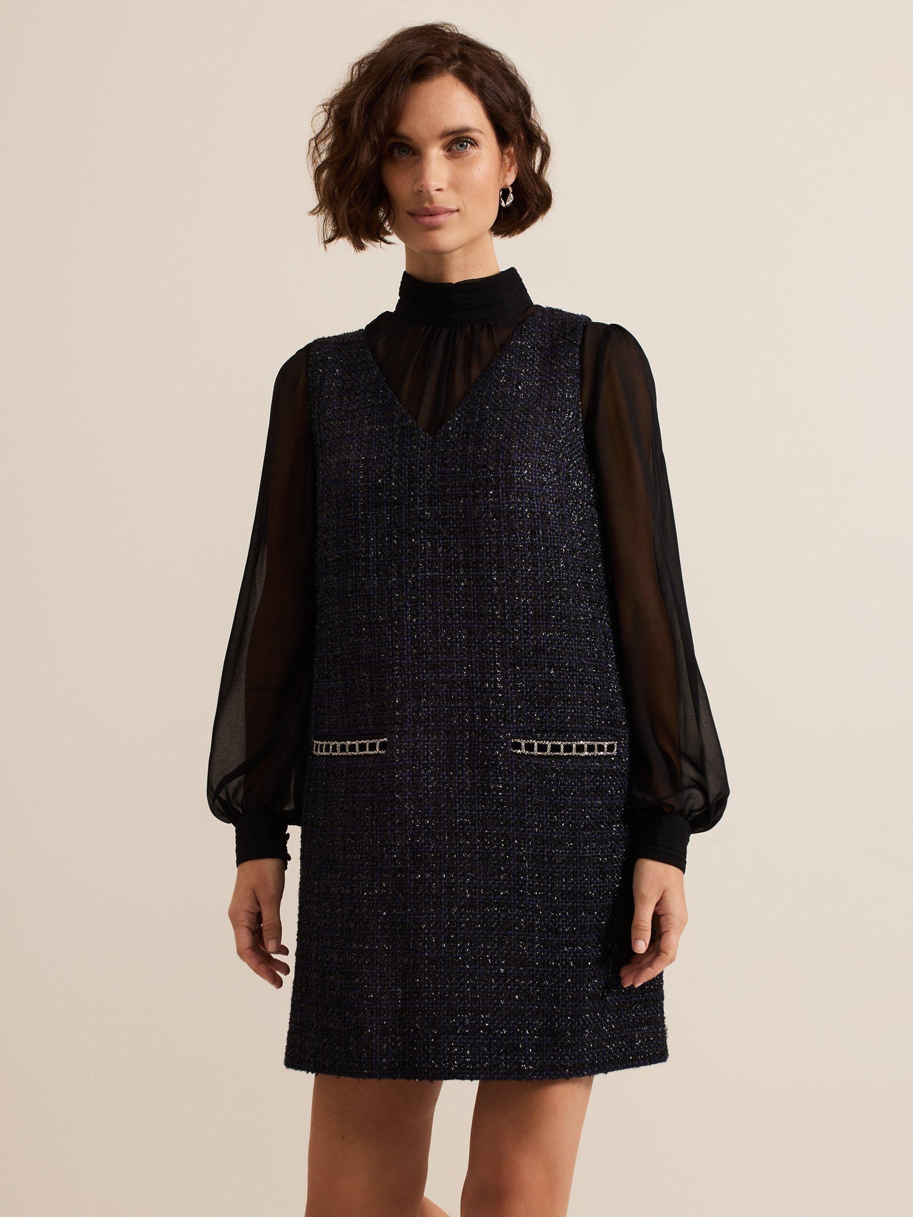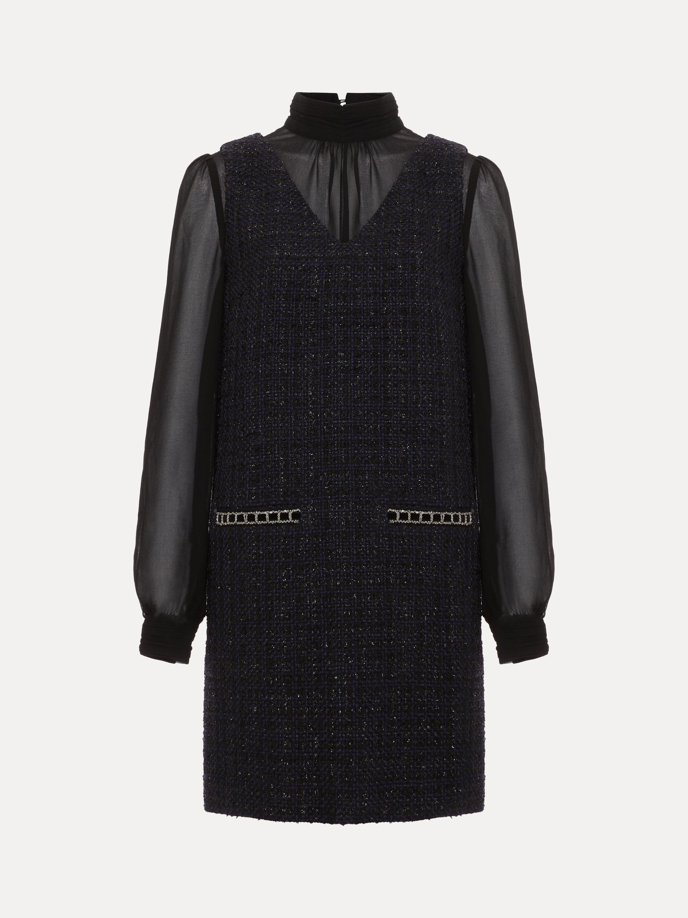 The dress with wear-all-day appeal. Designed in a classic tweed with semi-sheer blouson sleeves, the Sabine dress features a high round neck, metallic thread detailing on the pockets and falls just above the knee.