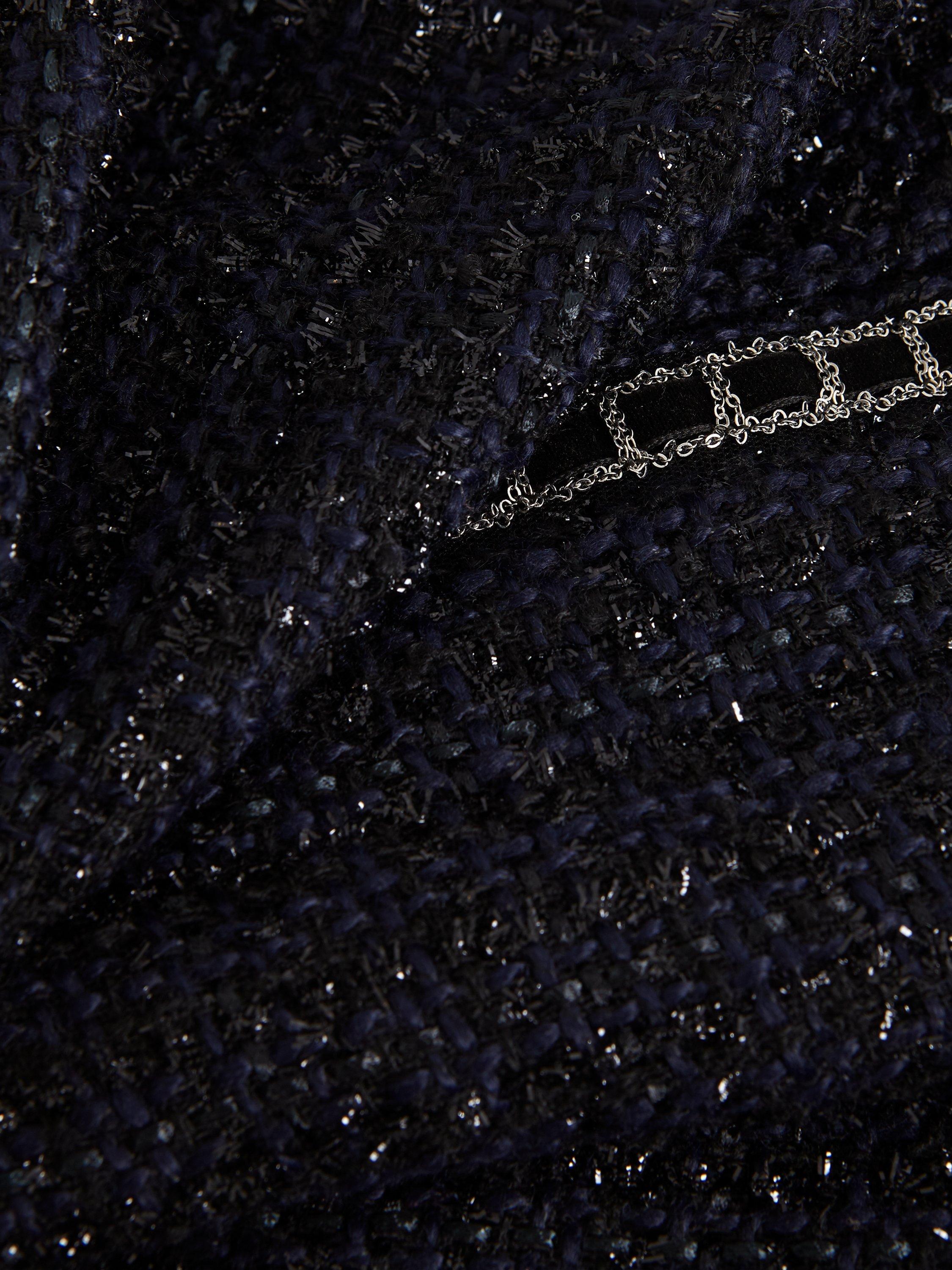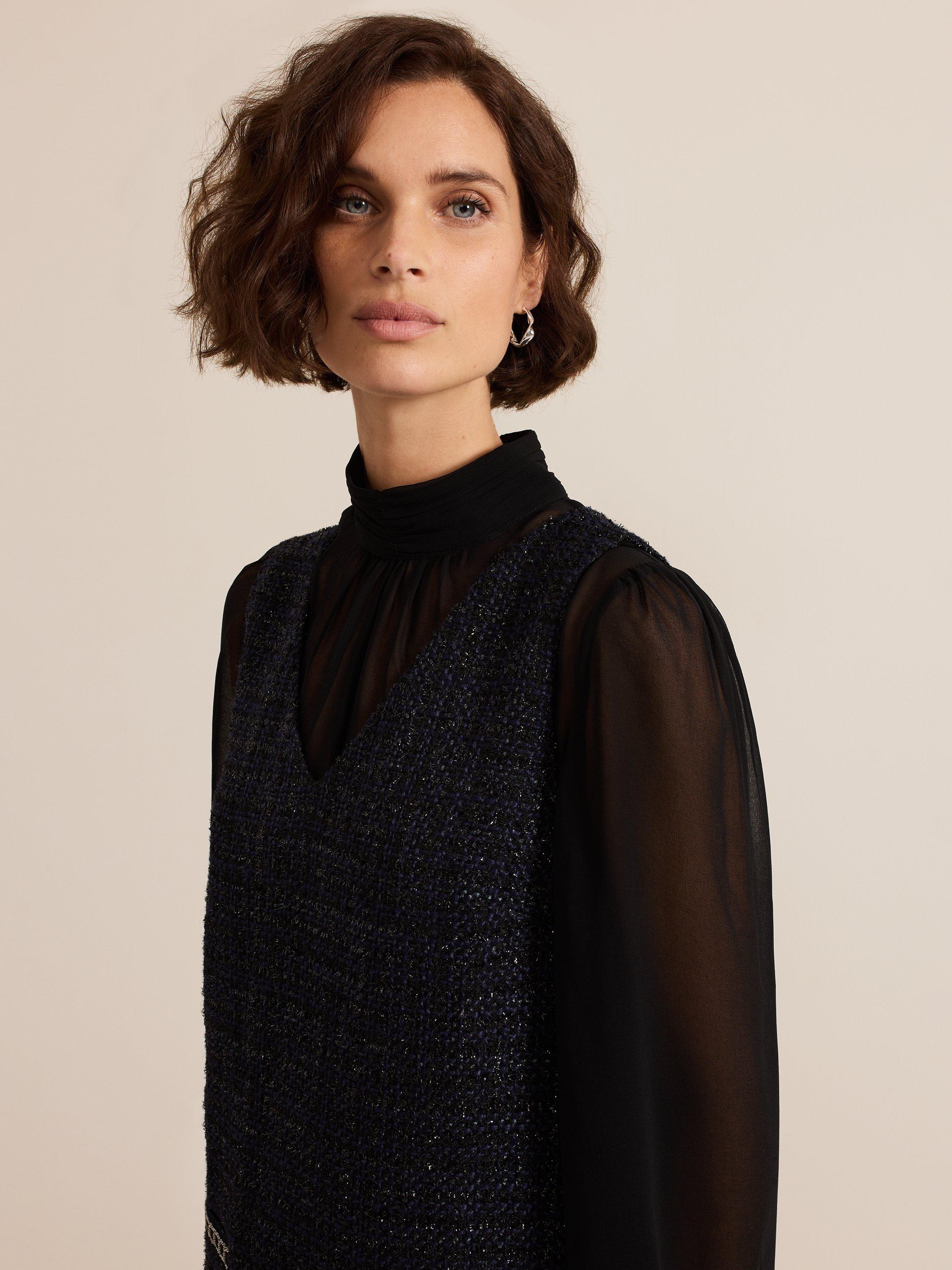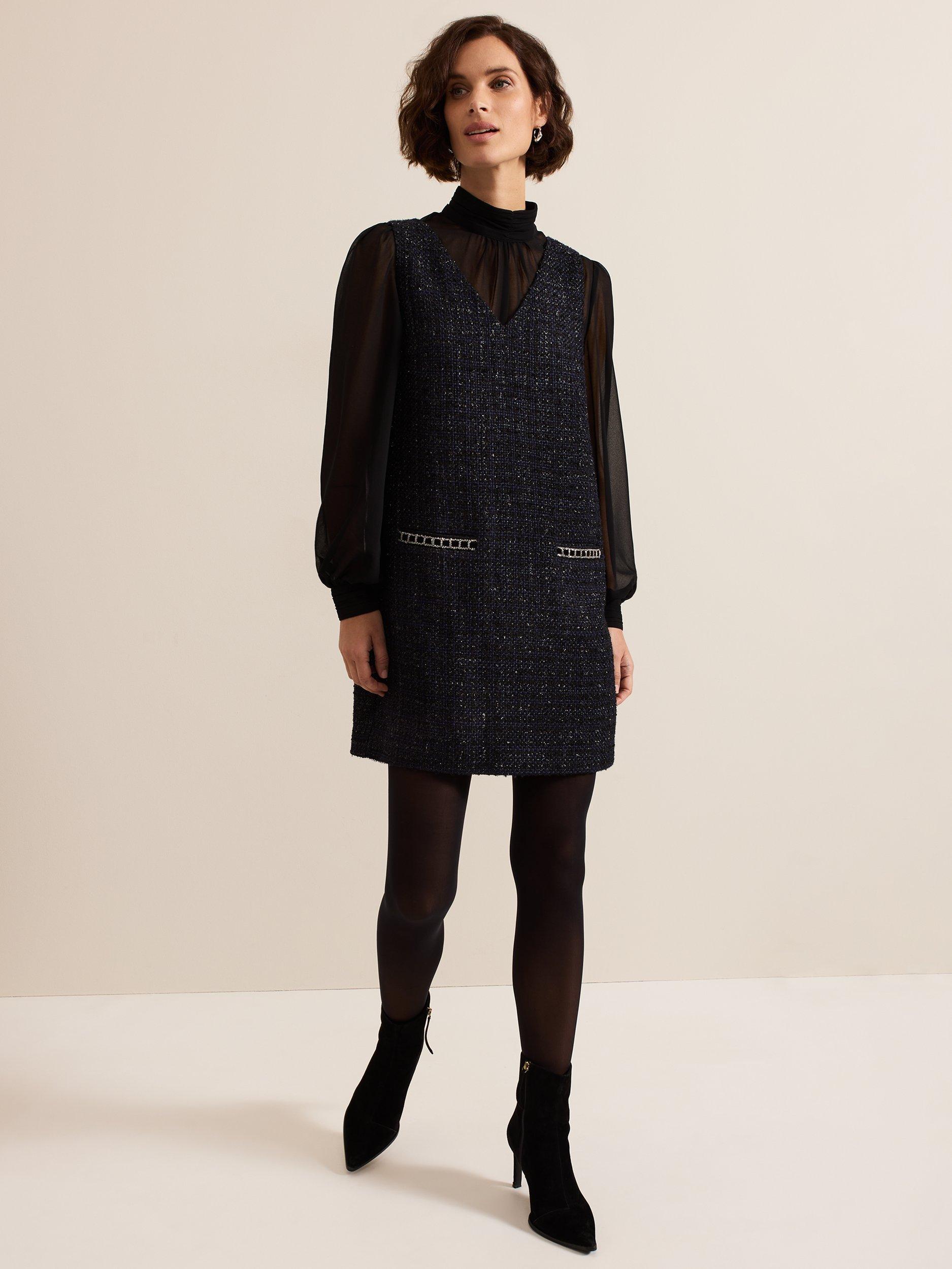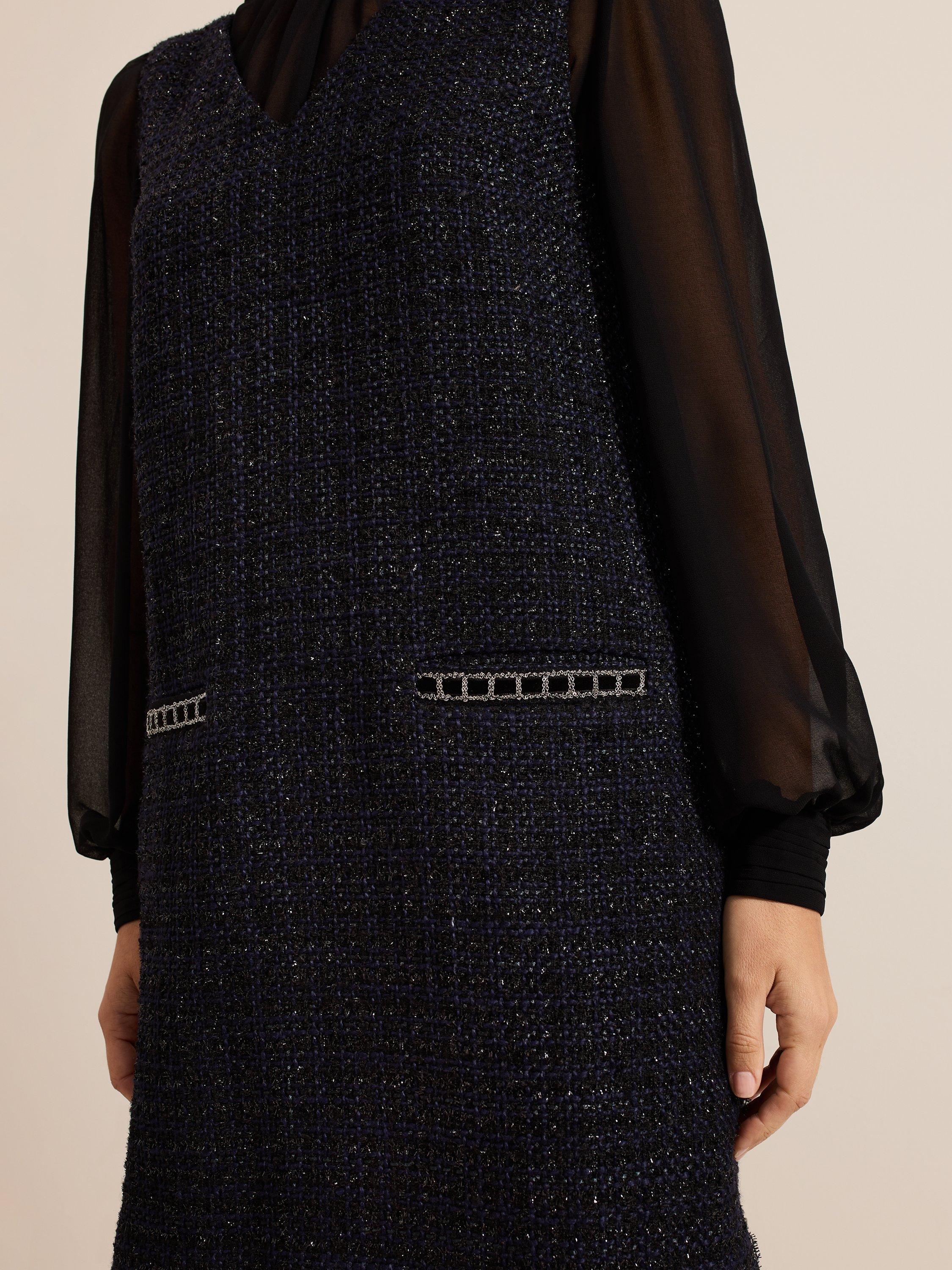The dress with wear-all-day appeal. Designed in a classic tweed with semi-sheer blouson sleeves, the Sabine dress features a high round neck, metallic thread detailing on the pockets and falls just above the knee.