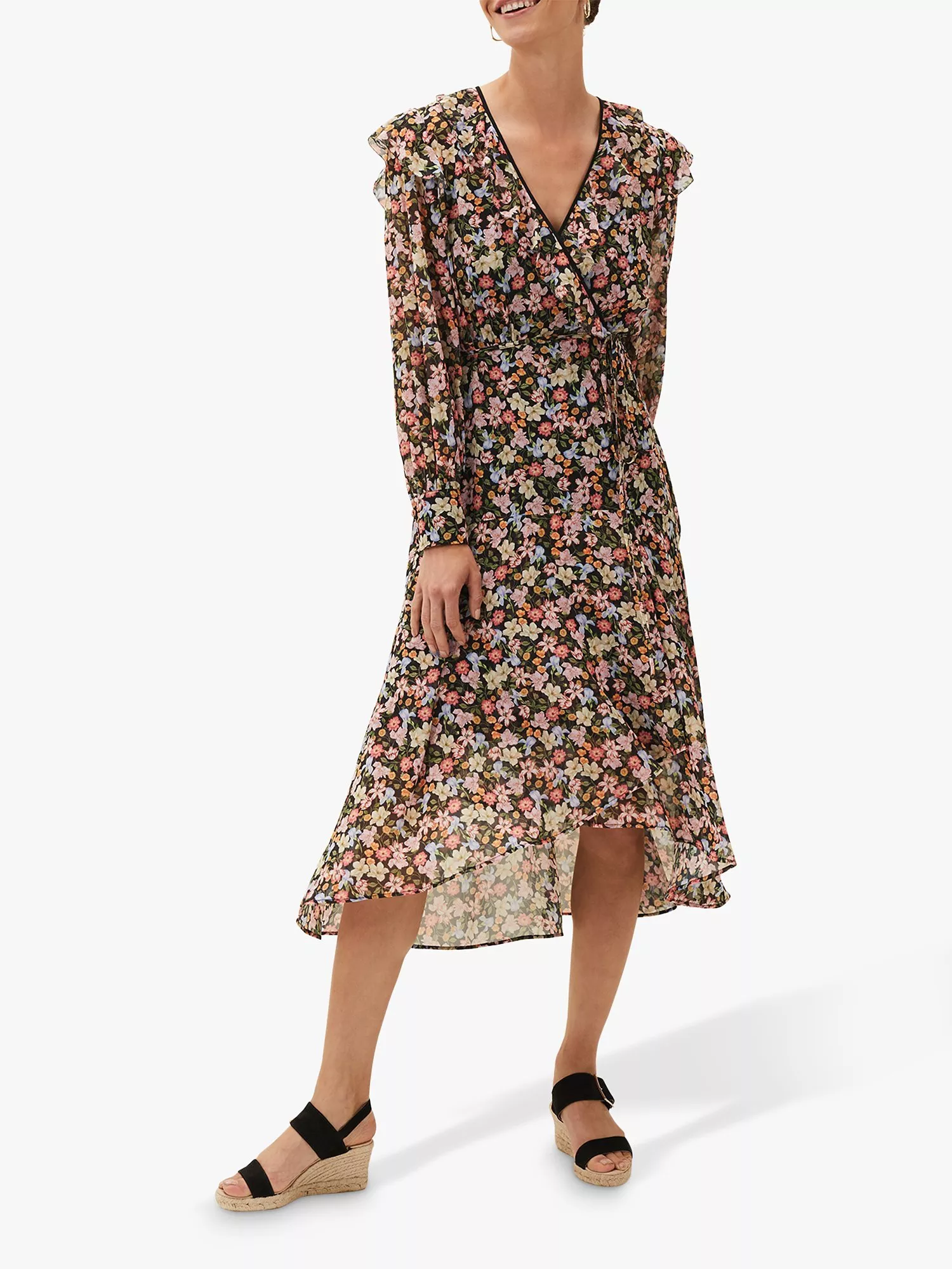 With a refined wrap front and a ruffle trim on the shoulders, this midi dress by Phase Eight is printed with fresh florals throughout.