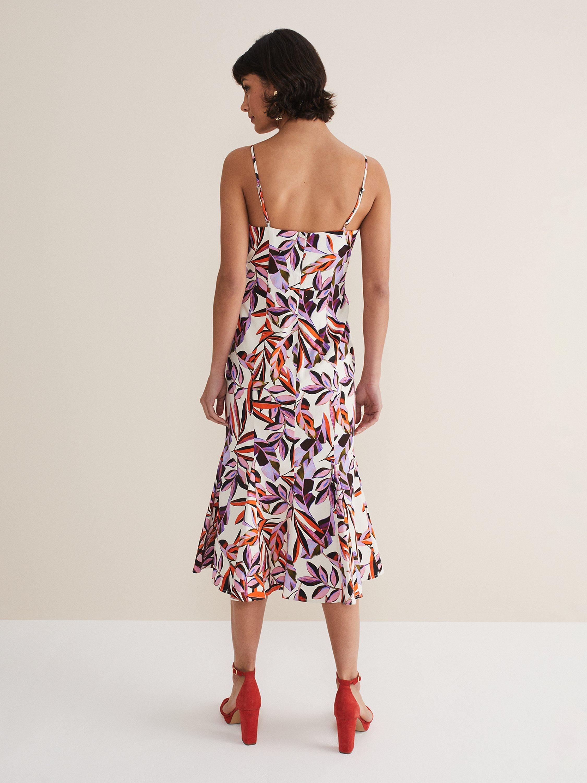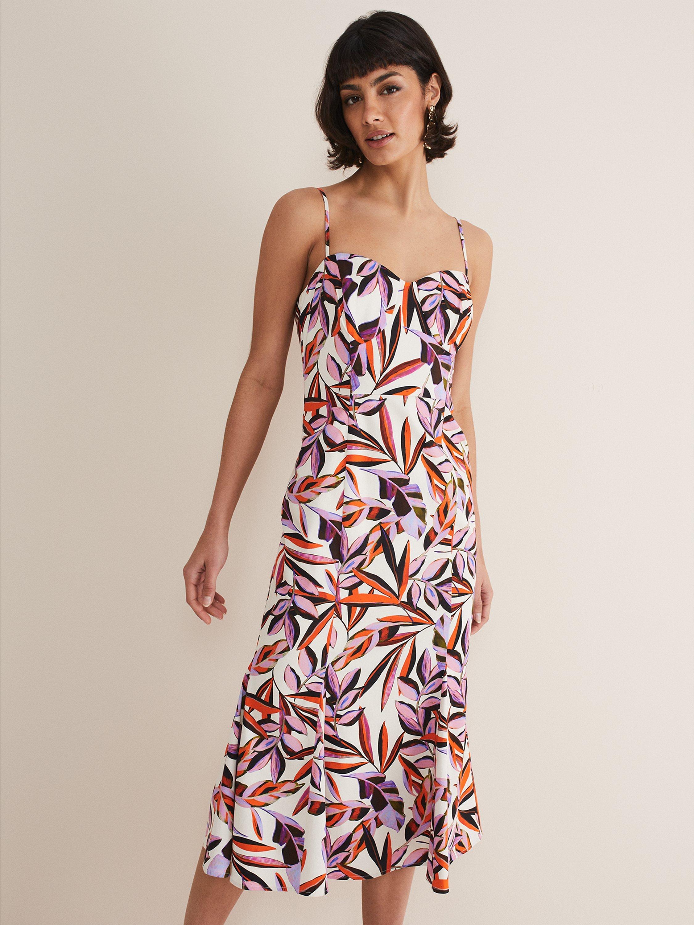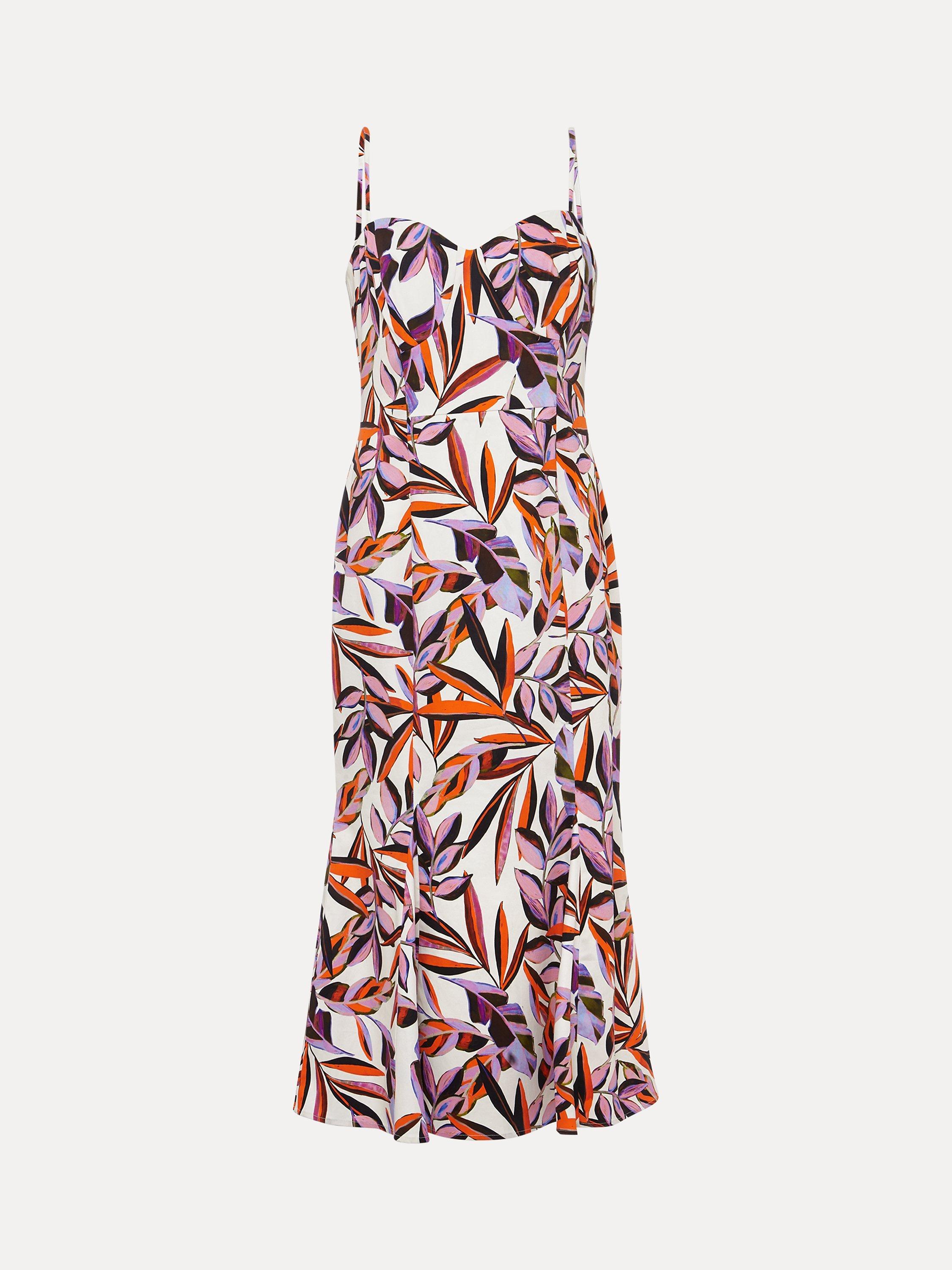 Looking for a dress to wear to your next occasion? Look no further. Designed with a vibrant orange and purple botanical print our dress features delicate spaghetti straps a sweetheart bodice and falls to a fit and flare midi skirt. Our Sammie dress is perfect to wear with heels and a matching clutch bag to your future RSVPs.
