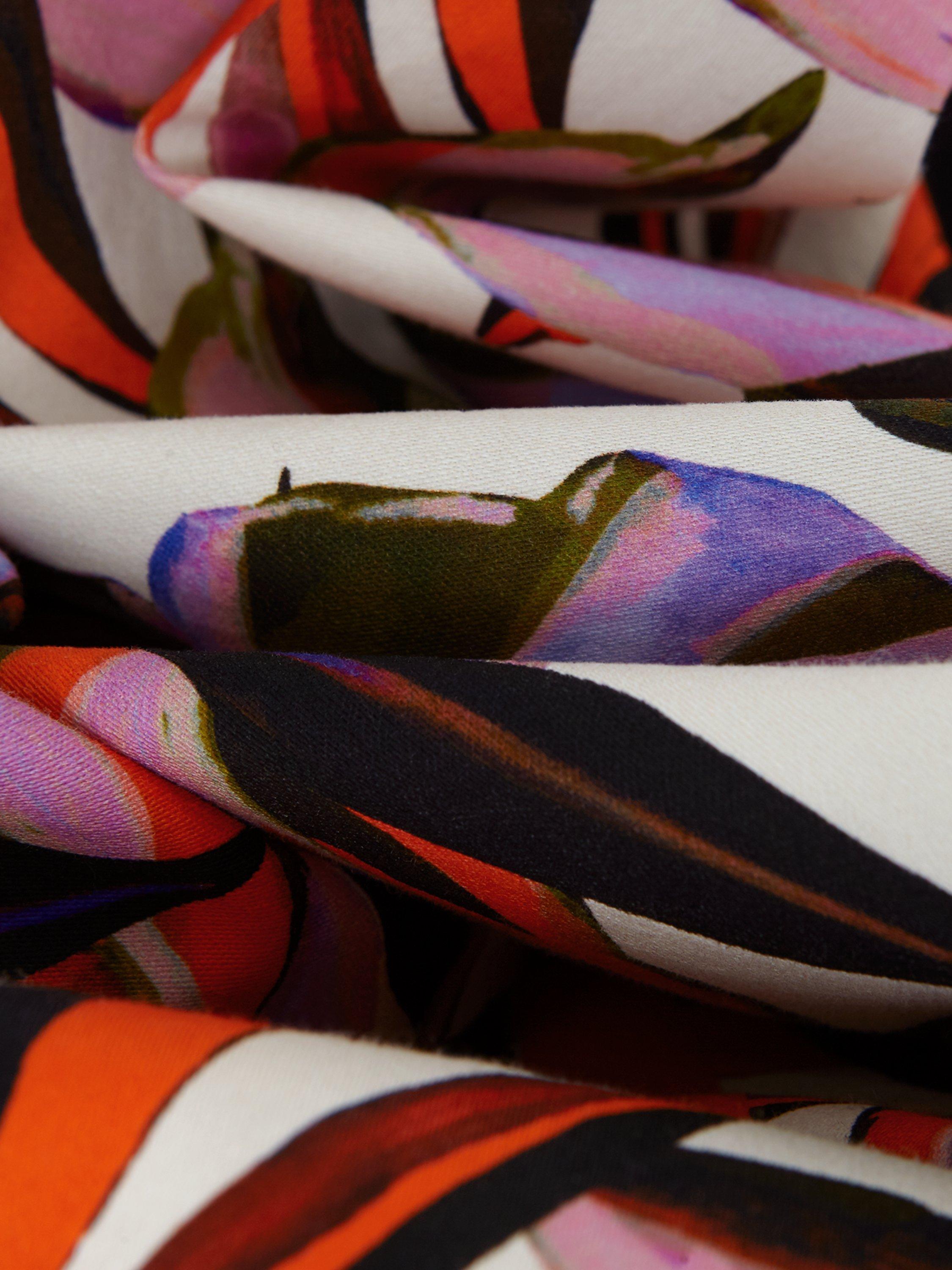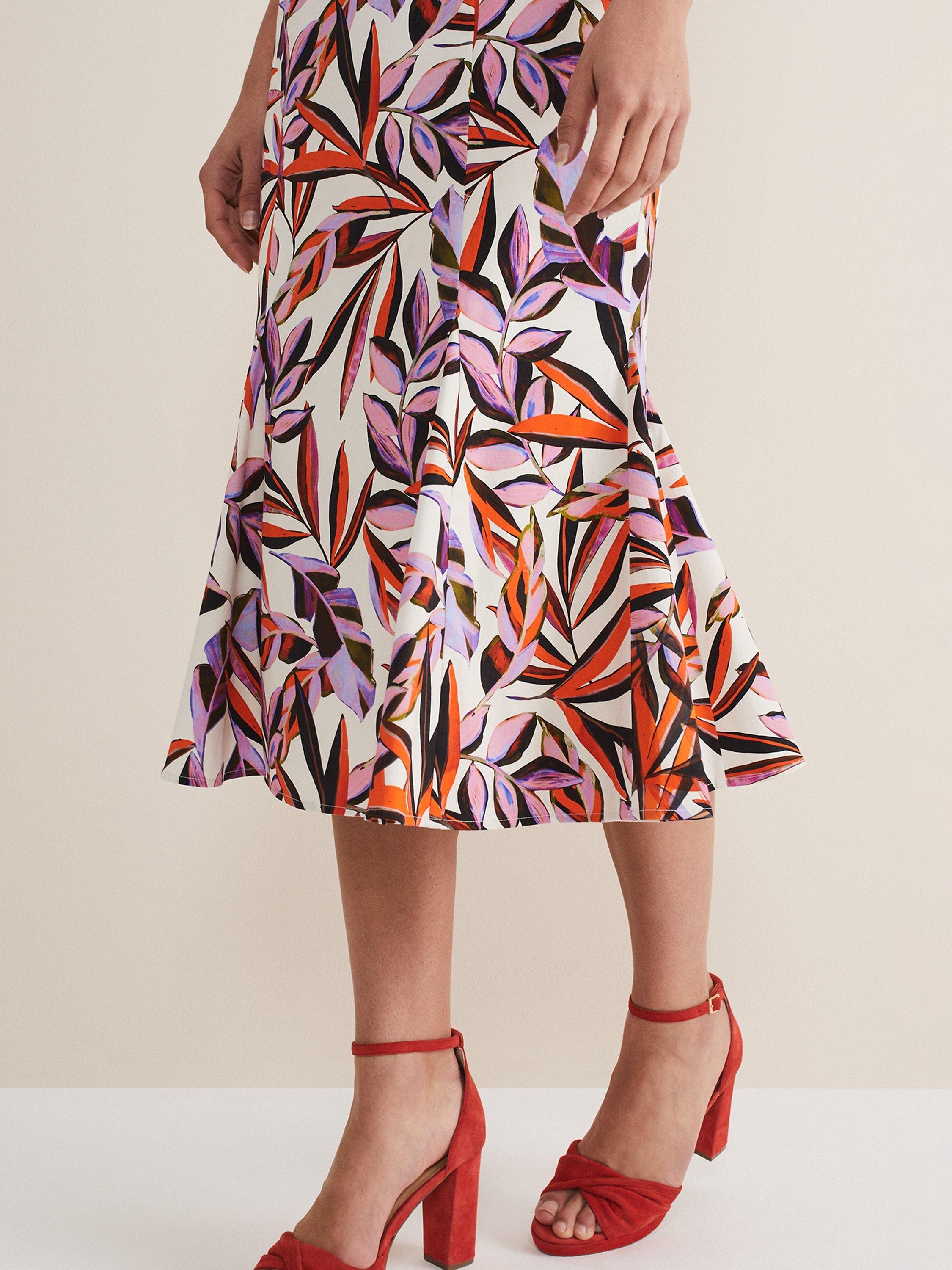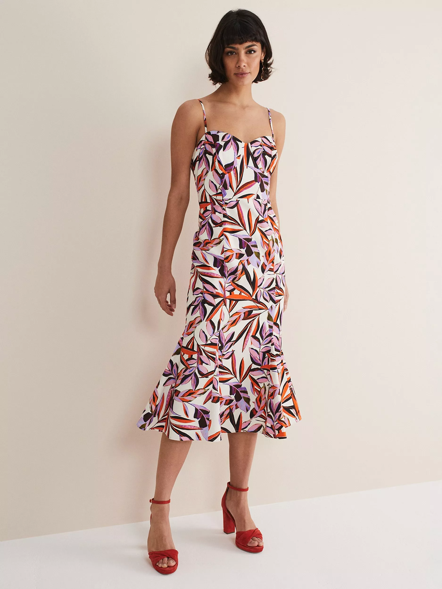 Looking for a dress to wear to your next occasion? Look no further. Designed with a vibrant orange and purple botanical print our dress features delicate spaghetti straps a sweetheart bodice and falls to a fit and flare midi skirt. Our Sammie dress is perfect to wear with heels and a matching clutch bag to your future RSVPs.