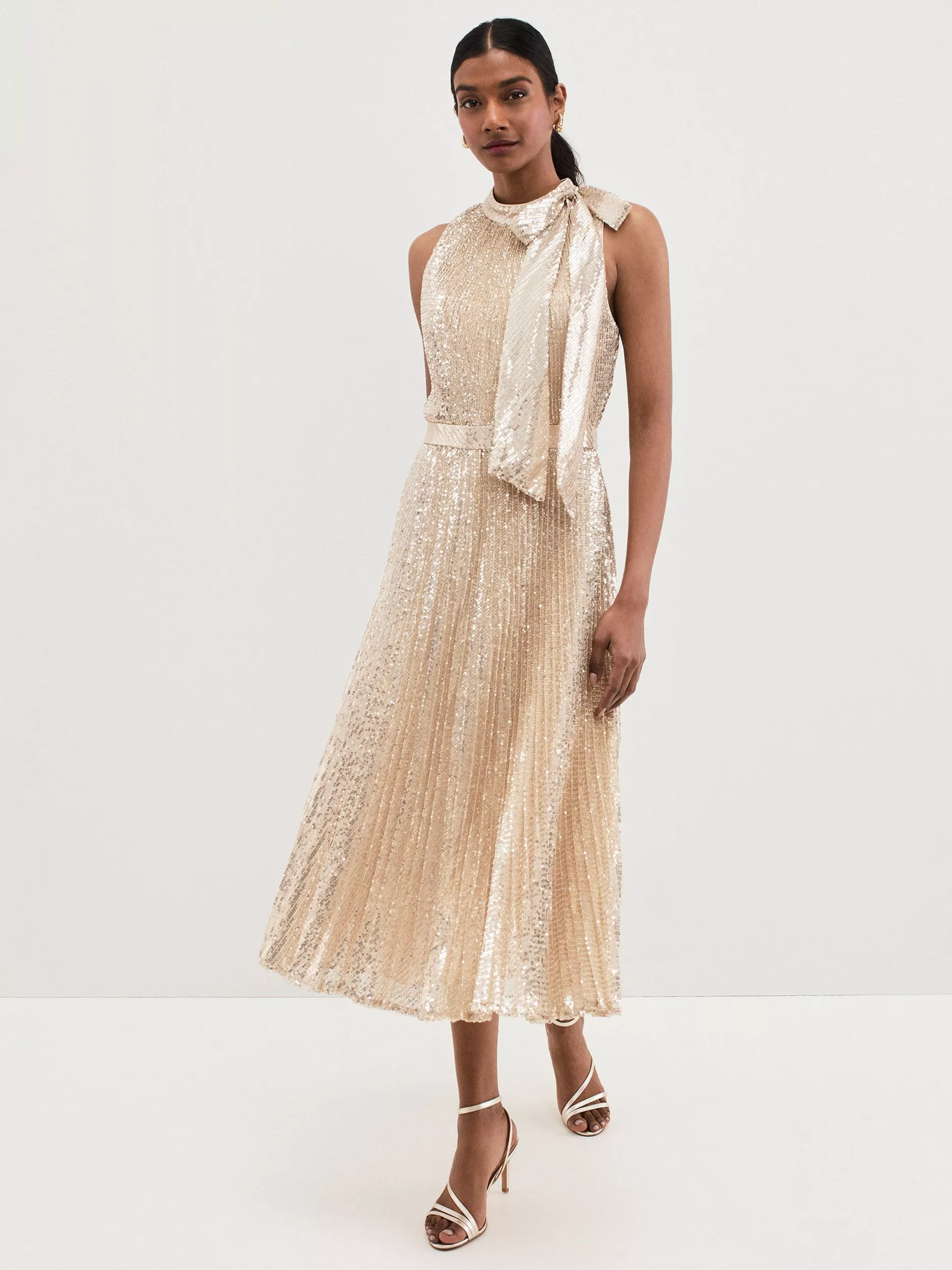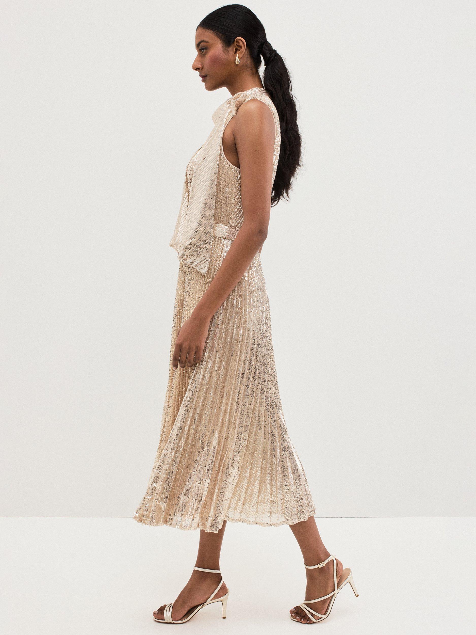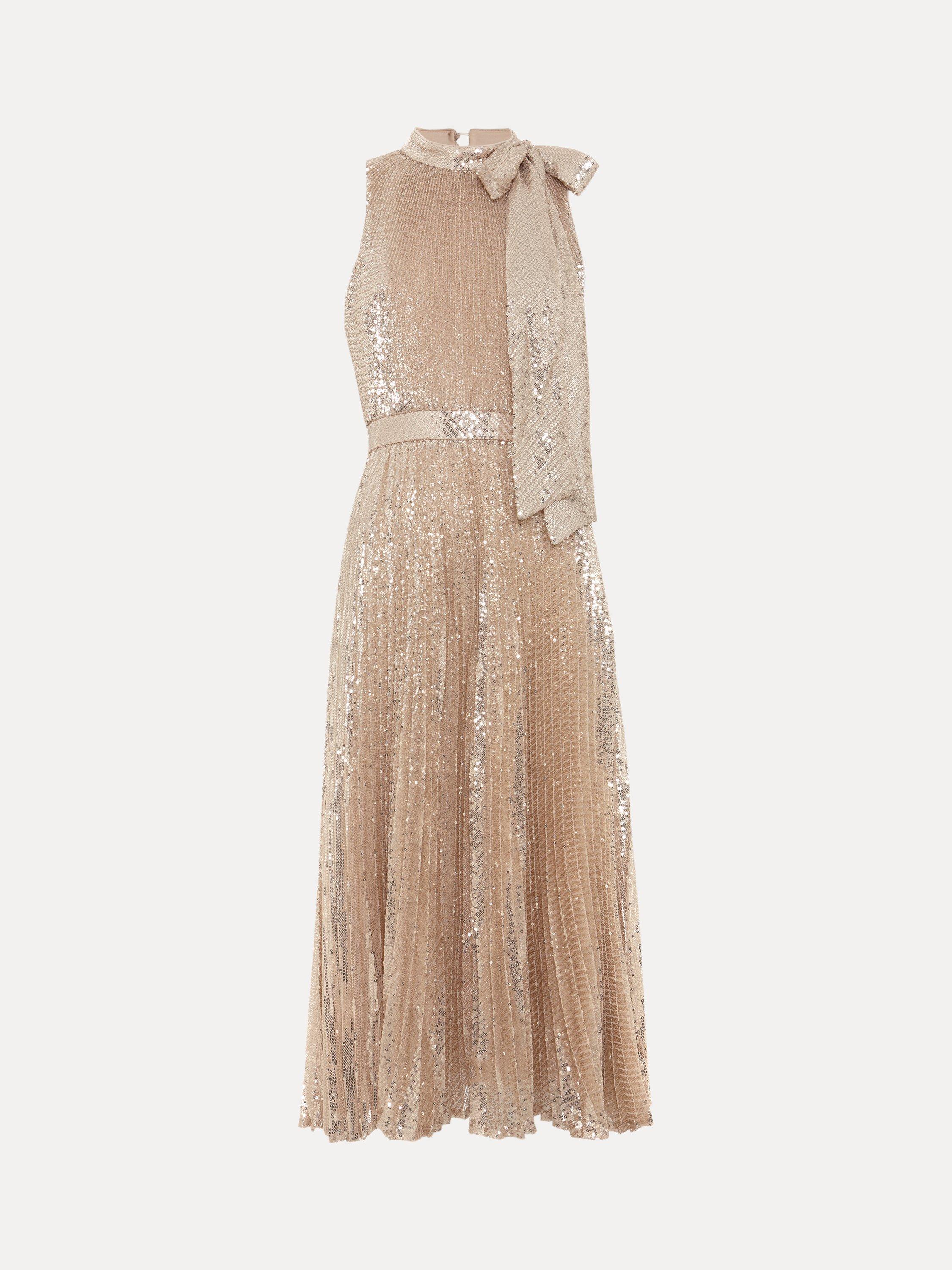 This sequin dress is a guaranteed showstopper. With a feminine pussybow neck, the Sammy dress features delicate pleats throughout that create natural movement. Pair with matching accessories for a special bridesmaid look that will turn heads at special occasions for years to come.