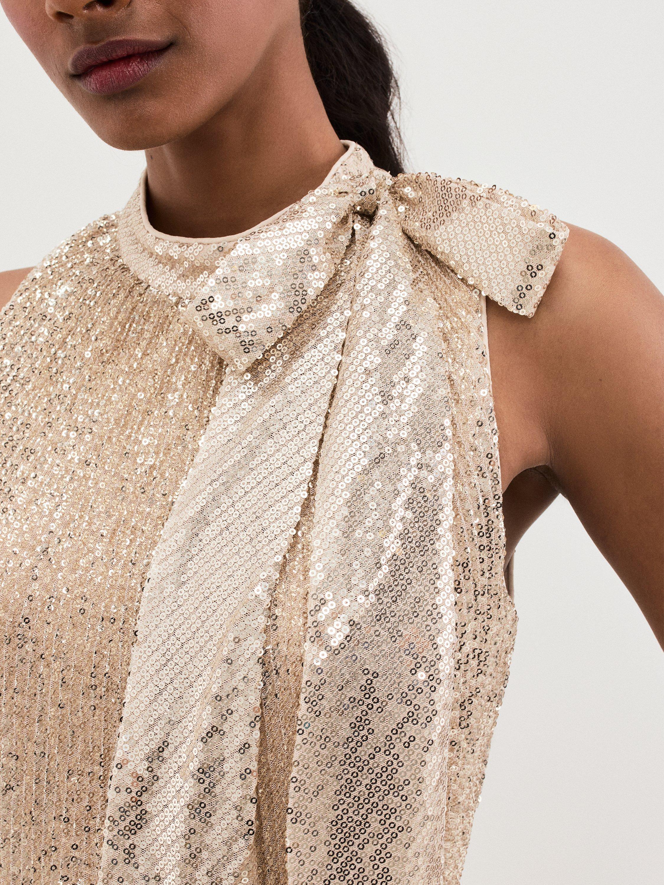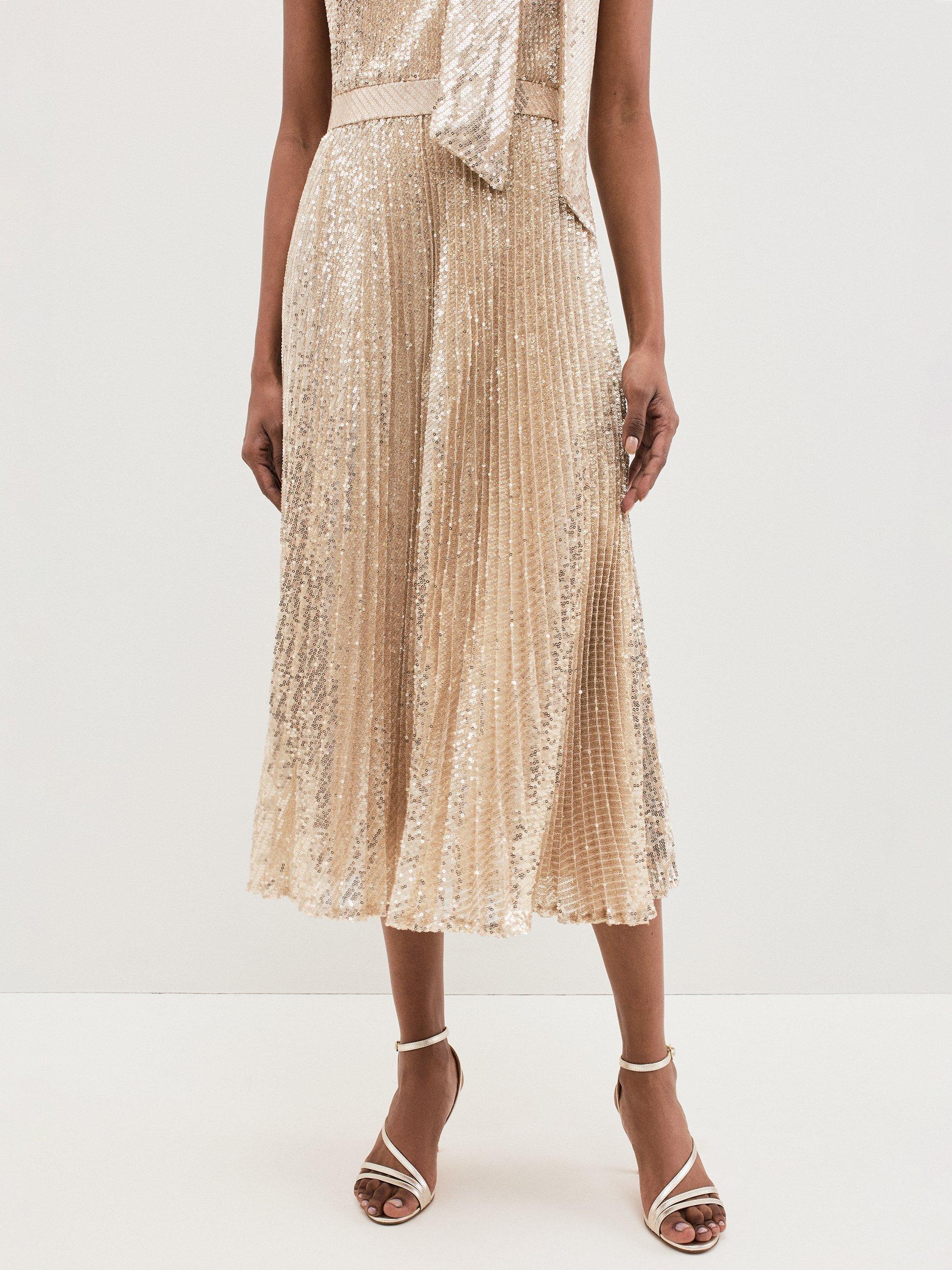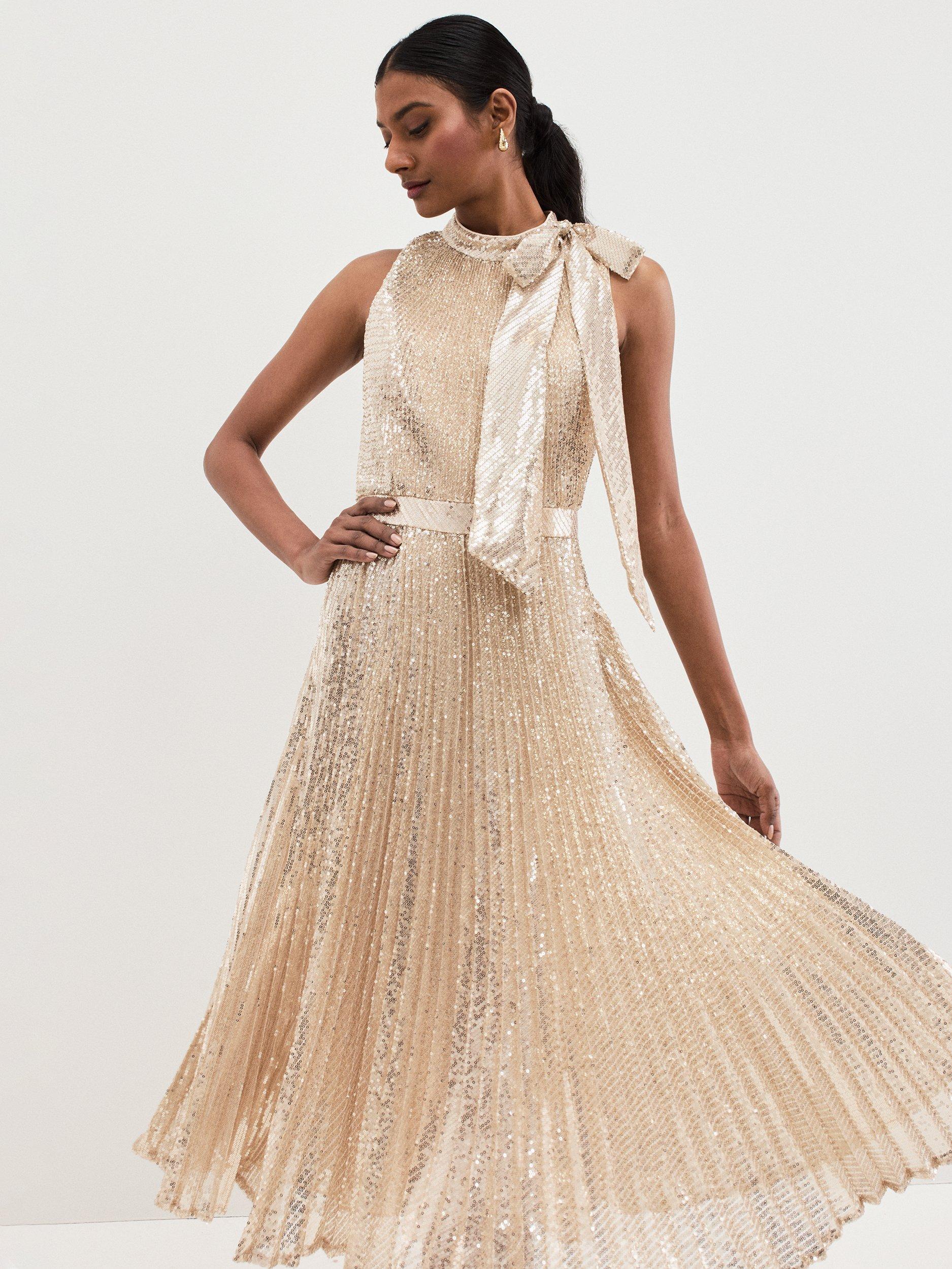 This sequin dress is a guaranteed showstopper. With a feminine pussybow neck, the Sammy dress features delicate pleats throughout that create natural movement. Pair with matching accessories for a special bridesmaid look that will turn heads at special occasions for years to come.