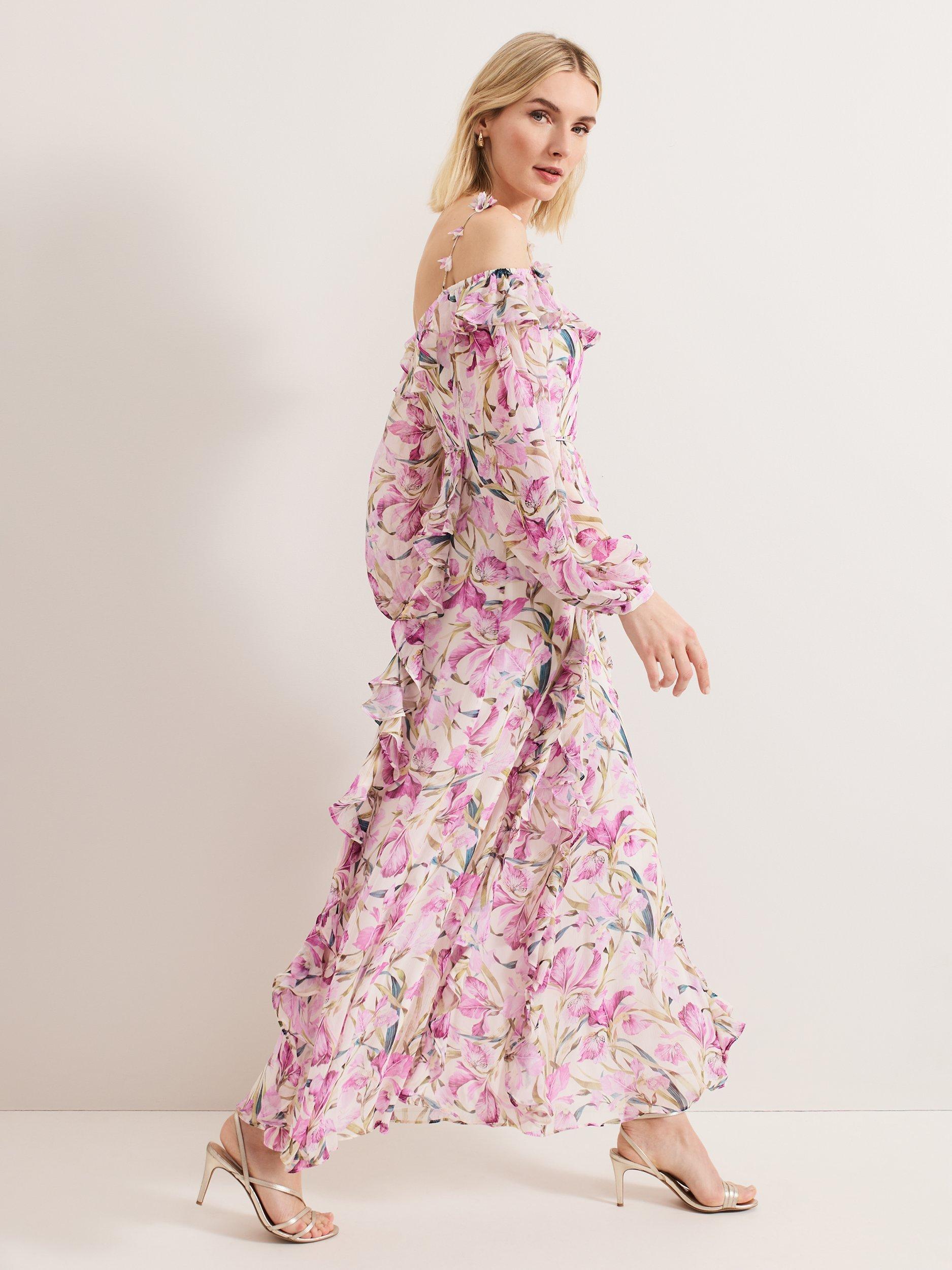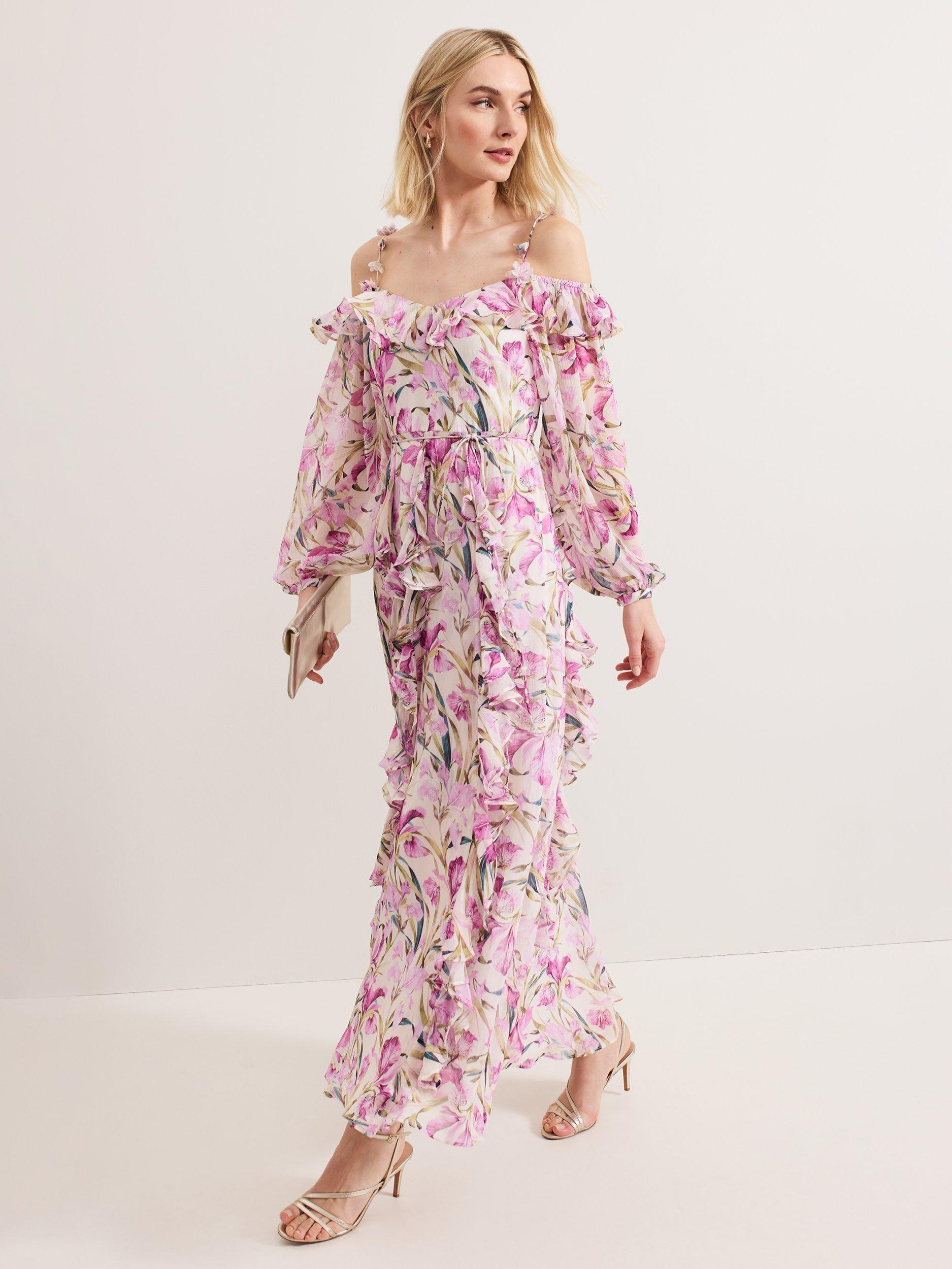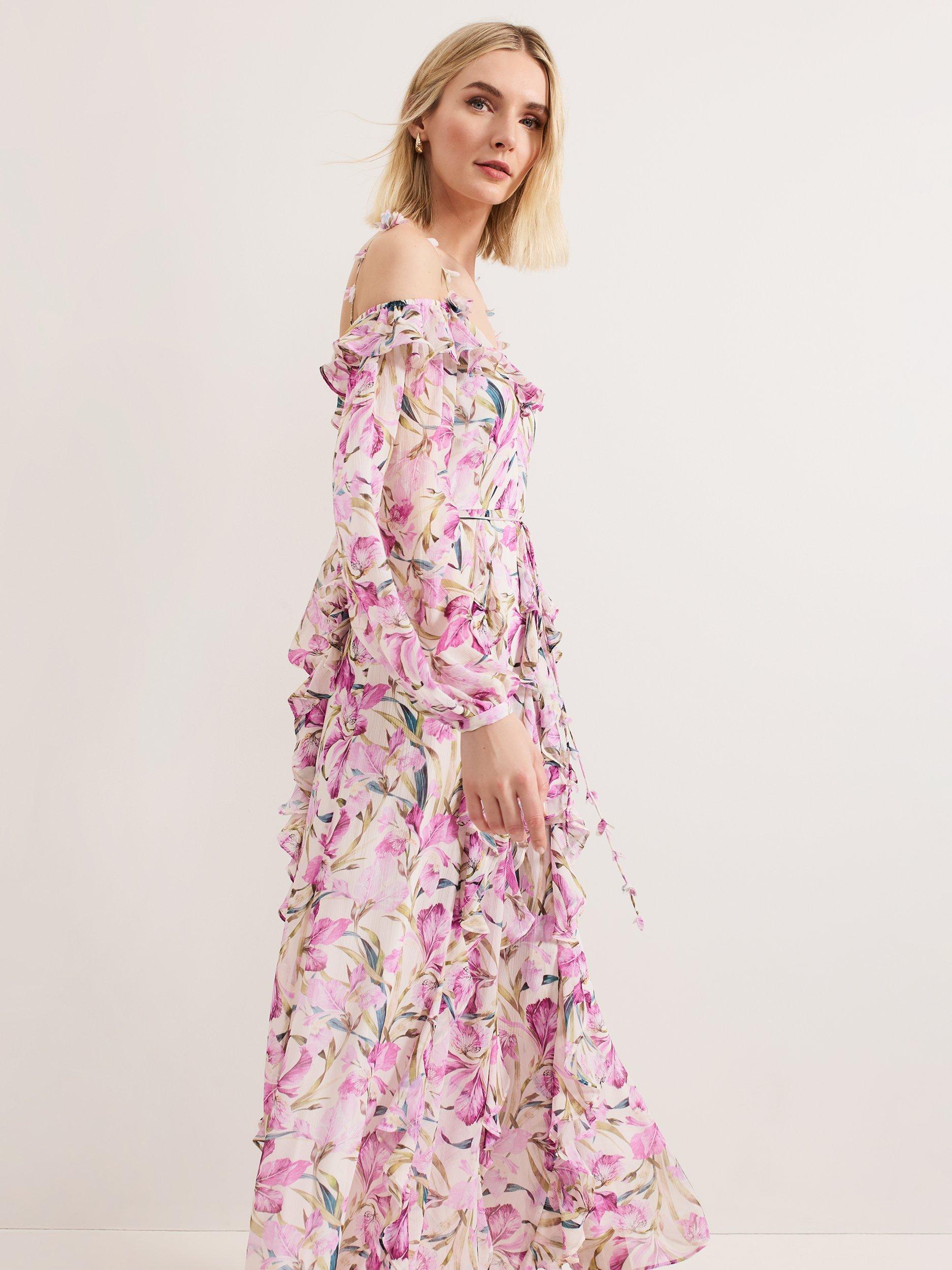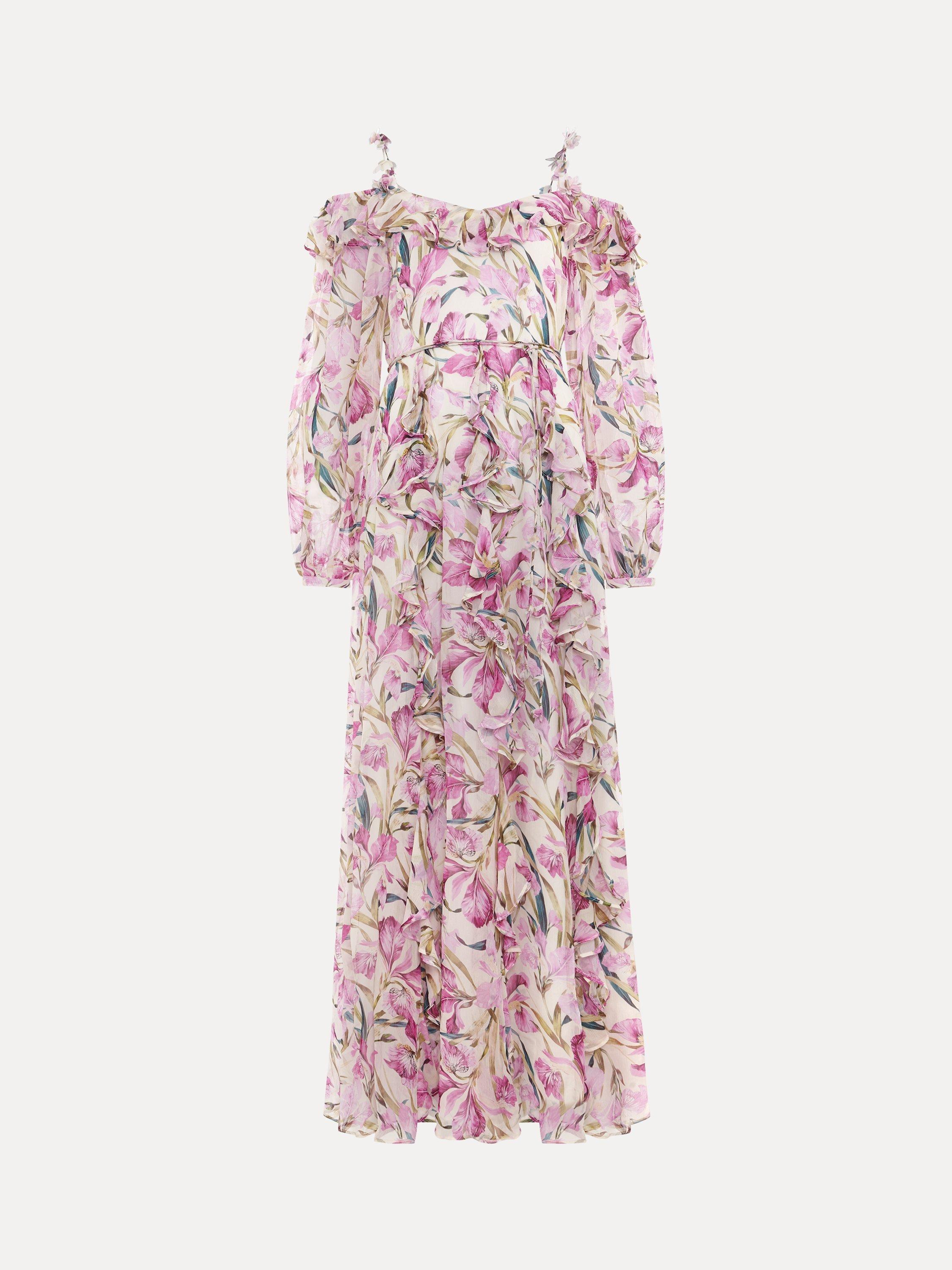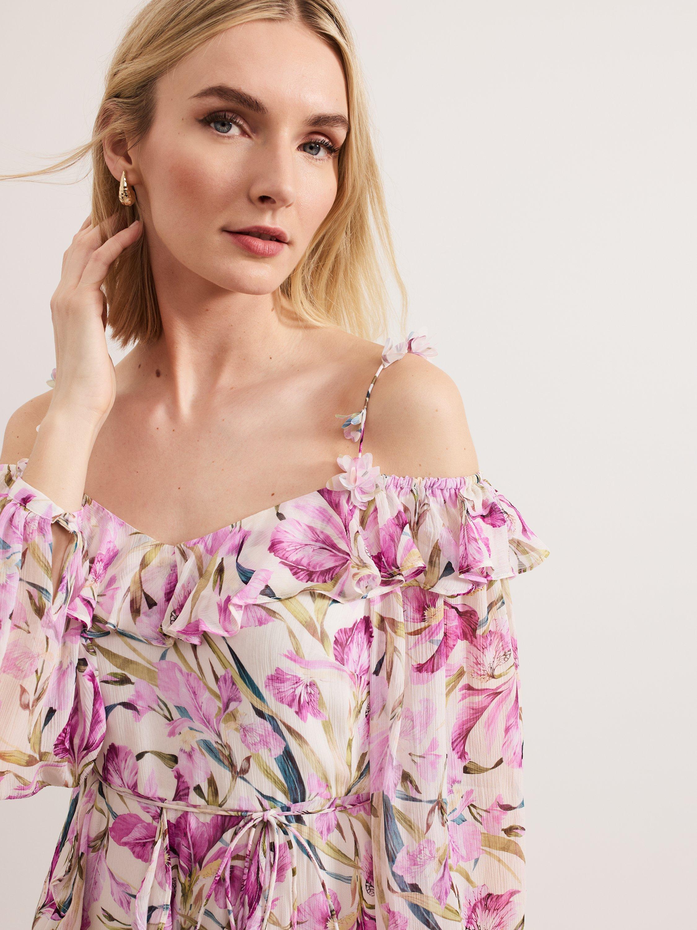 Embrace stunning florals and intricate details with the Sarah dress. With soft hues, this dress features elegant blouson sleeves and ruffle detailing throughout that adds dimension and texture to the maxi silhouette. Finished with delicate shoulder straps and decorated with floral appliques, this style is guaranteed to turn heads at every event in your spring and summer calendar.