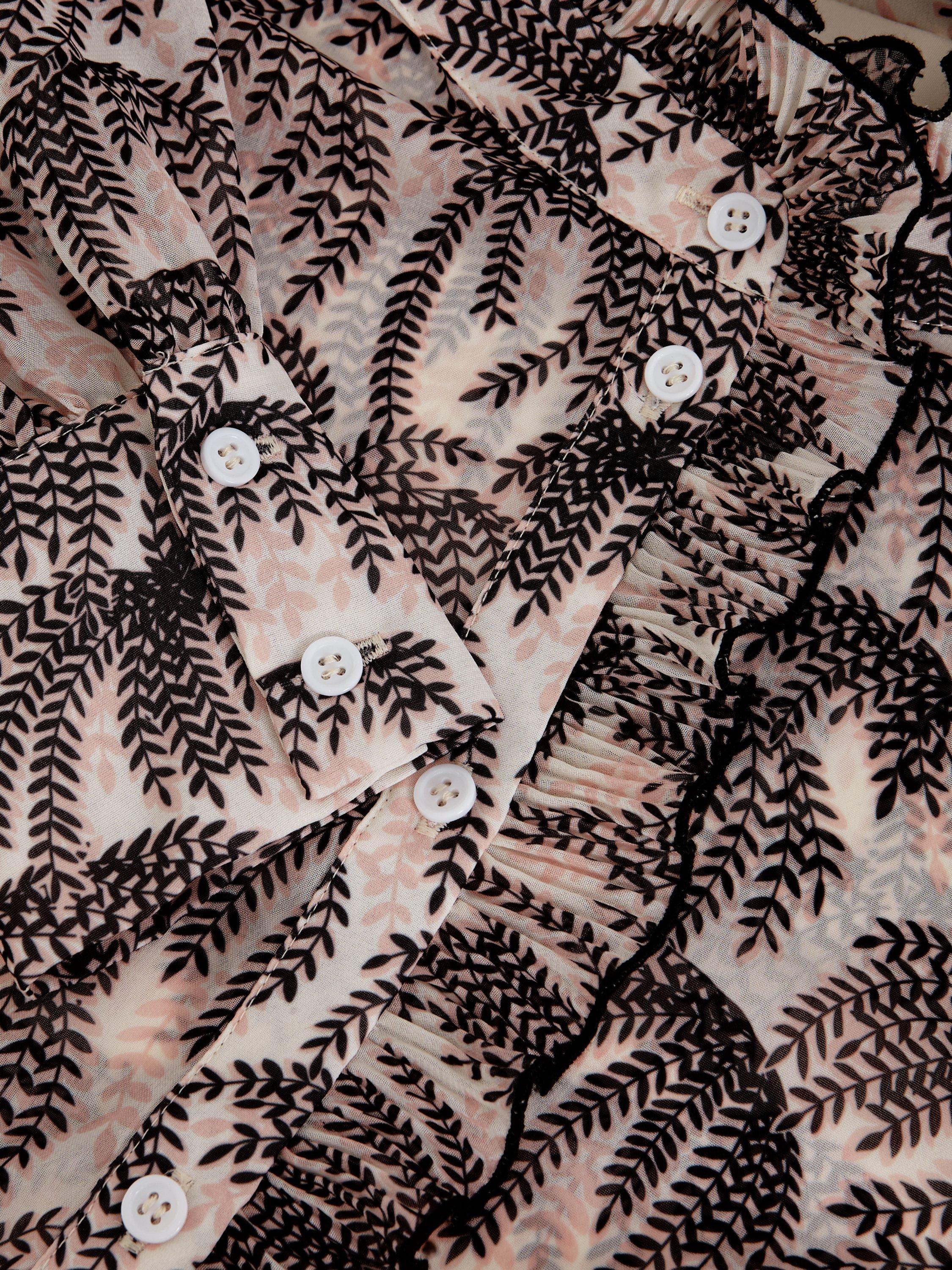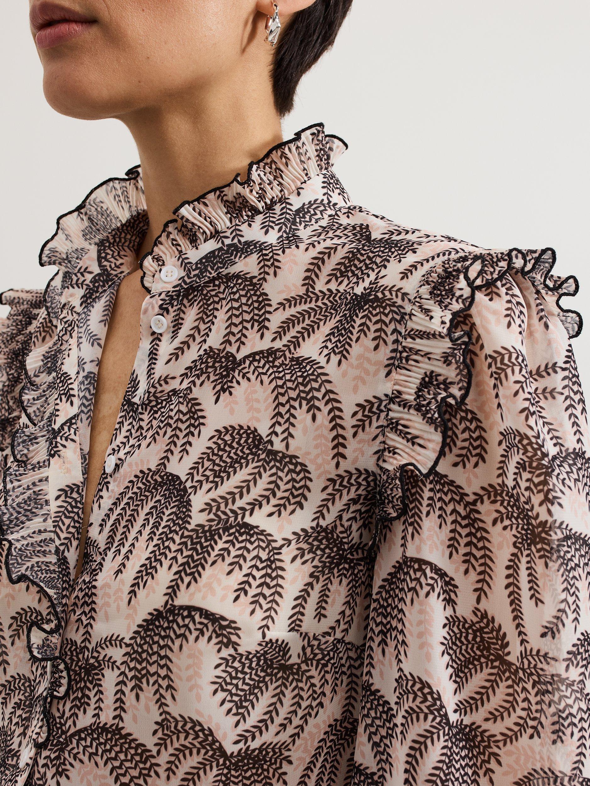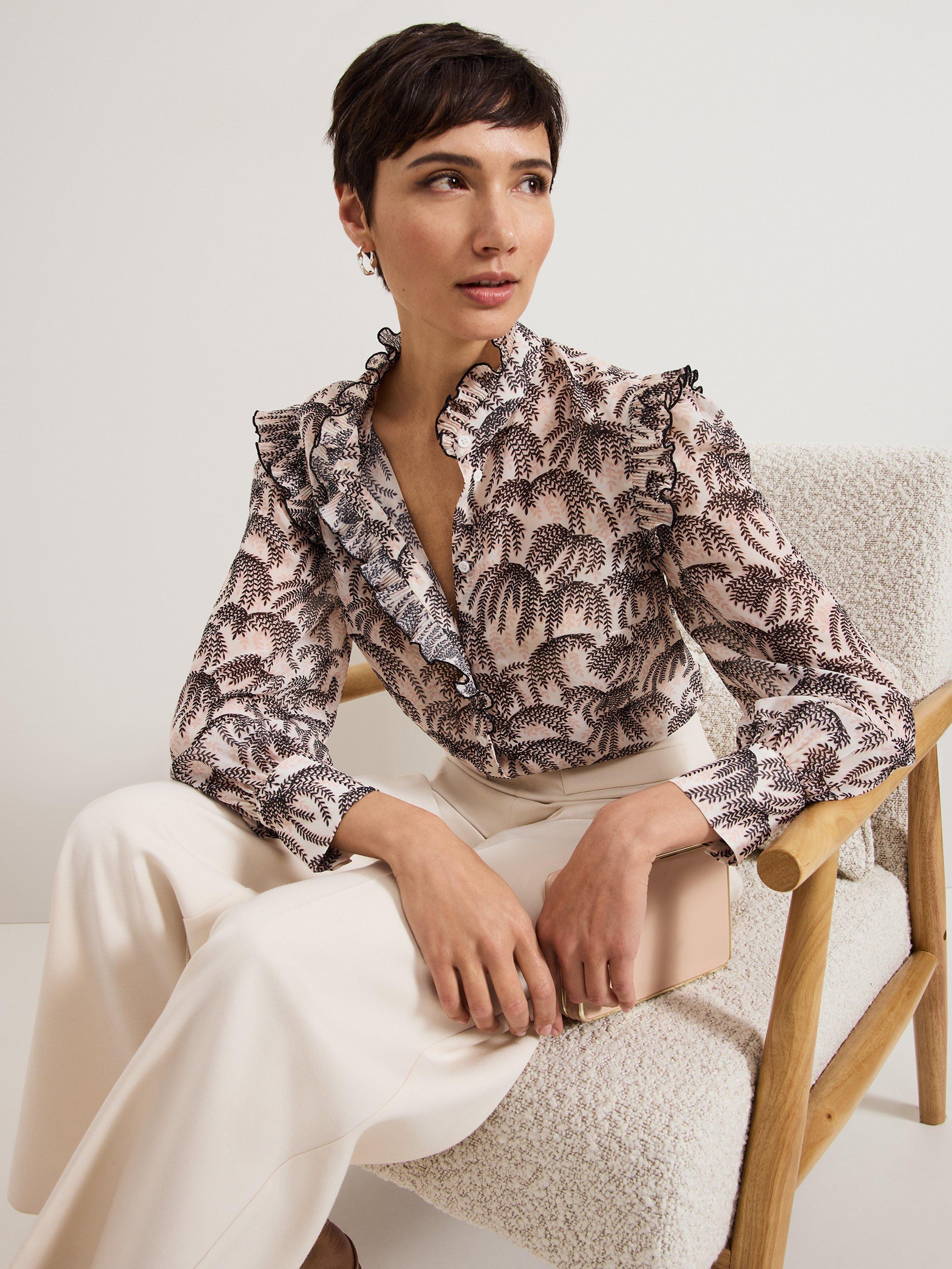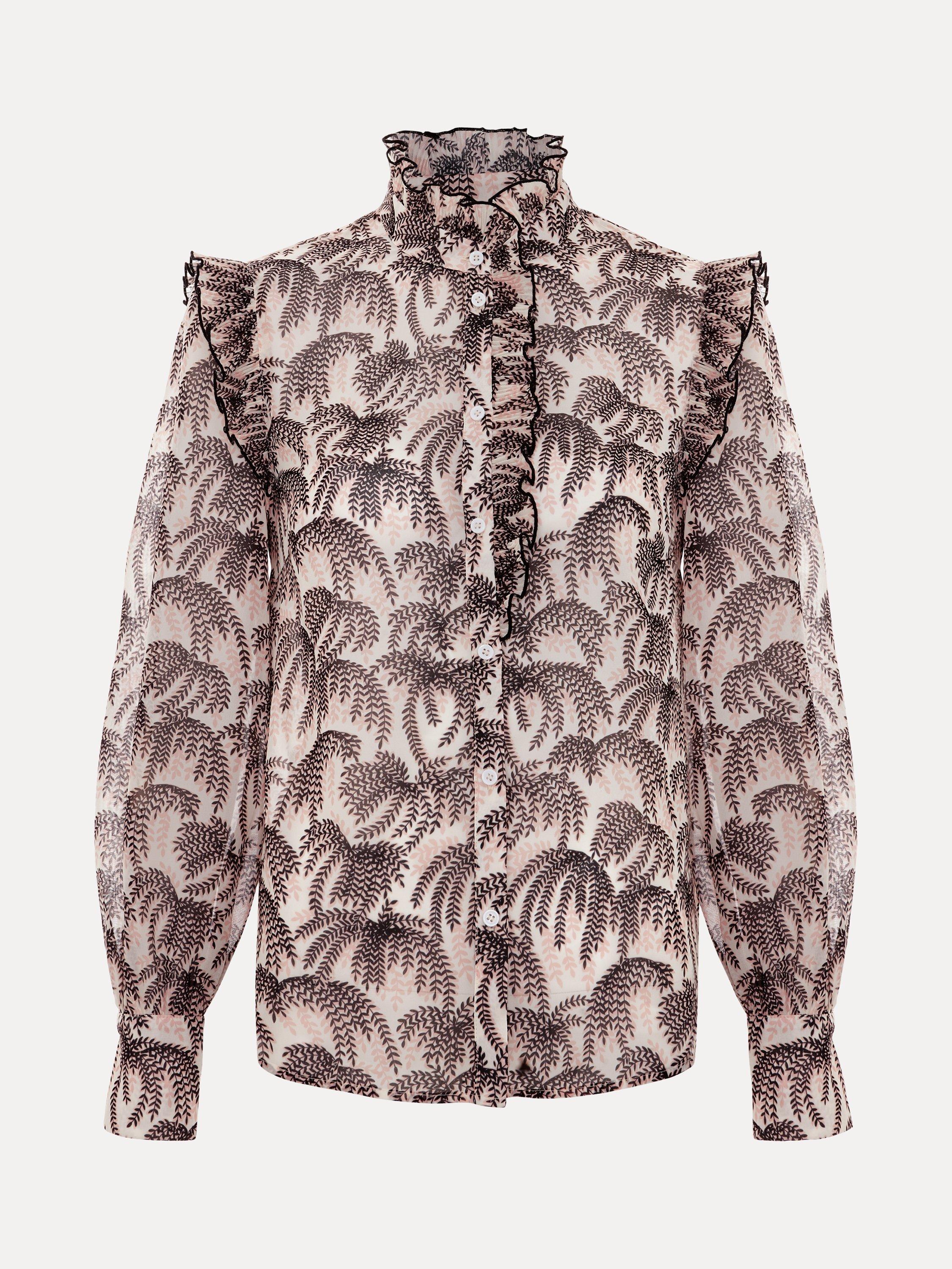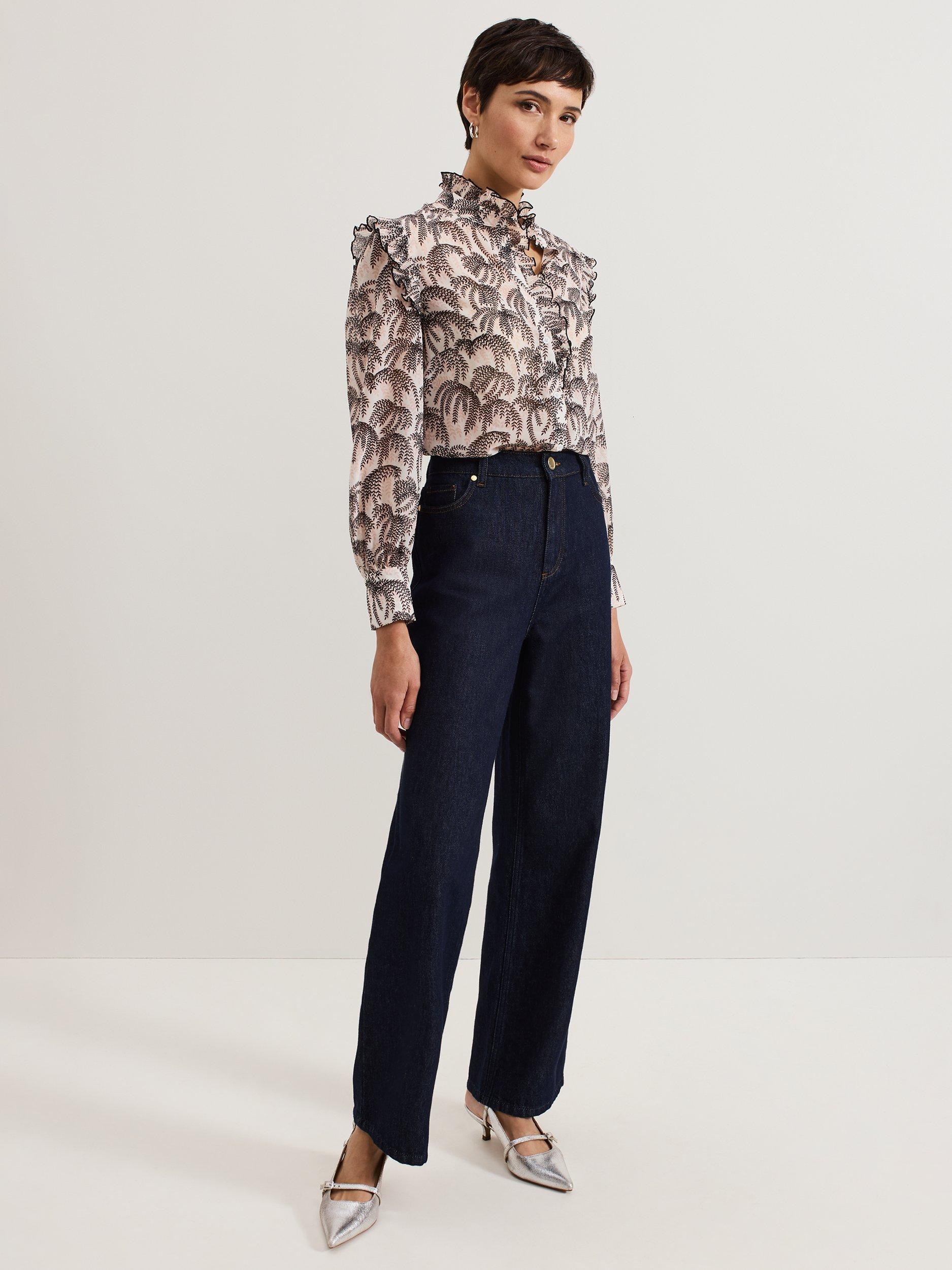 Designed with a stunning willow print, the Serena blouse adds a touch of sophistication to any outfit. Ruffle detailing at the neckline and sleeves adds a feminine touch whilst the cinched cuffs create a blouson sleeve effect. For an effortless evening look we pair ours with our favourite denim and kitten heels.