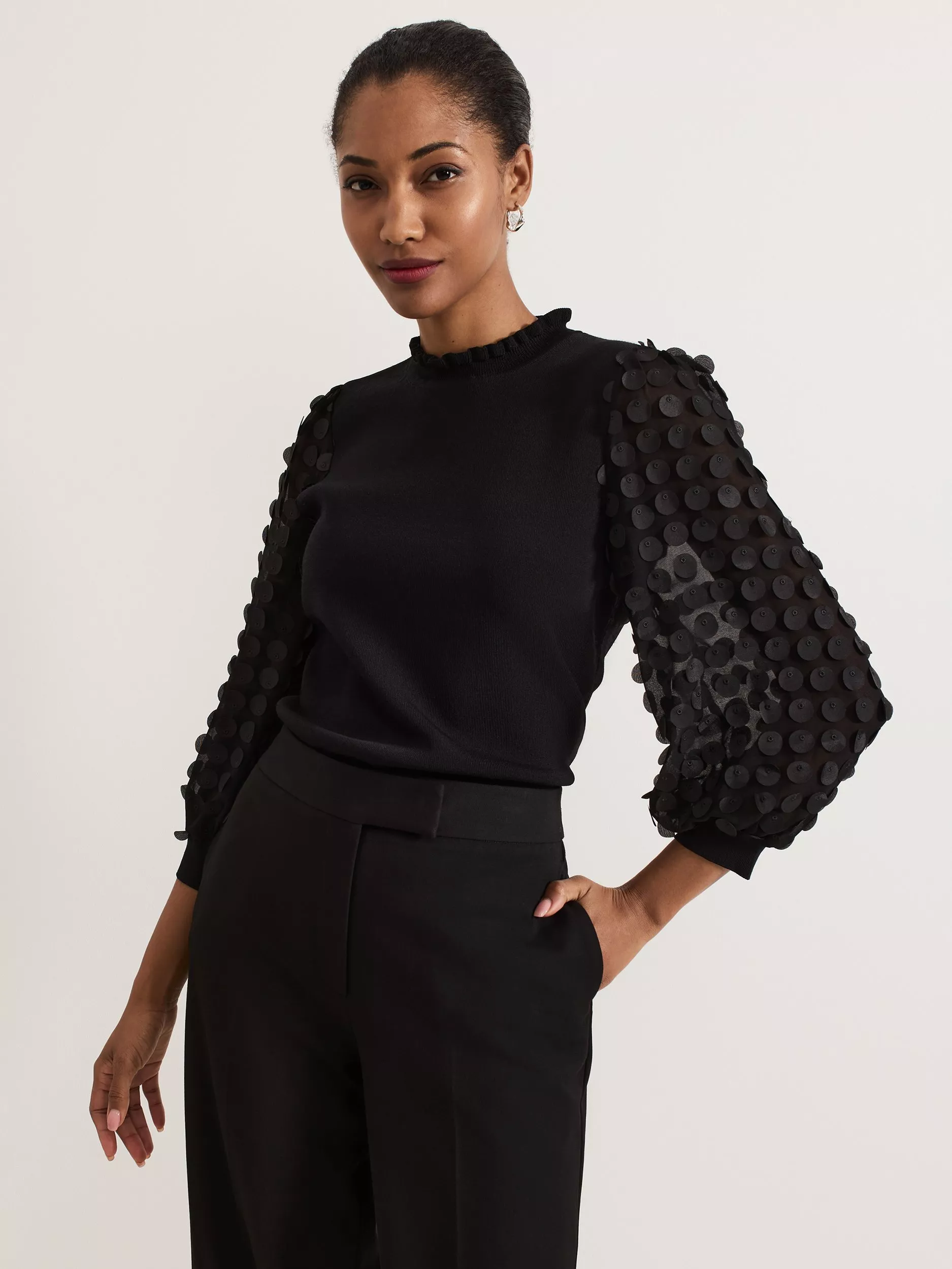 It's the circle applique detailing on the three-quarter length puff sleeves of Phase Eight's Shelly top that makes it a statement style to add to your wardrobe. With a feminine frilled neckline and knitted body, Phase Eight's top is cut to a straight fit and pairs perfectly with your favourite trousers for a look with wear-all-day appeal.