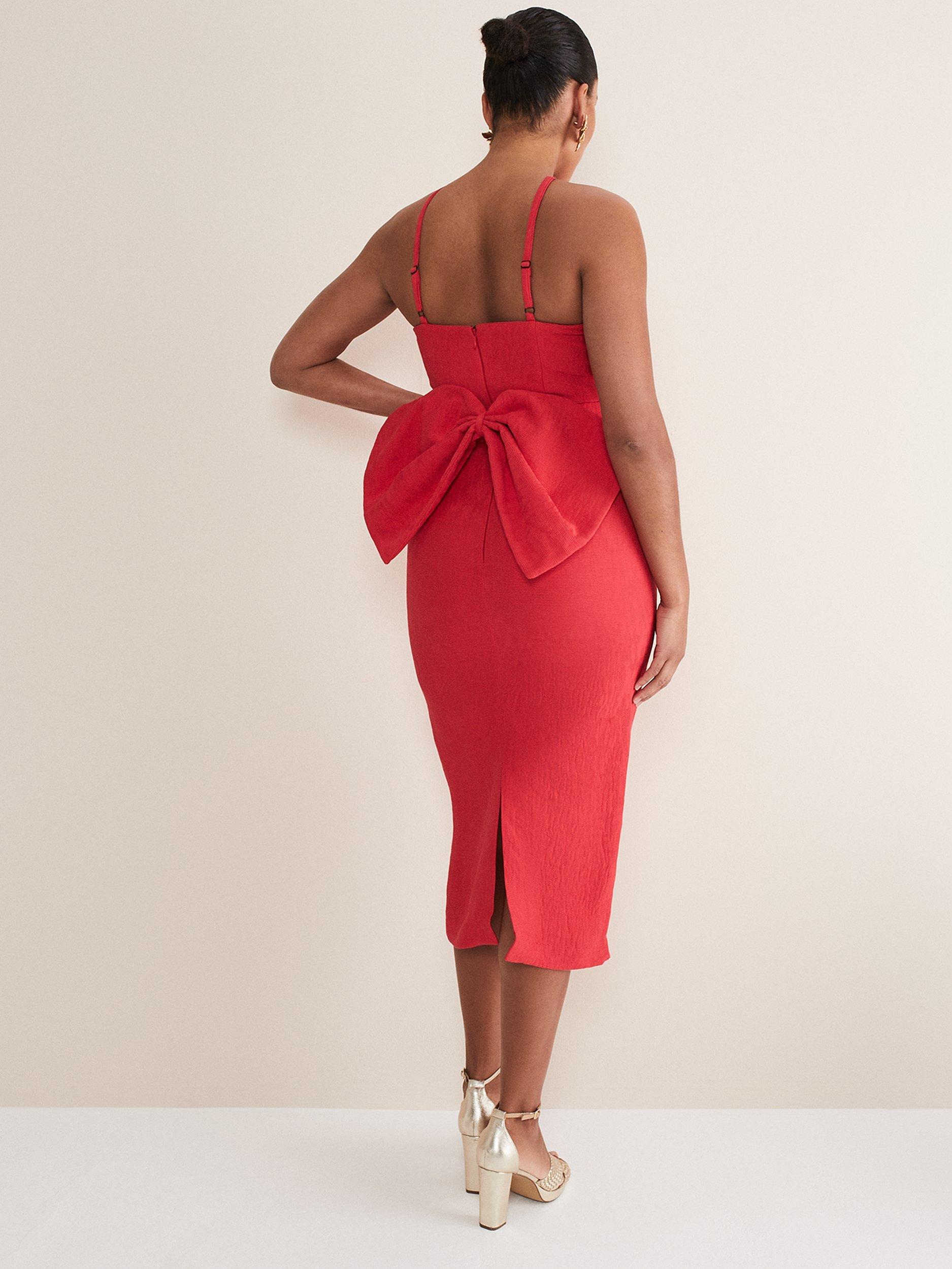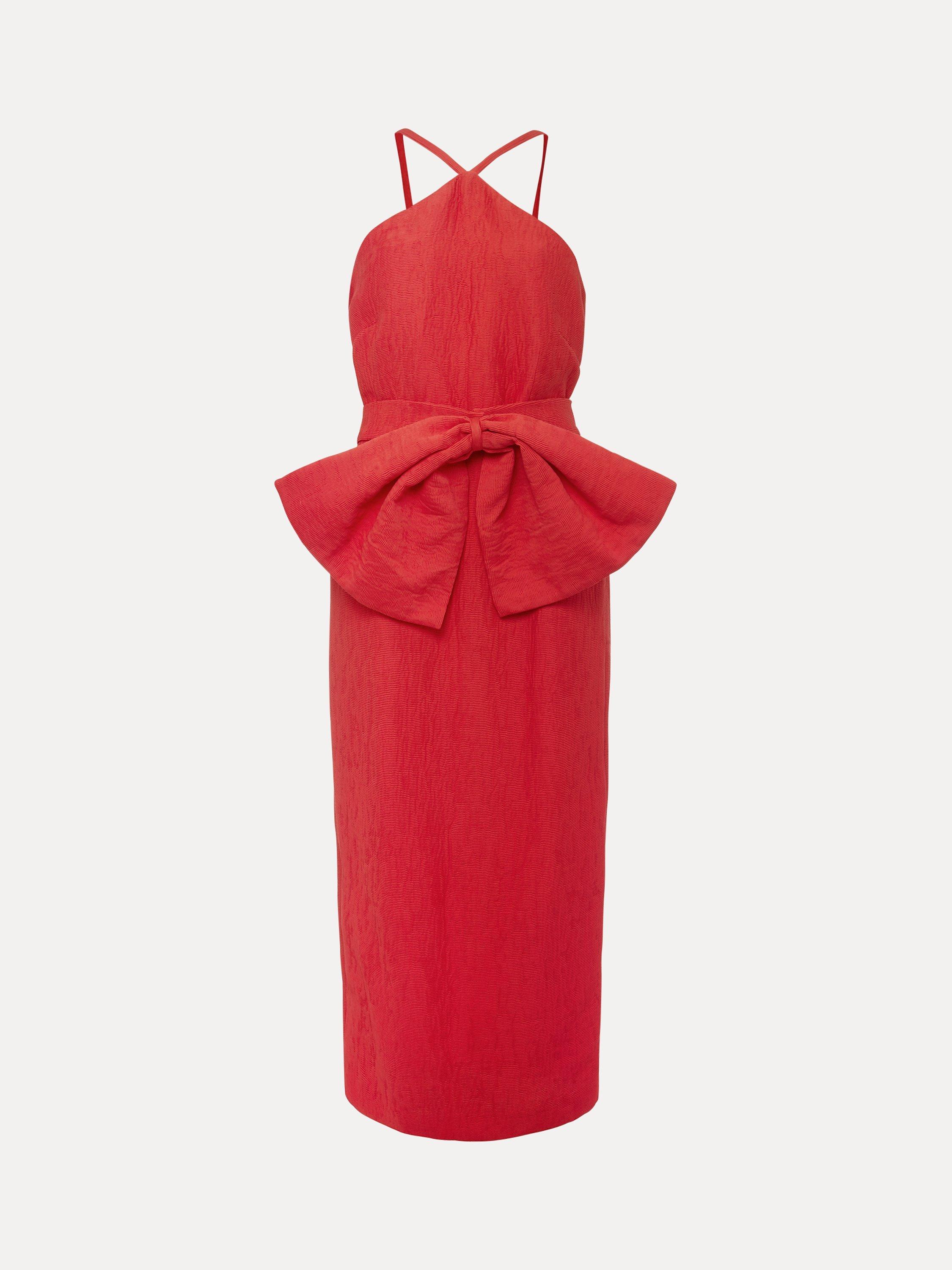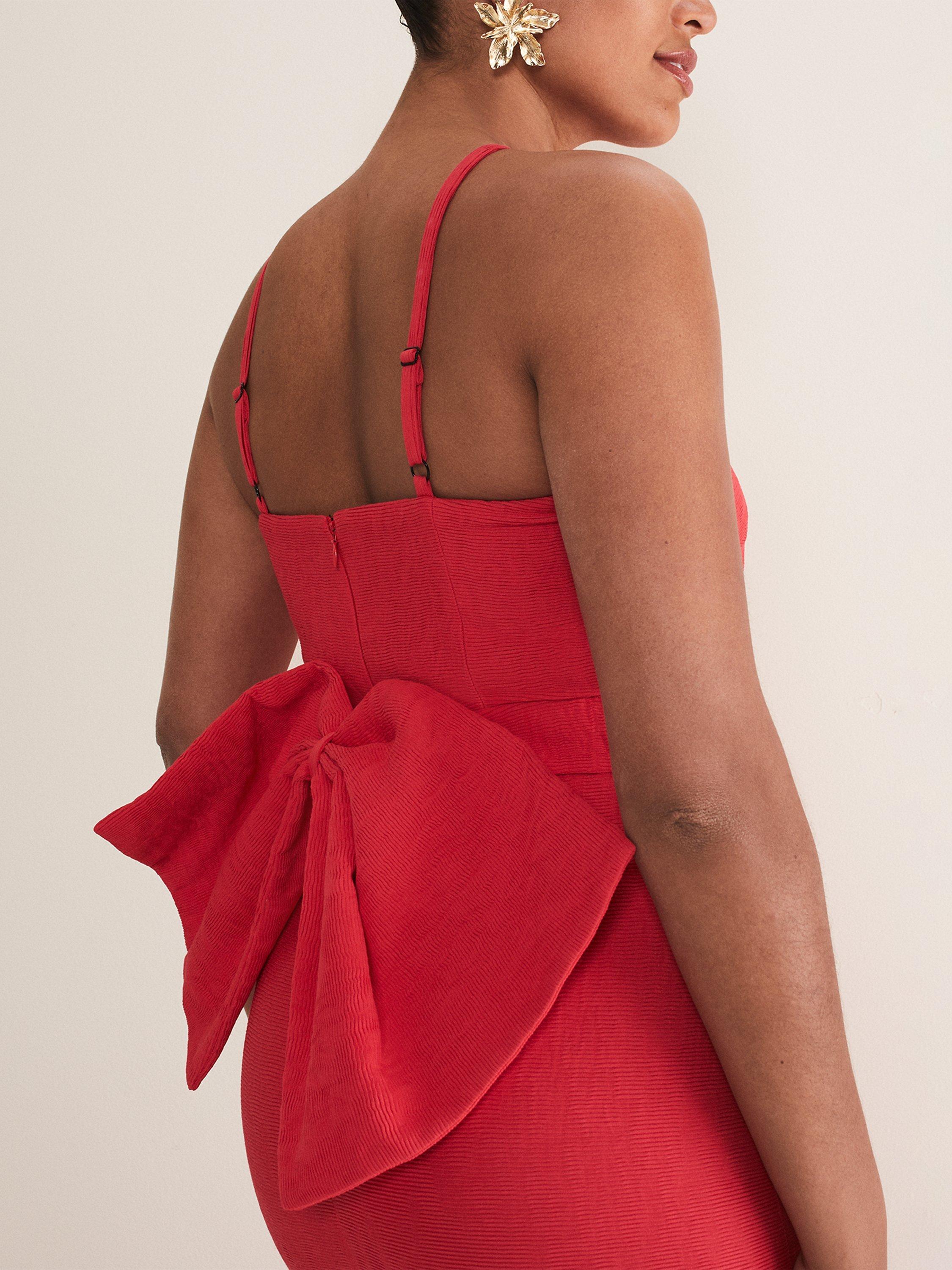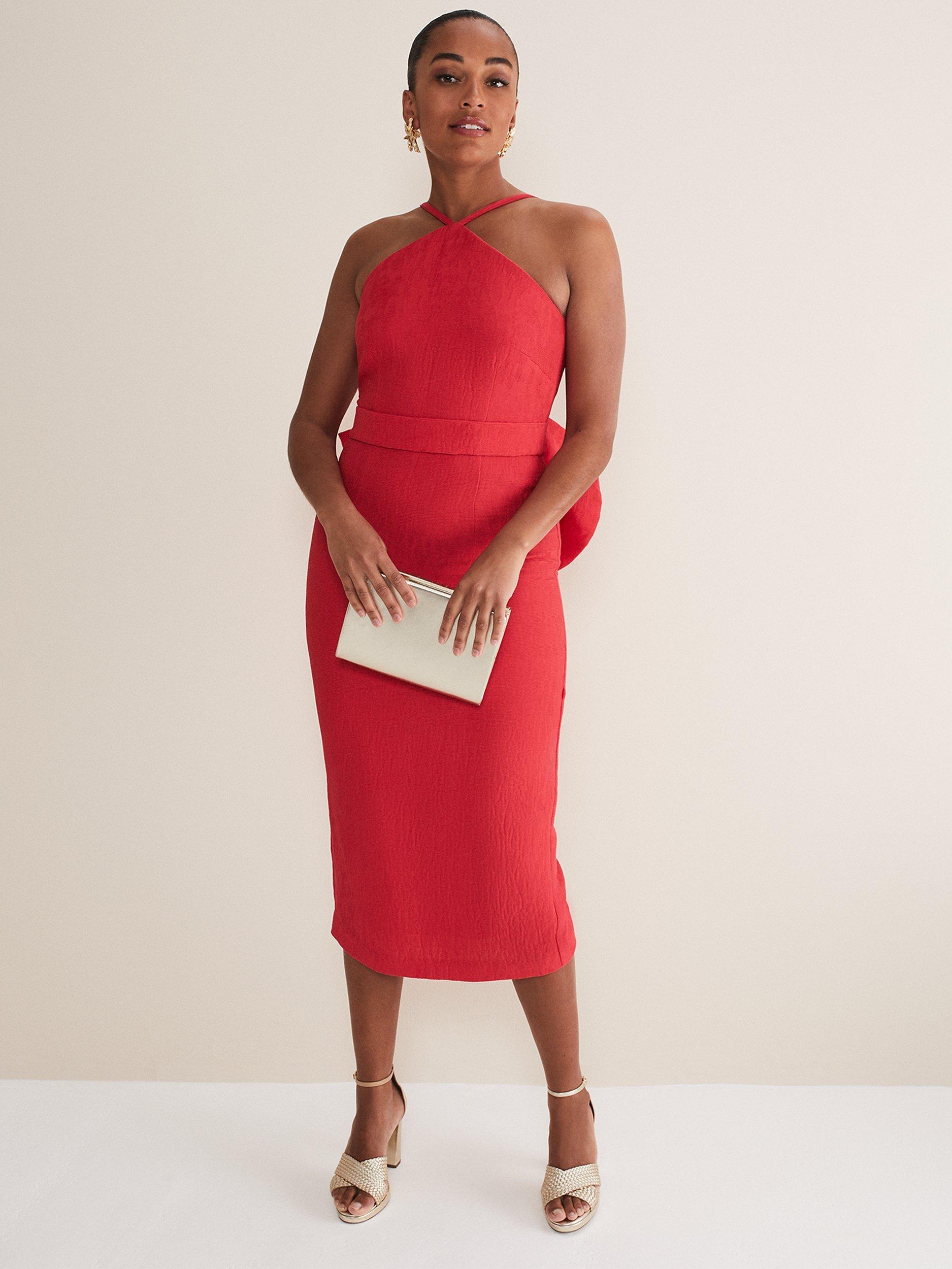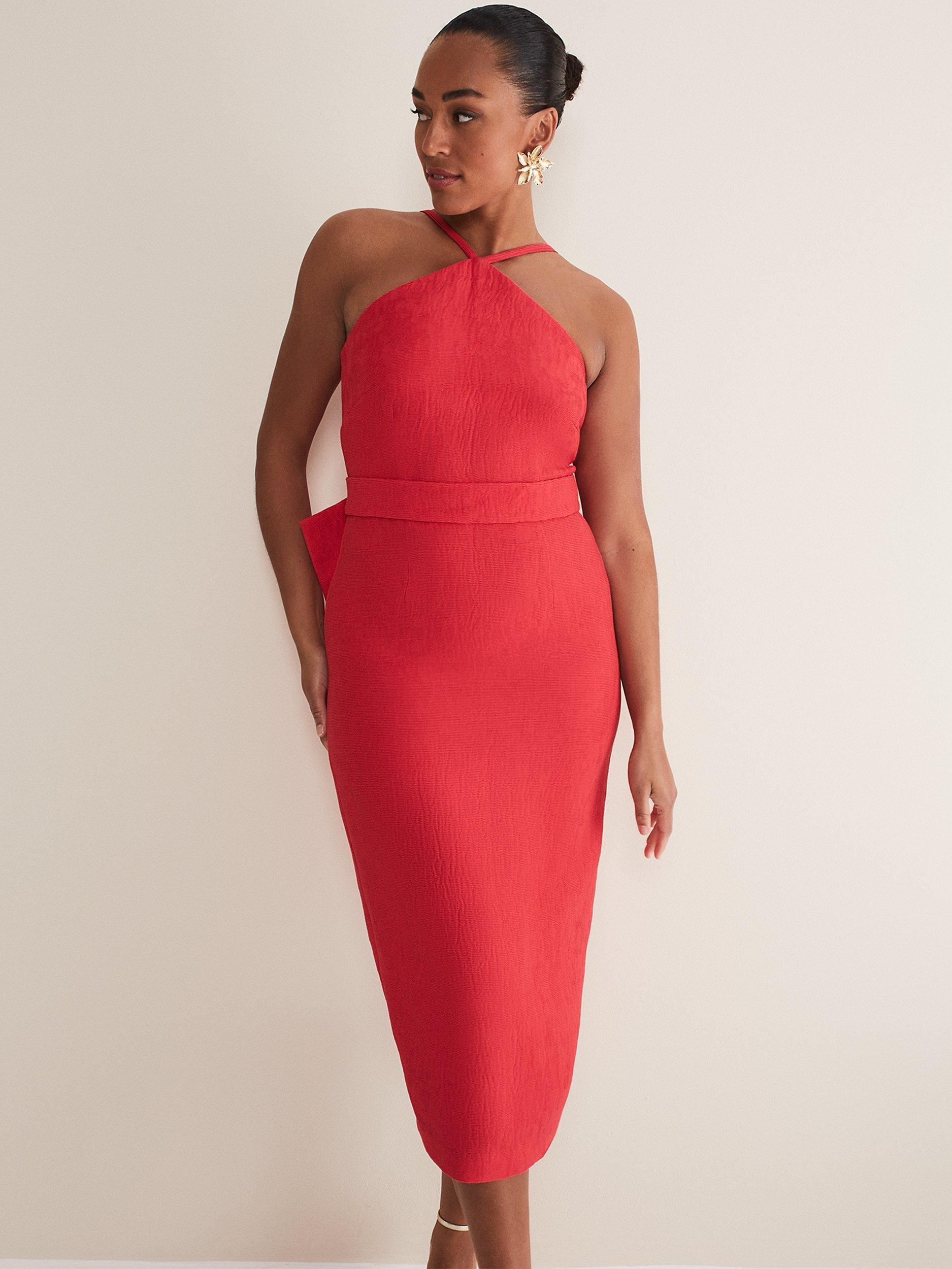 Achieve effortless elegance with this stunning dress. Designed in a stand-out red shade, the Sherani dress features a halter neck with adjustable straps and is cut to a bodycon fitted silhouette. The dress is finished with an oversized bow detail on the back adding a sophisticated feminine touch. Wear with gold accessories for a standout head-to-toe look.