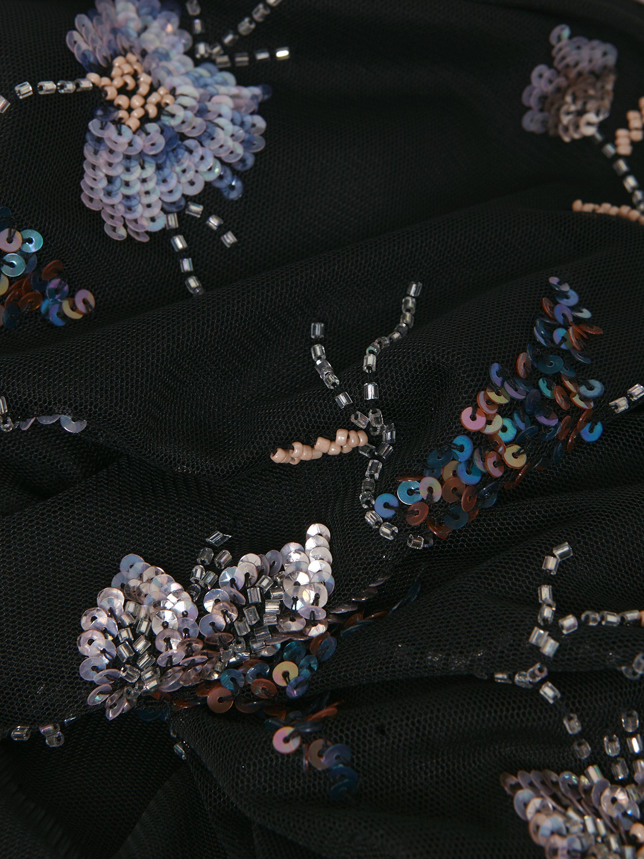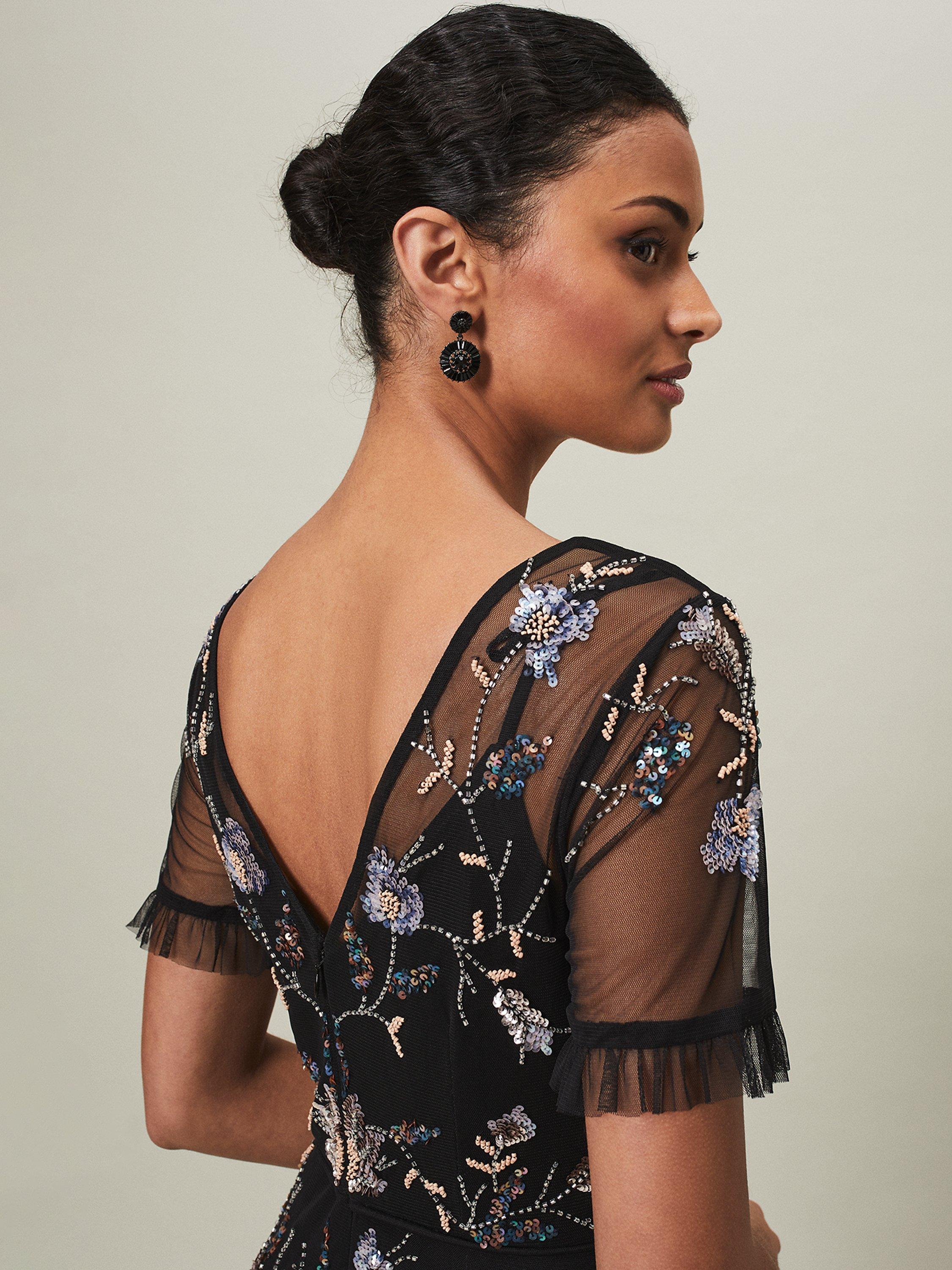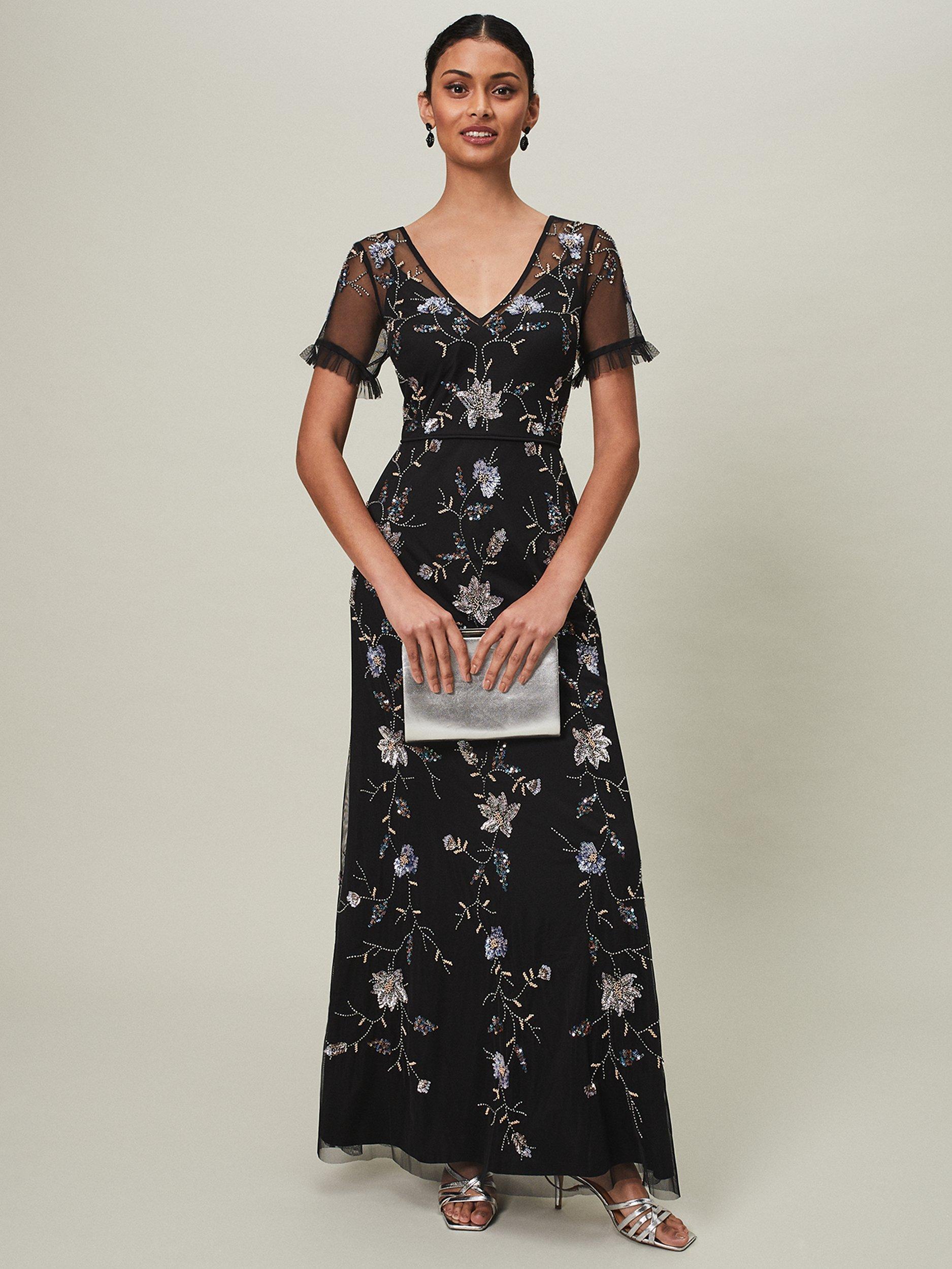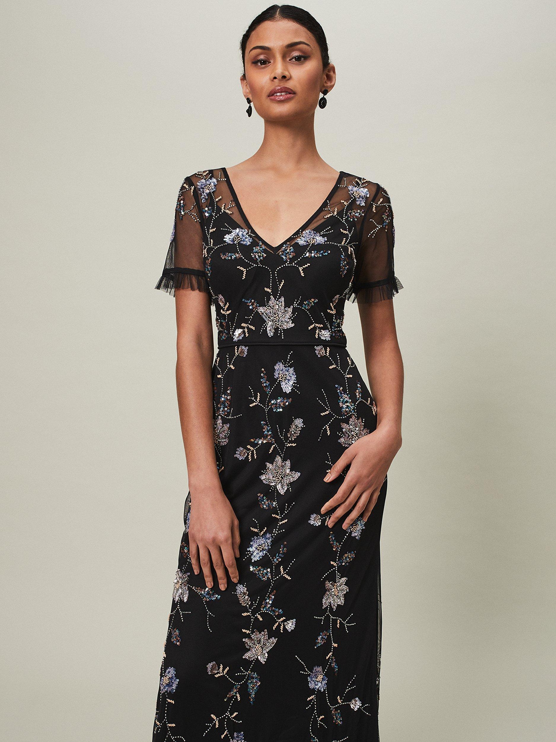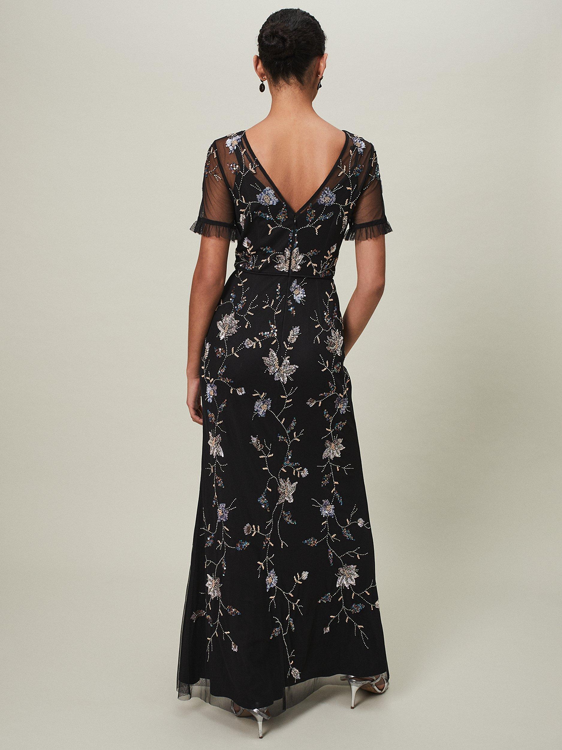 Set in a simple, A-line shape, this floor-length dress from Phase Eight comes in a fabric that's built to last. Effortlessly flattering thanks to a fuss-free v-neckline and short, sheer sleeves with frill, this style features a sequin floral embroidery.