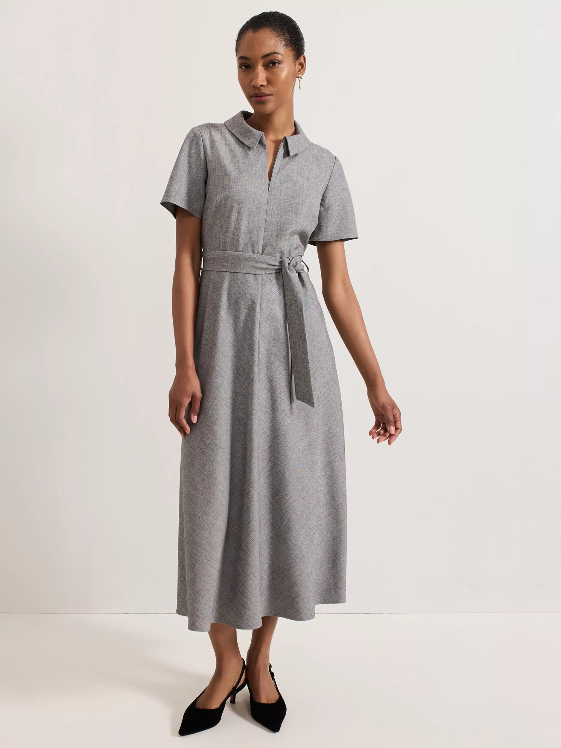 Designed in a classic shade, the Silvia dress from Phase Eight features a classic collar, short sleeves and zip front detailing for versatile styling options. The matching tie belt highlights the waist, falling to a midi length skirt to create a contemporary feminine style.